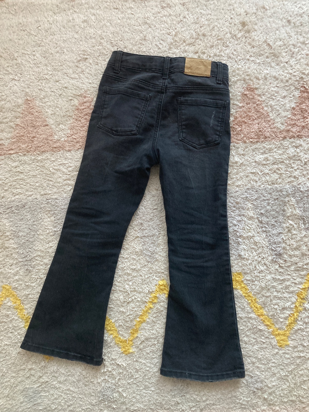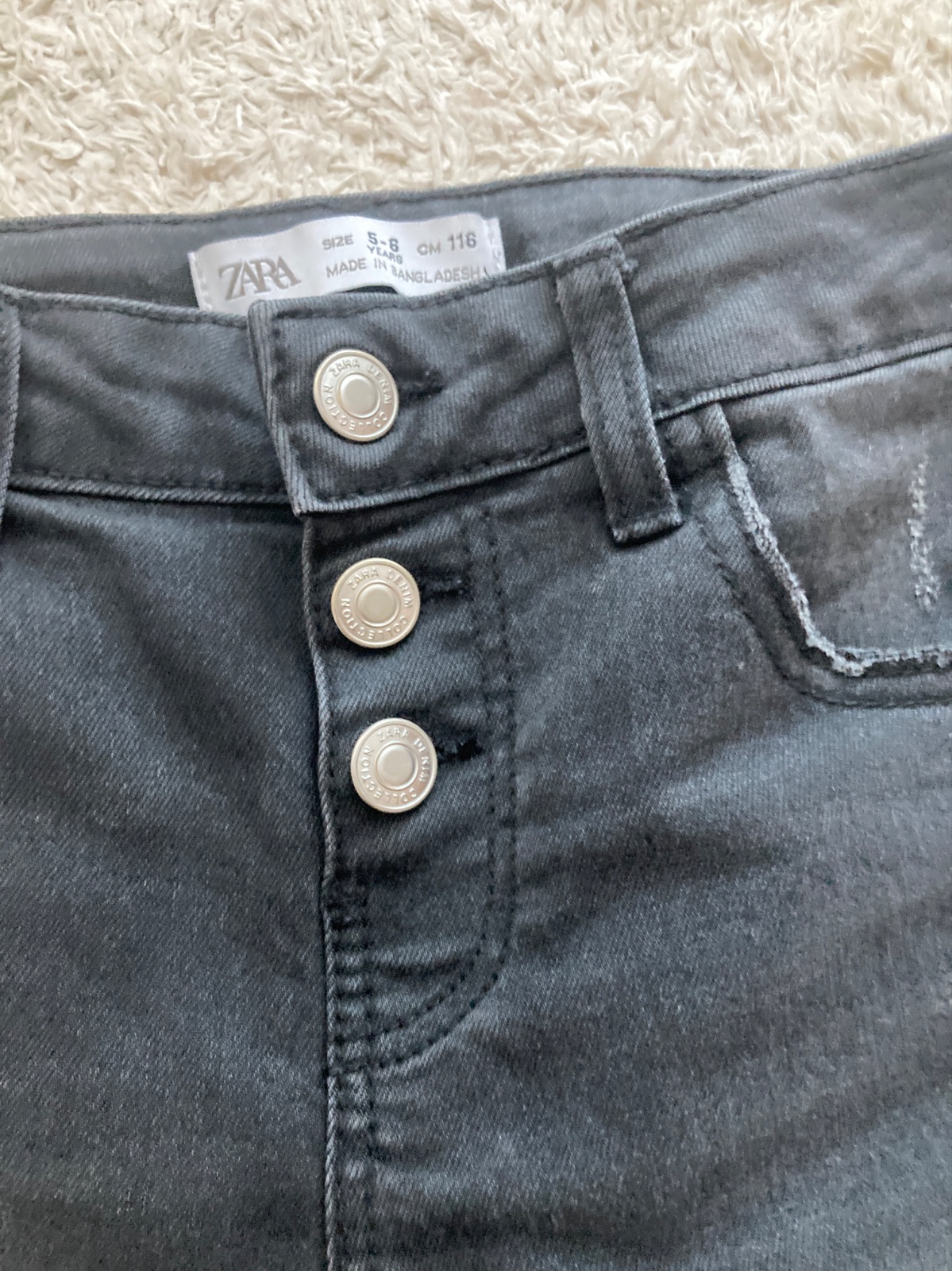 Ponukam na predaj džínsy Zara. Flared strih, dole mierne rozšírené. Čierna farba. Ako sedia vid posledna foto. Regulácia v pase + vpredu zapínanie na gombíky, ktoré sa do seba zatlačia. Nosene príležitostne, ako nové. Visacka udava velkost 116, podľa mňa sedia na 110, ako 116 sú už na môj vkus krátke akebo sa ešte dajú ponosiť napr k zimným vyšším topánkam.