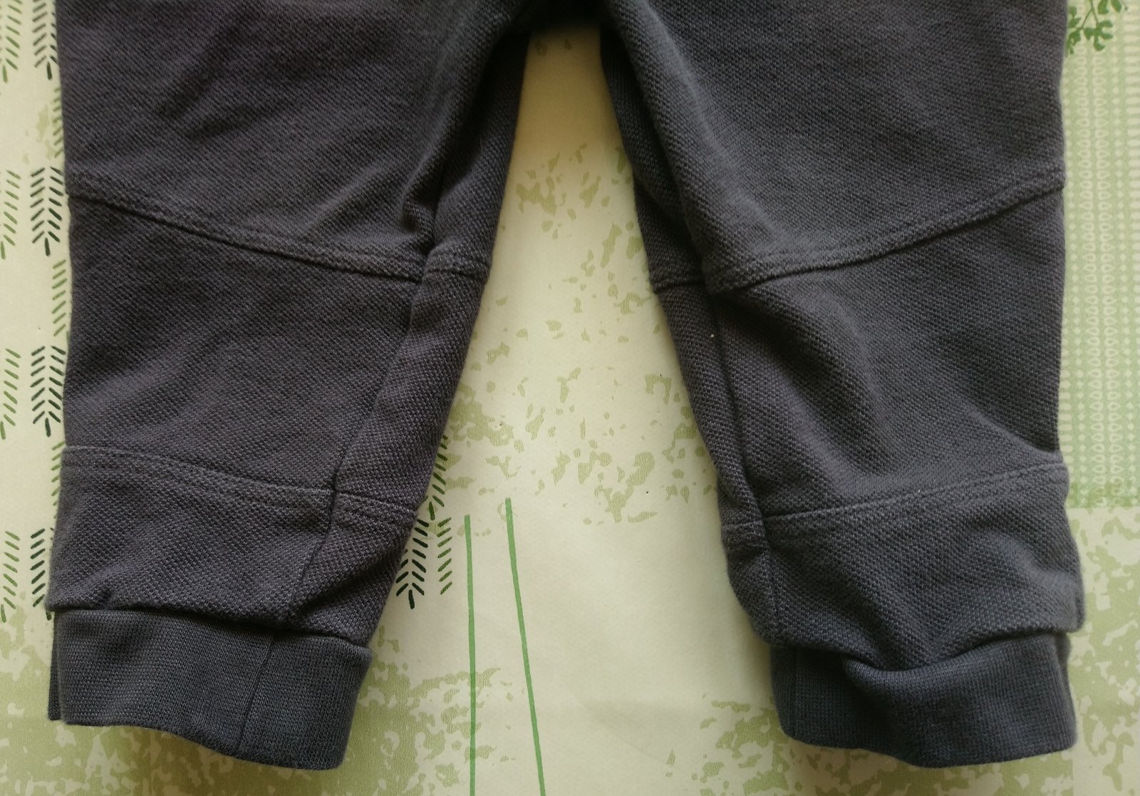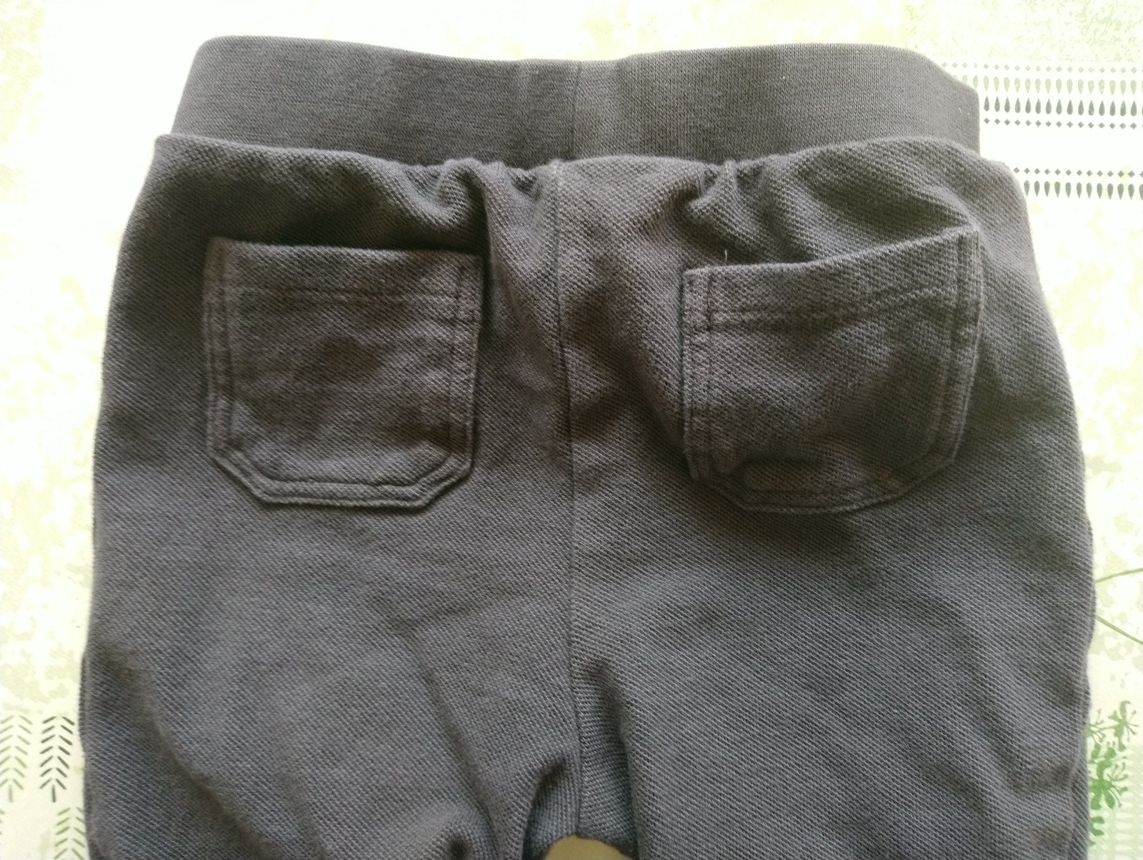 detské sivočierne tepláčiky v páse na gumu + ozdobná šnúrka, dole patent, vrecko vzadu, nie sú hrubé,