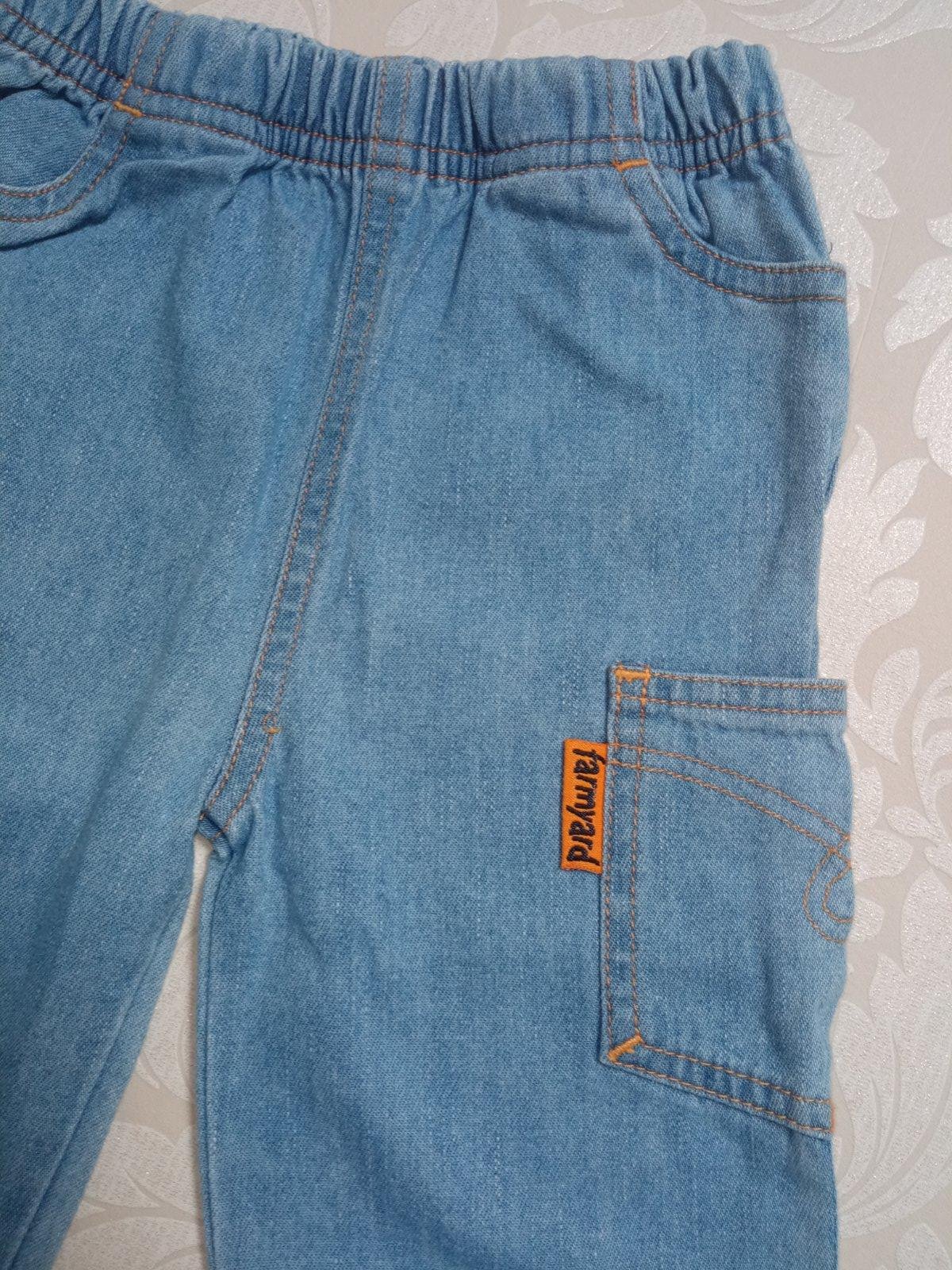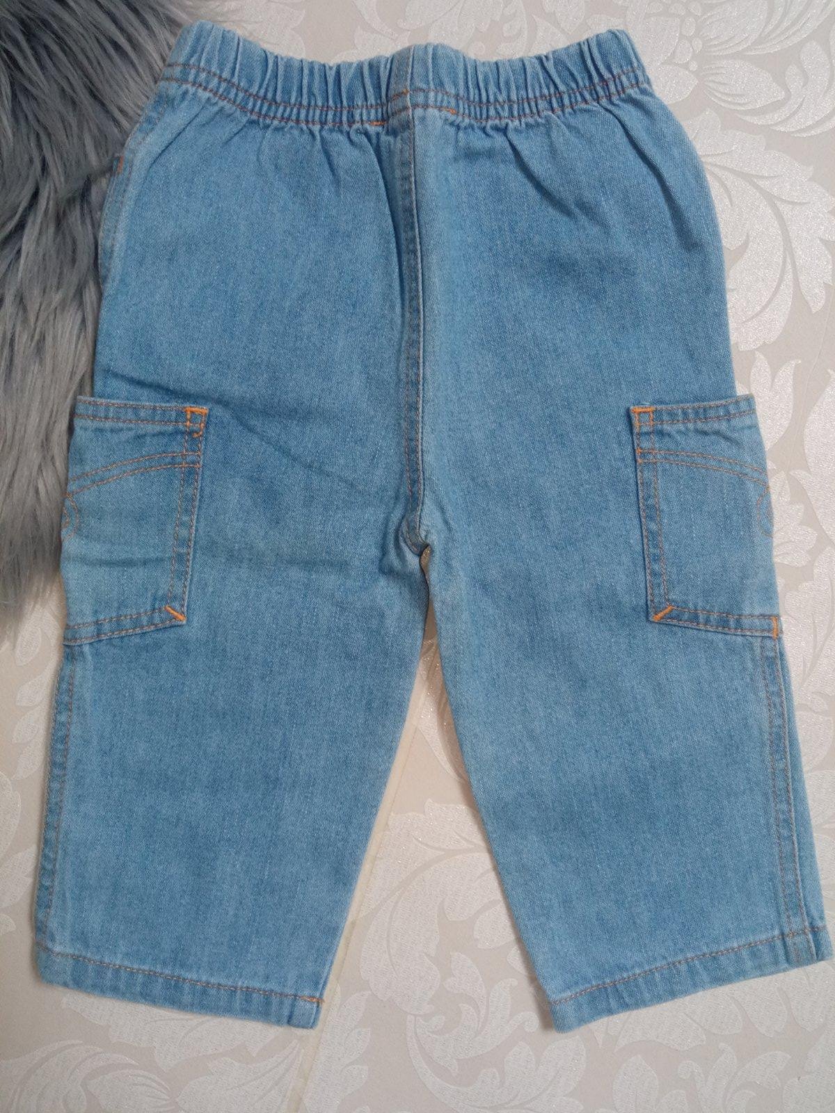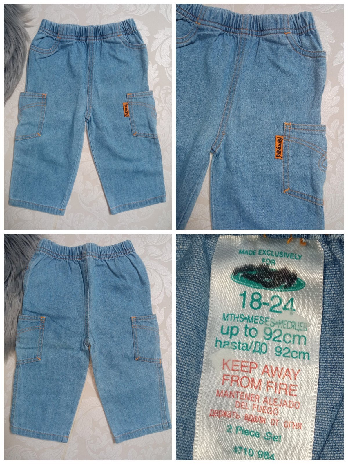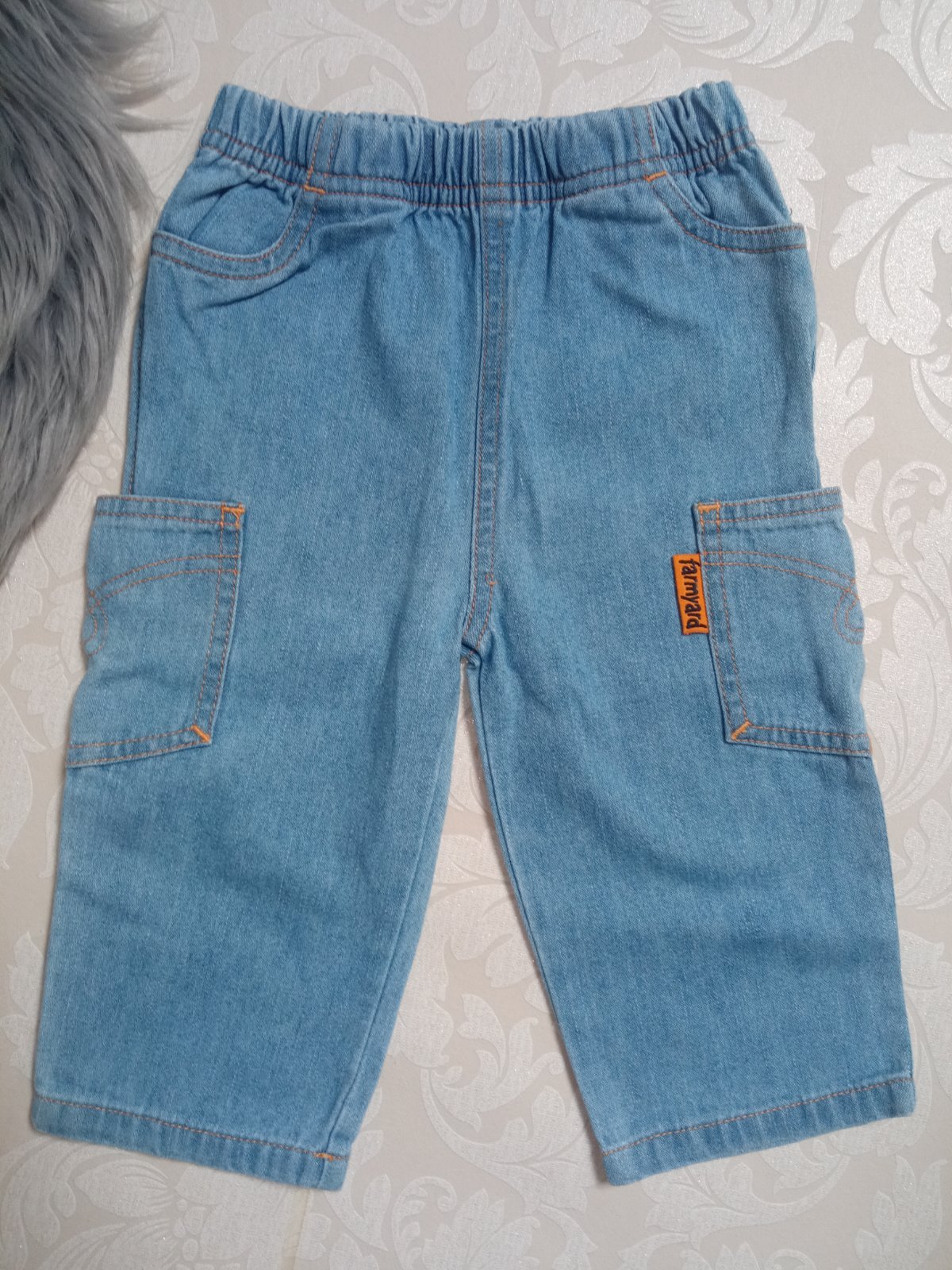 Chlapčenské rifle. Tenké. Pás na gumu. Dve bočné vrecká a dve na kolenách. Materiál: 100%bavlna. Veľkosť: 92 (pre 18-24mes.).