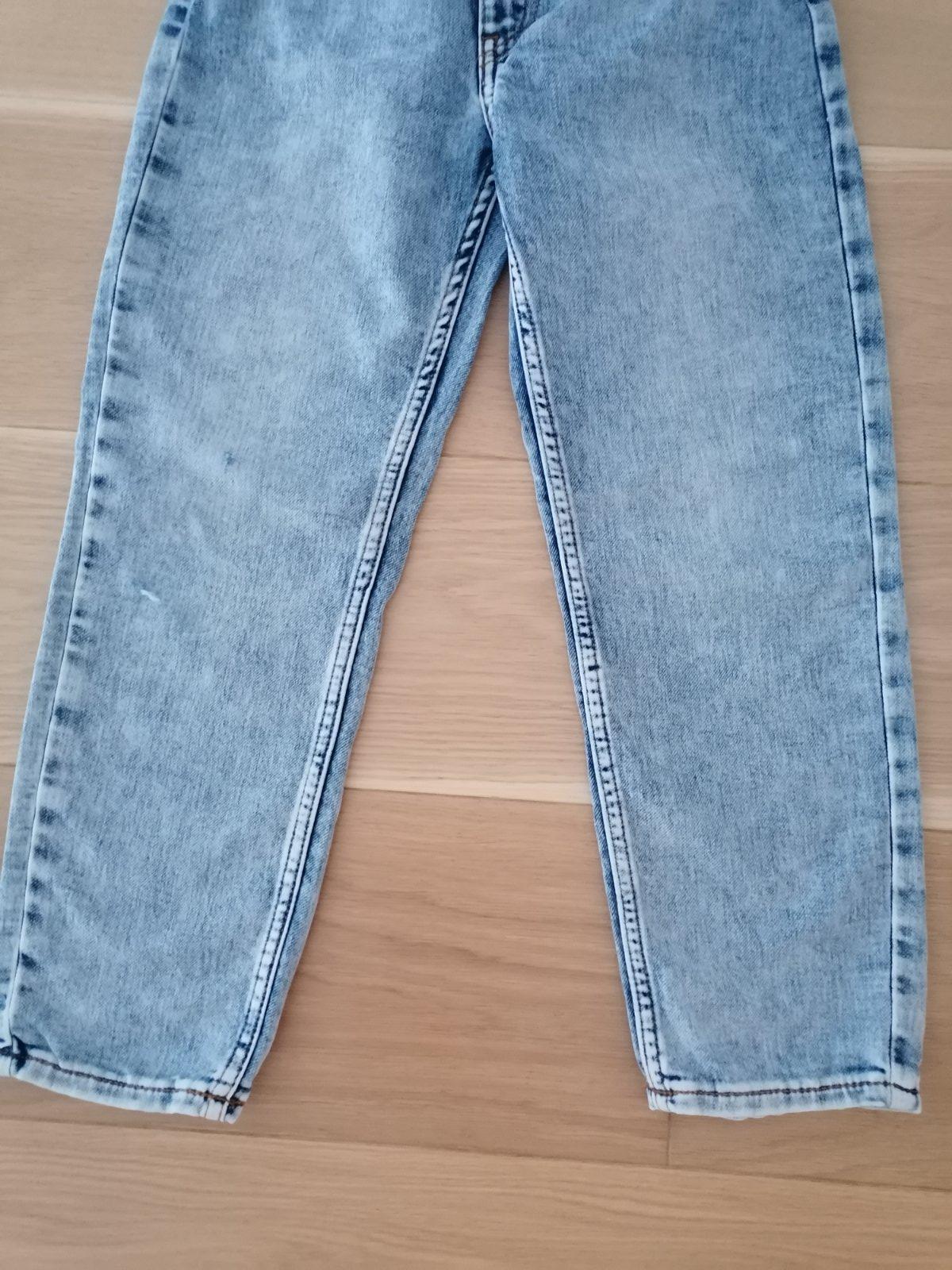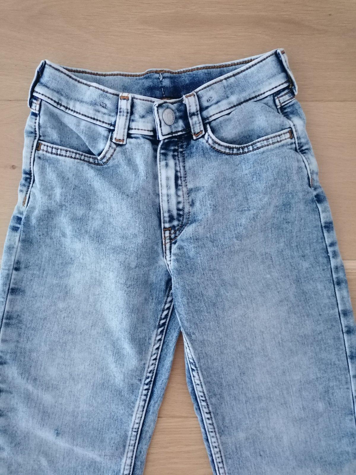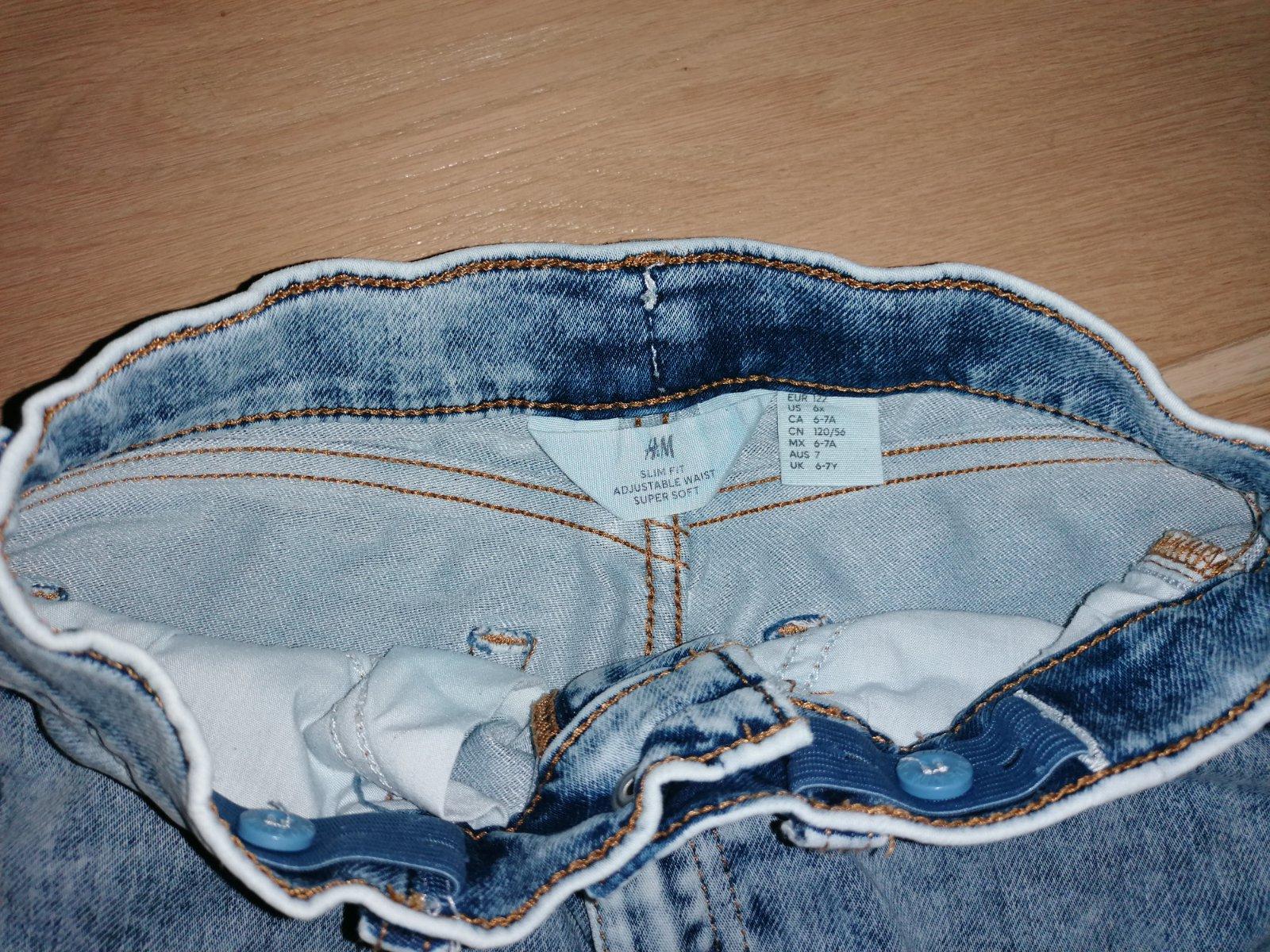 Rifle zn. H&M veľ. 122, 79% bavlna, 20% polyester, 1% elastan, zapínanie na zips a gombík, v páse regulácia gumičkami, vpredu aj vzadu vrecká.