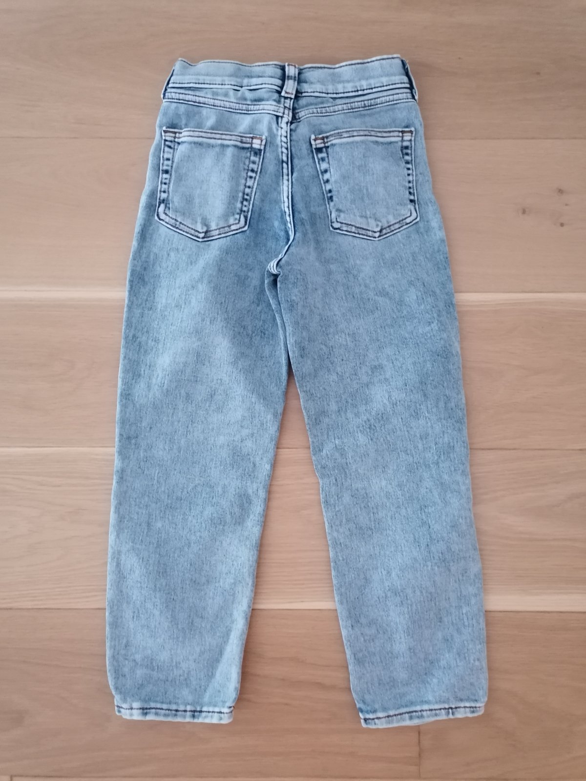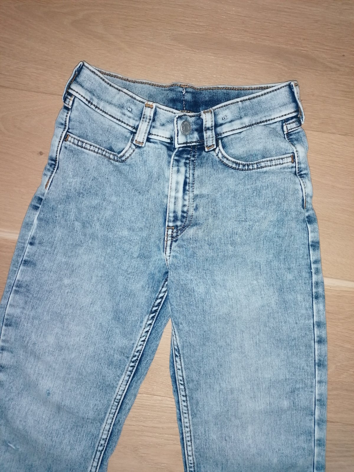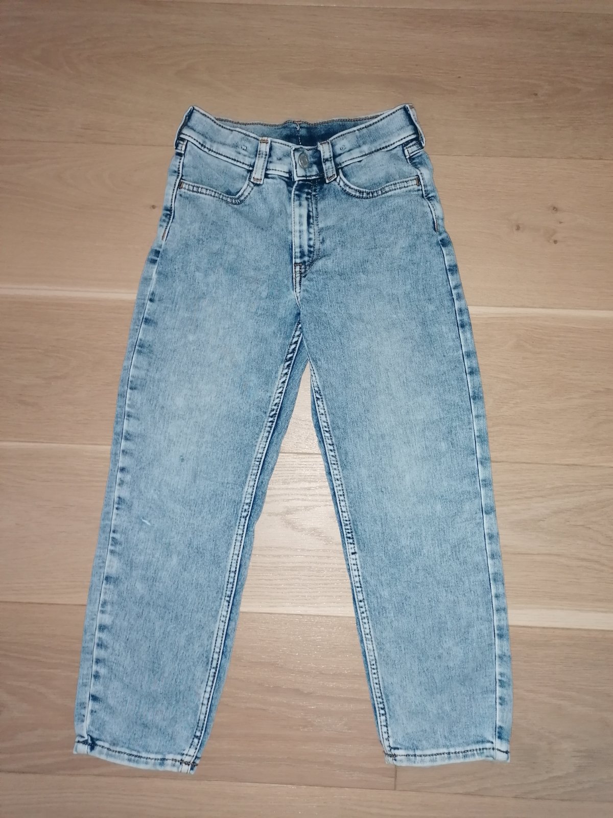 Rifle zn. H&M veľ. 122, 79% bavlna, 20% polyester, 1% elastan, zapínanie na zips a gombík, v páse regulácia gumičkami, vpredu aj vzadu vrecká.