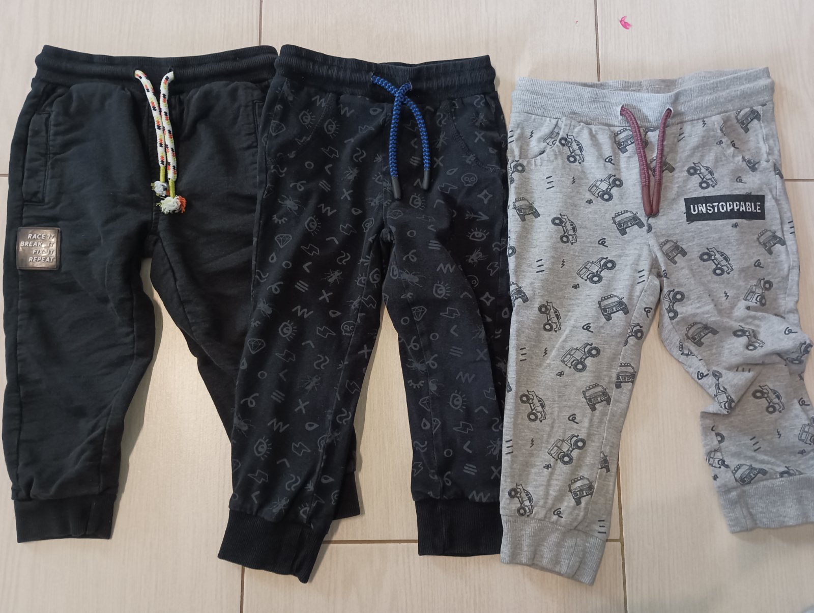 Všetky sú vo veľmi dobrom stave. Boli veľmi málo nosené. Troje sú zn. Coccodrillo a jedny zn. Pepco. Rozmerovo sú rovnaké - nafotené. Čierne nosil syn ako náhradu za nohavice. Majú aj odzipsovateľn...