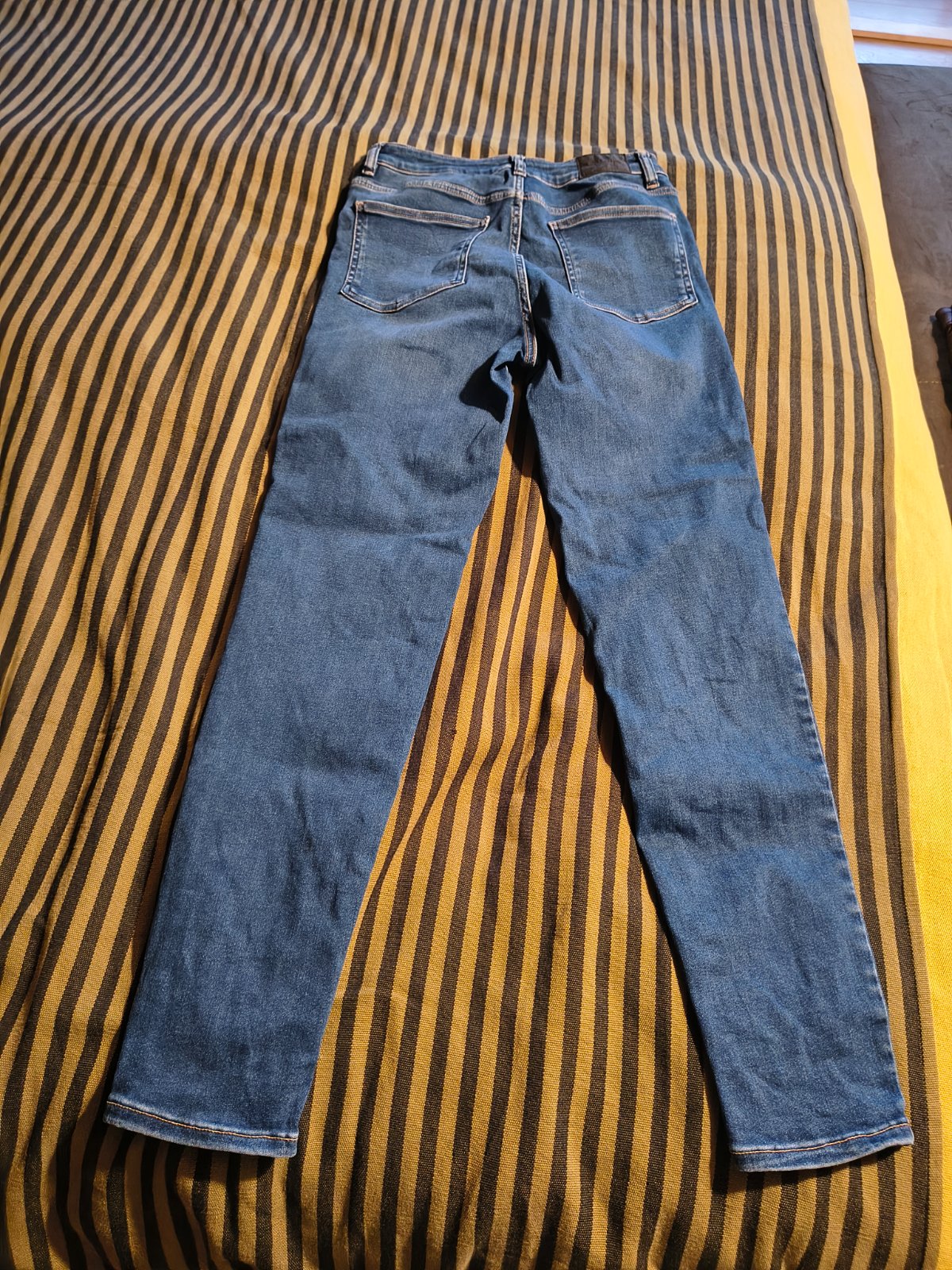 Nové, nenosené džínsy, užší strih, príjemný materiál: bavlna, elastan. Rozmery: celková dĺžka 98,5 cm, od rozkroku 73 cm, šírka v páse 36 cm.