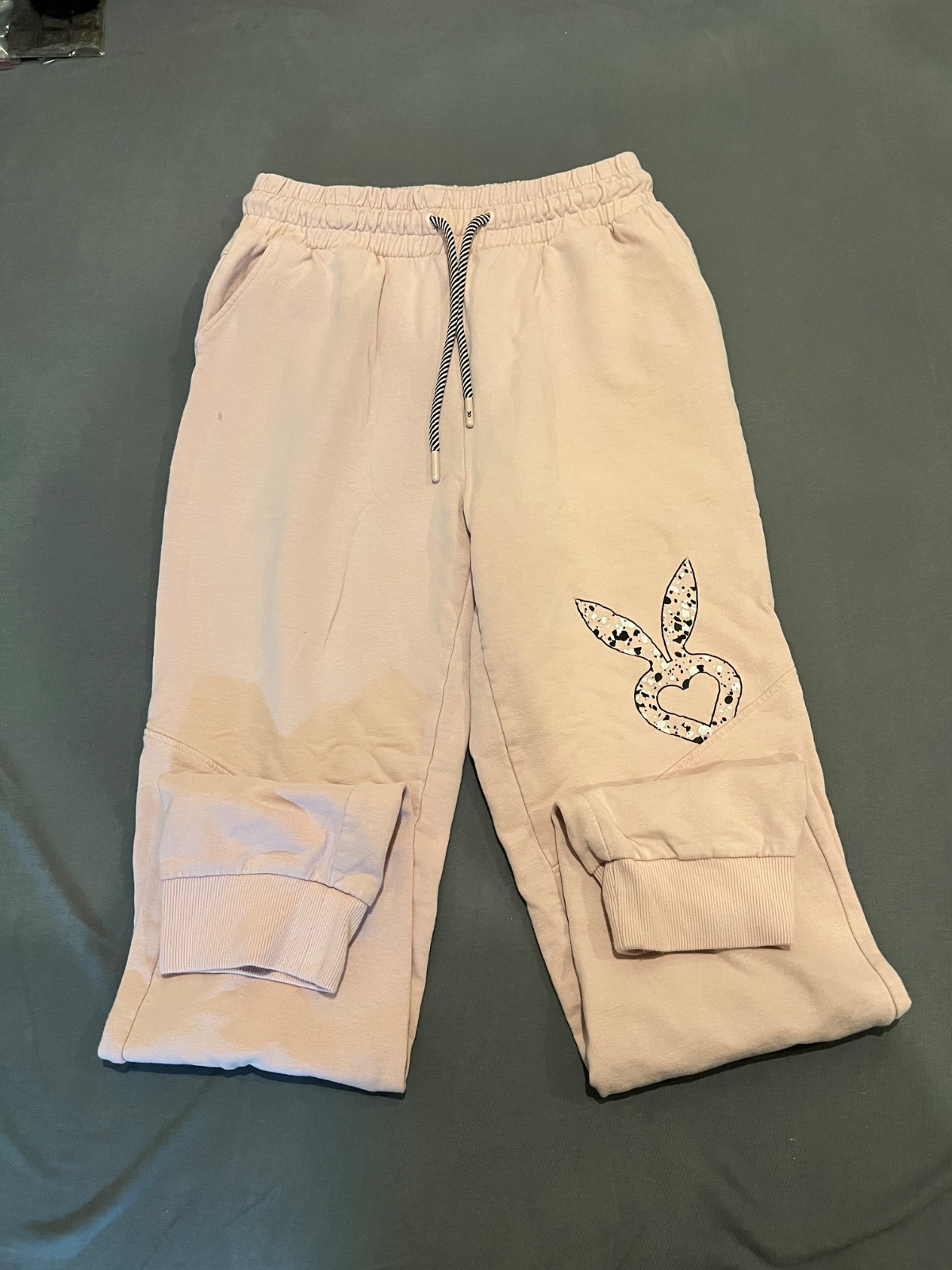 Farba je bledunko fialova, teplaky vo vybornom stave, vyvetrane parkrat iba, je na nich mala bodka netusim z coho ale nic hrozne( je odfotena na fotke a oznacena), rozmery tiez na fotkach