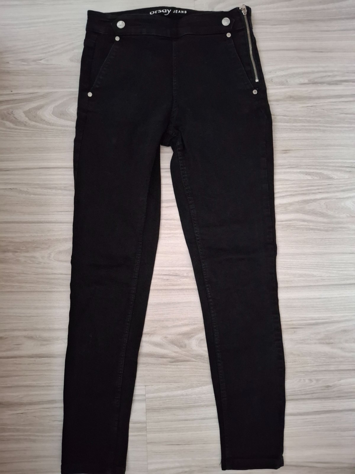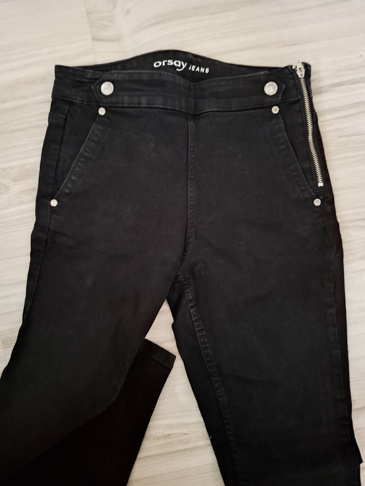 Elastické džínsy zn.Orsay, vyšší sed, bežné známky nosenia. Zloženie: 98 % bavlna, 2 % elastan. Rozmery: pás 32 cm, boky 38 cm, dĺžka 95 cm.