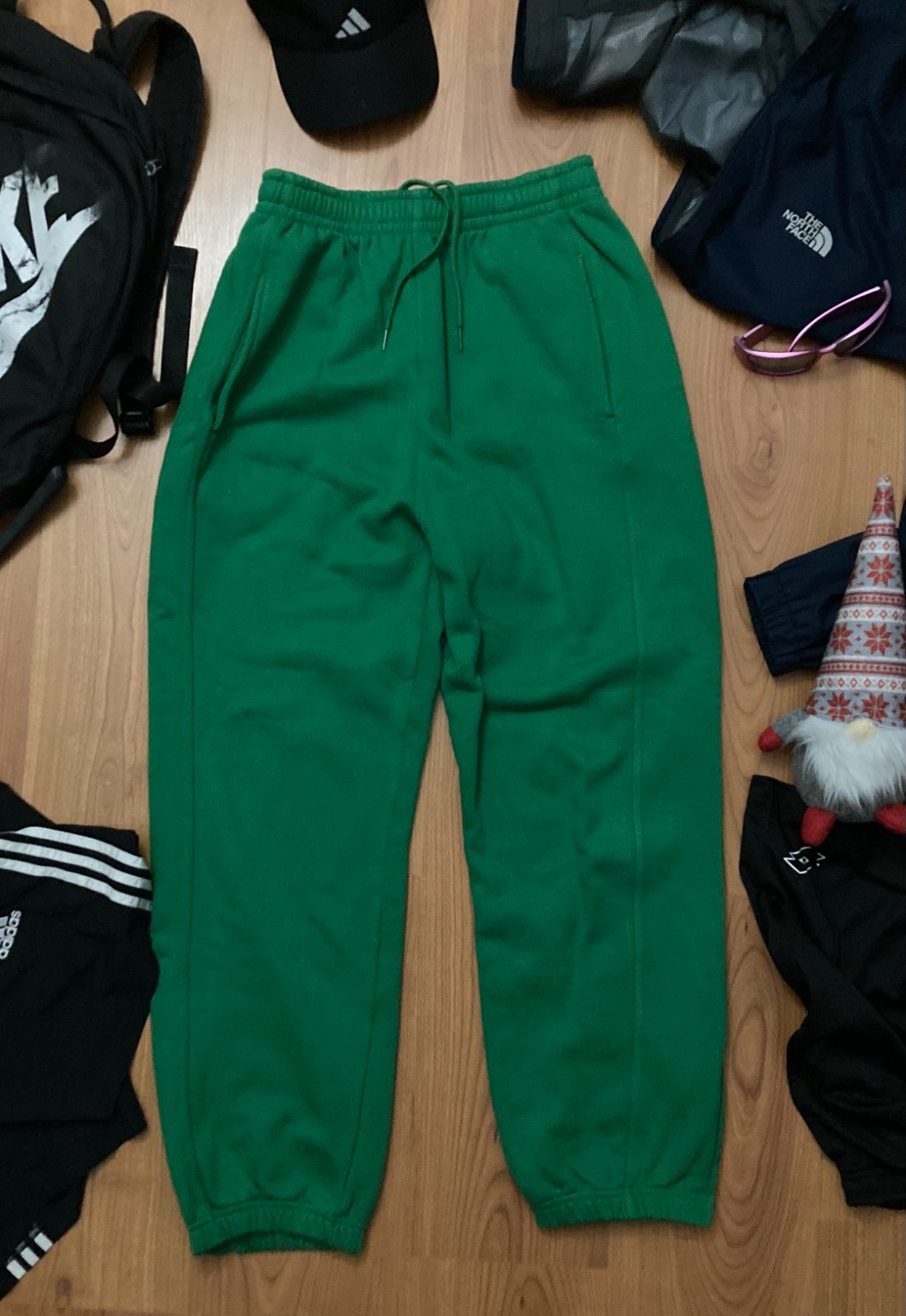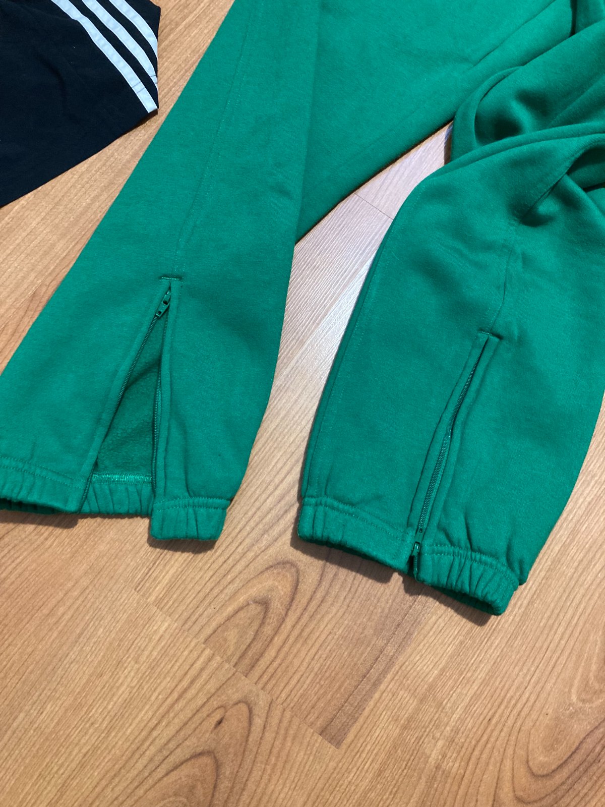 Zelené tepláky v dobrom stave. Nosené, no stále veľmi zachovalé. Bez dier a výrazných poškodení. Majú elastický pás so sťahovacou šnúrkou, bočné vrecká na zips a patentky na nohaviciach. Pohodlný materiál, vhodné na bežné nosenie aj voľný čas.