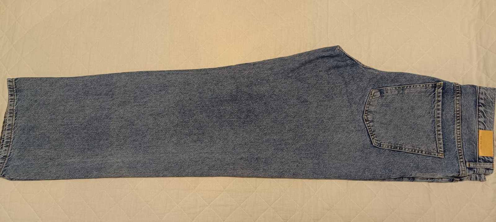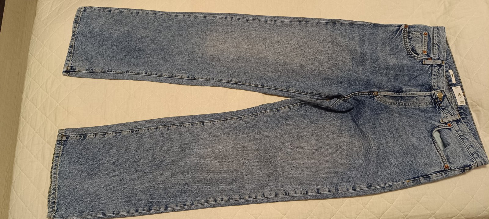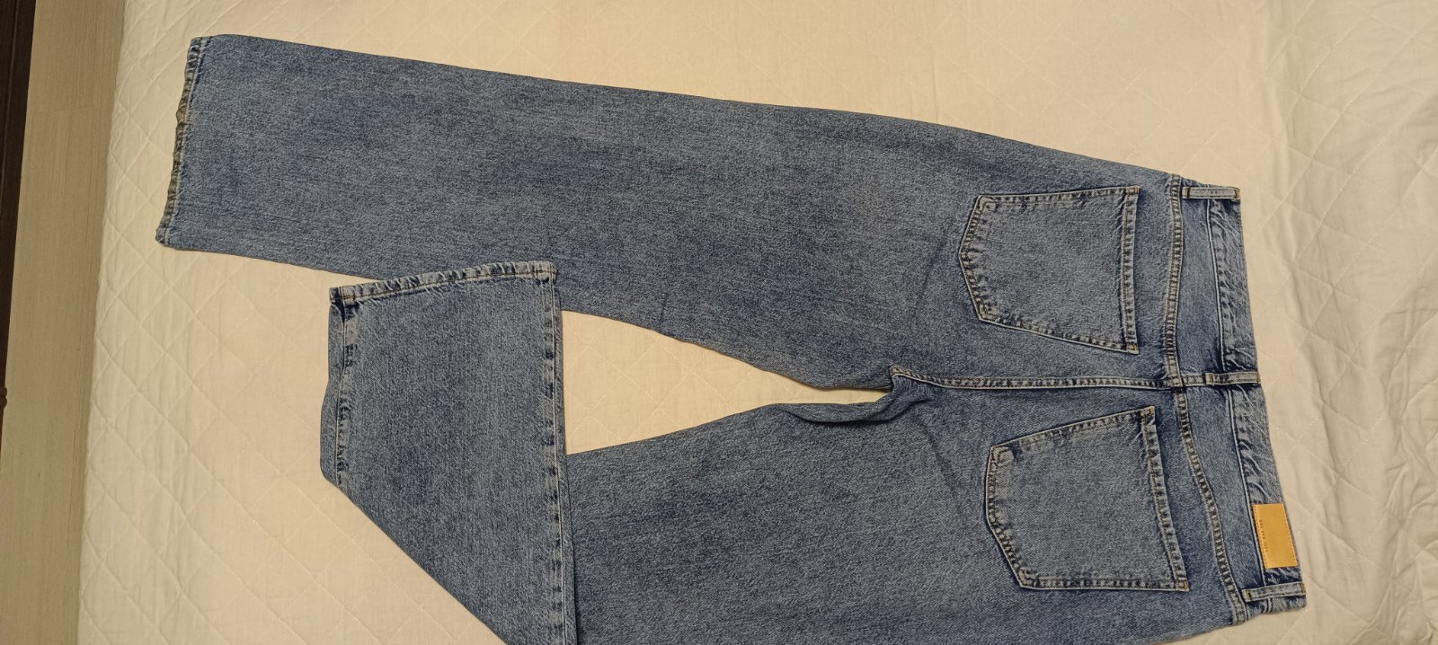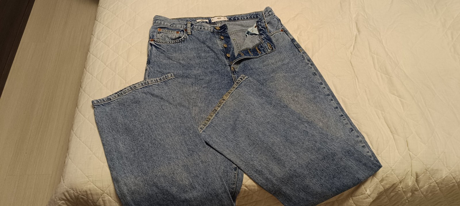 Módne široké nohavice, zapínanie na gombíky, vysoký pás, z bavlny bez elastanu. Okraj pravej nohavice mierne opotrebovany od kontaktu so zemou, pri nosení nevidno. Ináč sú pekné, bez poškodení. Mne sú tesné cez stehná, sú veľmi dlhé, hodia sa skôr na postavu s č.42. Posielam poštou obyčajne, po pripísaní peňazí na účet.