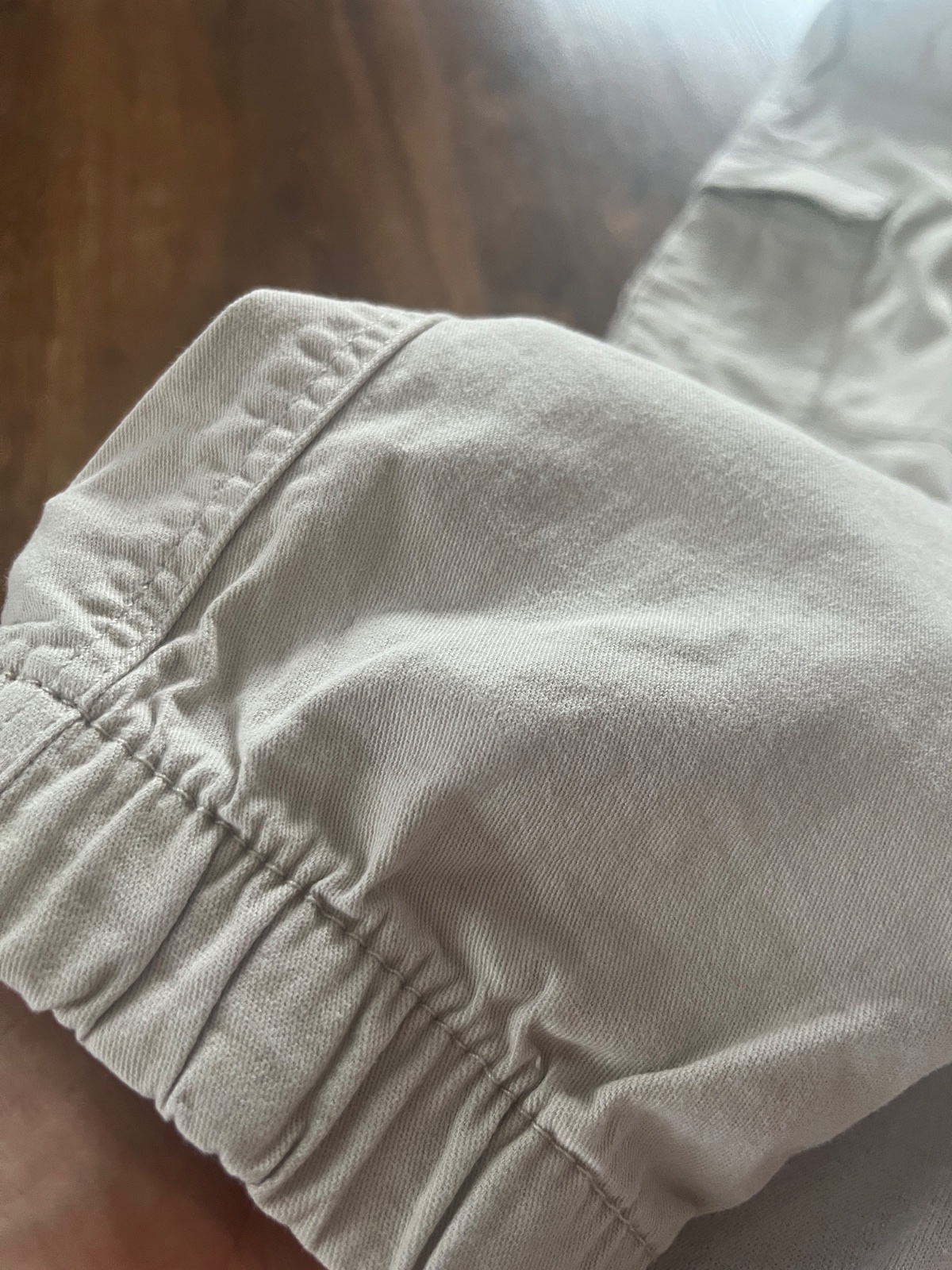 Béžová farba. Nohavice nenosené. Dĺžka 90 cm, šírka v páse 35 cm a sťahovanie na šnúrku.