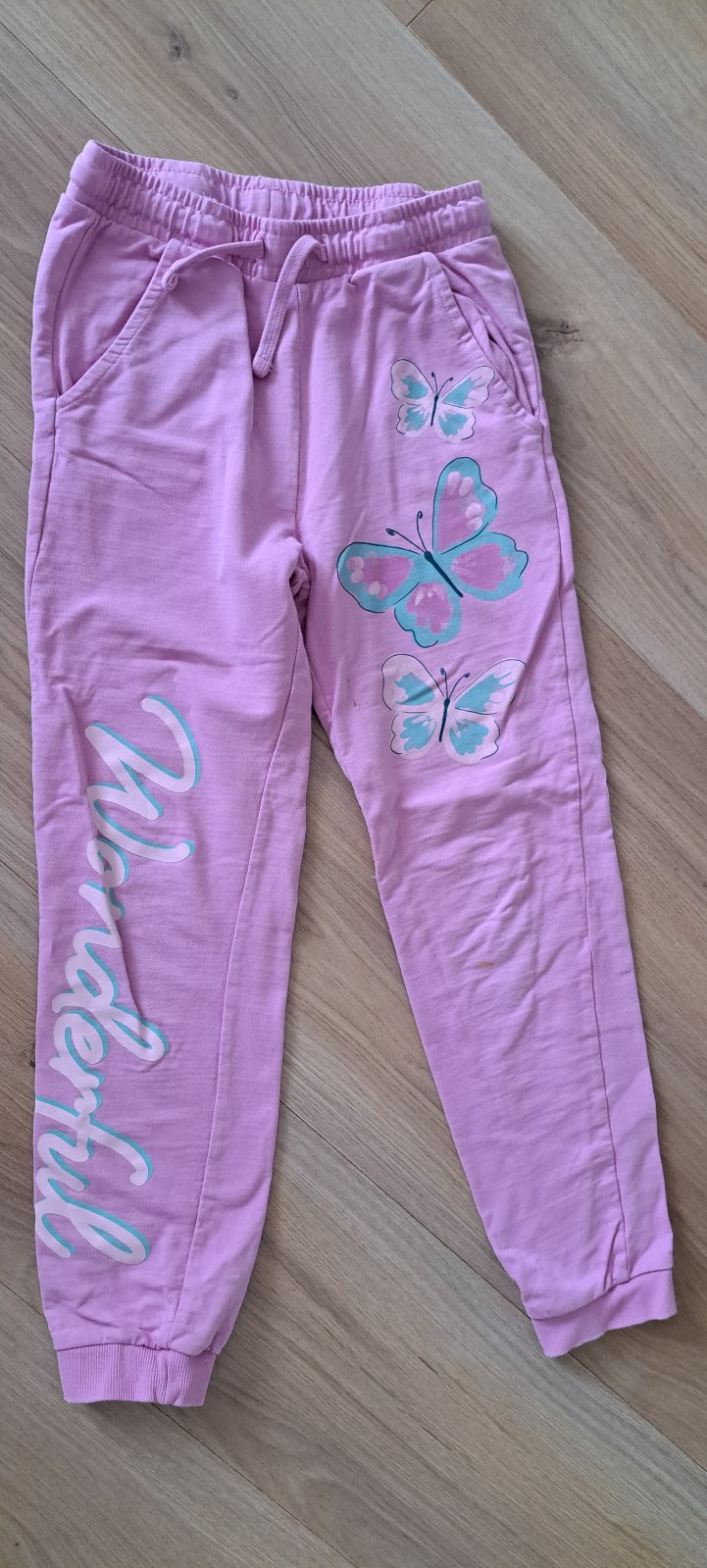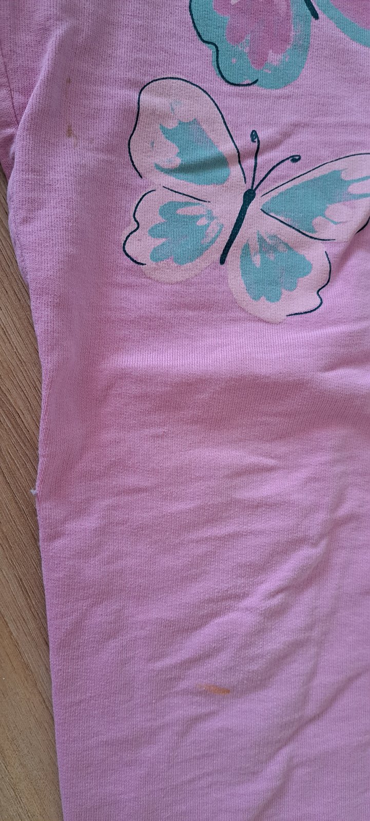 Tepláky po jednom dieťati bez poškodenia, na fotke vidieť fliačky, ktoré sa nedali vyprať. Značka little kids