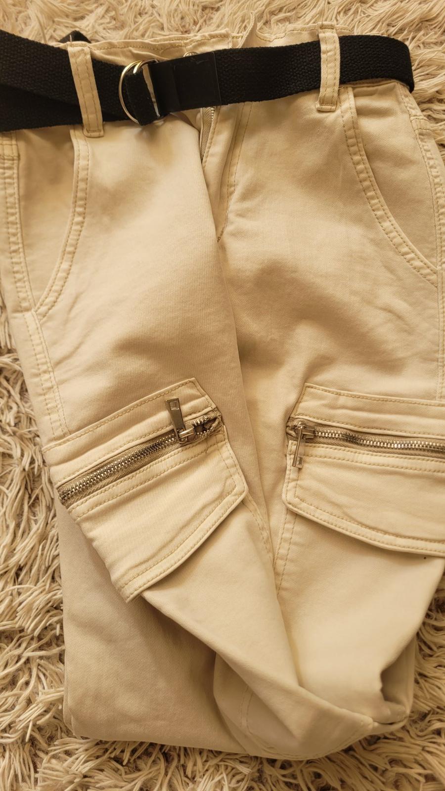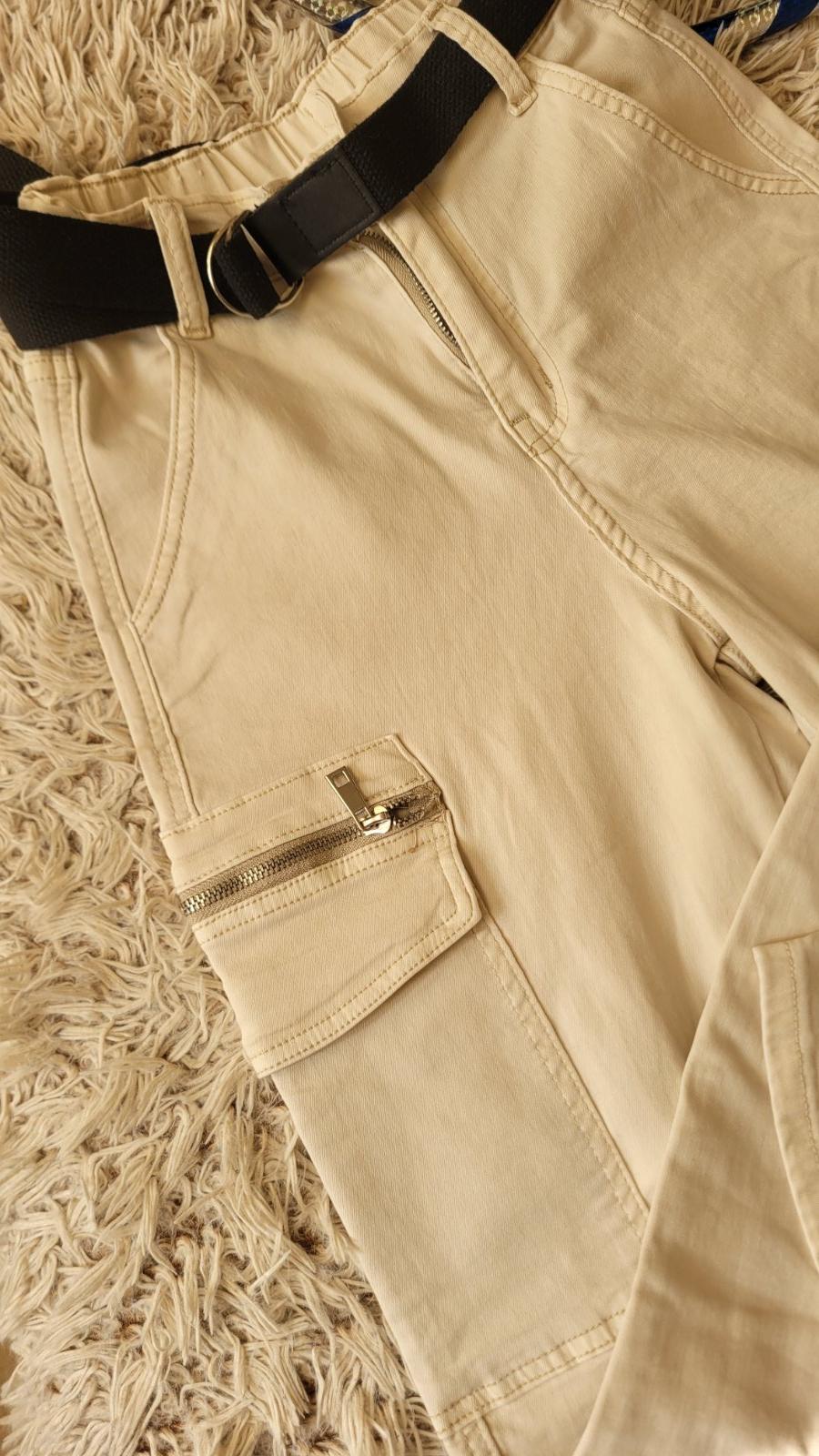 krásne príjemný materiál bavlna, nosené vo výbornom stave, nežmolkujú :-) sú veľi príjemné bavlnené moderné kapsáče, dolu patent, vačky aj na bedrách hore sú na gumu ale iba vzadu viď posobí to ele...