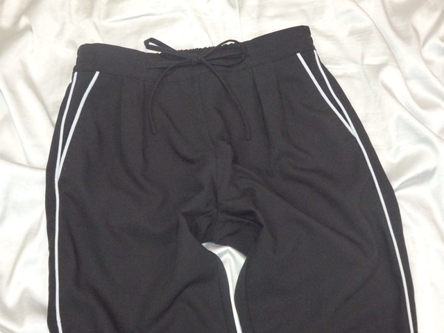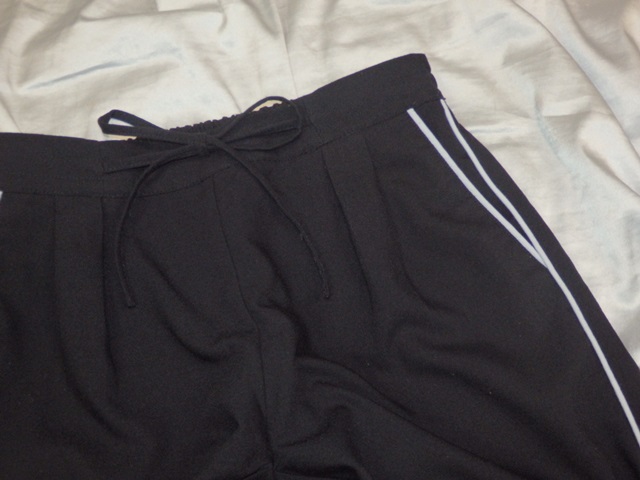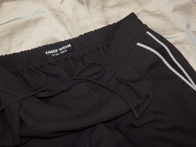 Kvalitné dámske nohavice čiernej farby s pásikom po bokoch, všité vrecká, vzadu v páse gumka, materiál 75% polyester, 19% viskóza, 6% elastan, super stav.