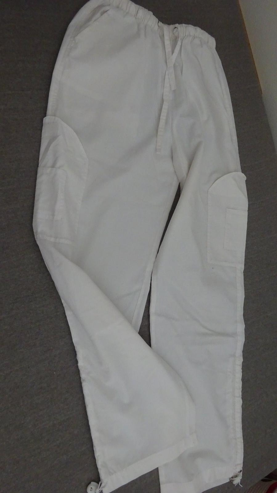 Veľmi dobrý stav! Dámske biele nohavice, elegantné, skrátené, pás na gumu, dve bočné vrecká, jemne elastické, tenké. ROZMERY: dĺžka meraná vzadu:89cm, od rozkroku dĺžka dole:63cm,obvod pása v kľud...