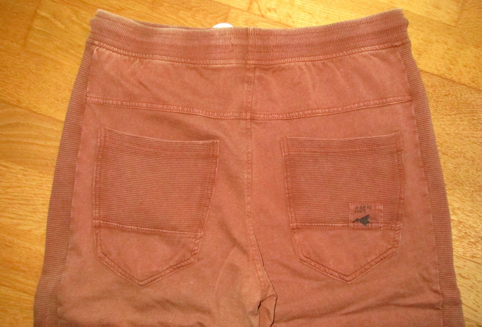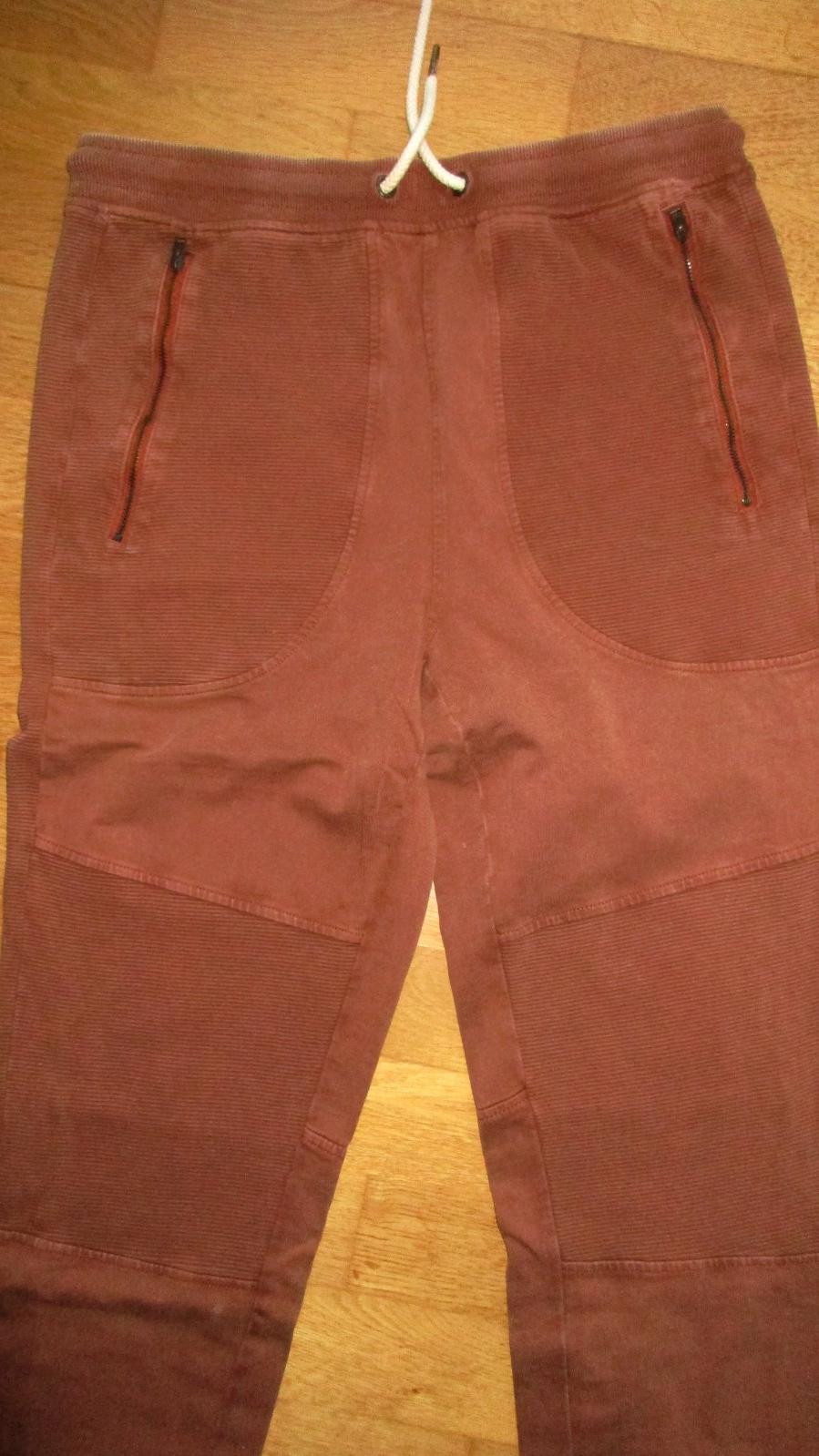 farba je skoricova s jemnym spranym efektom. Boli oblecene max 2x, viac urcite nie, su ako nove. vrecka su na zips, vzadu 2 nalozene vrecka, v pase guma aj snurka na stiahnutie. Nie su zateplene, su bavlnene, kombinovane 2 druhy upletu, teplakovina a taka strukturovana teplakovina. Dlzka na boku 98 cm, pas v klude 2*39 cm