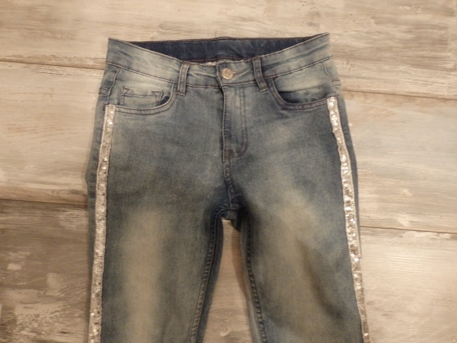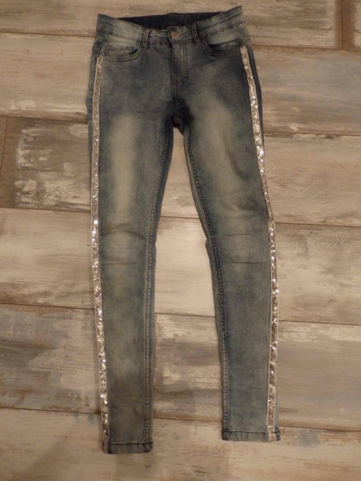 Pekné úzke rifle s flitrovým pásikom naboku, vhodné pre štíhle dievča, veľ. písaná 146, ale podľa mńa sú menšie, tak 134/140. Na jednom kolienku malý fliačik.
