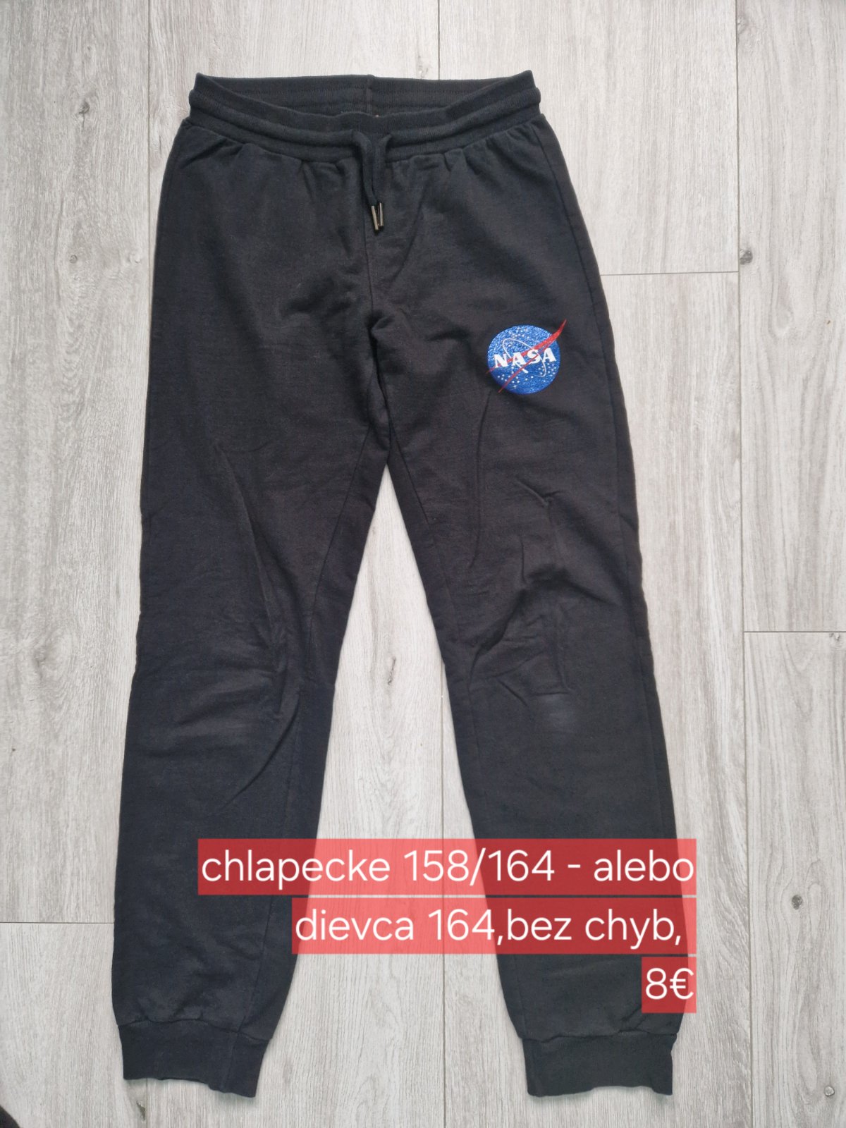 Predam teplaky NASA,vel.158/164,bez dier a flakov,nema vrecka,Cena 8€.