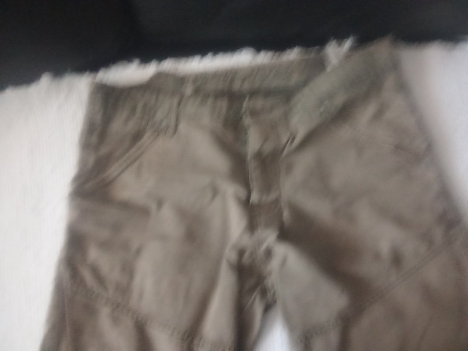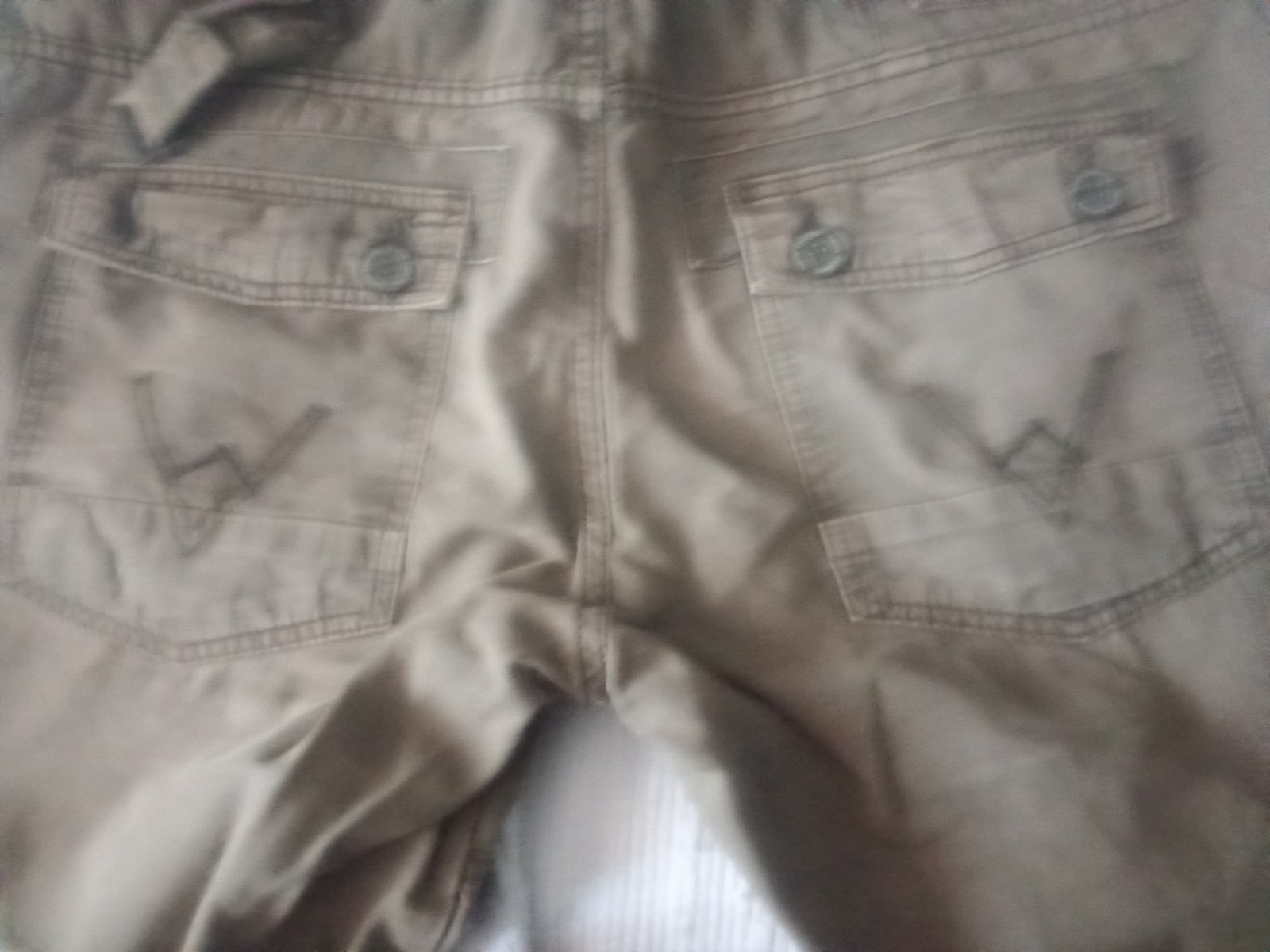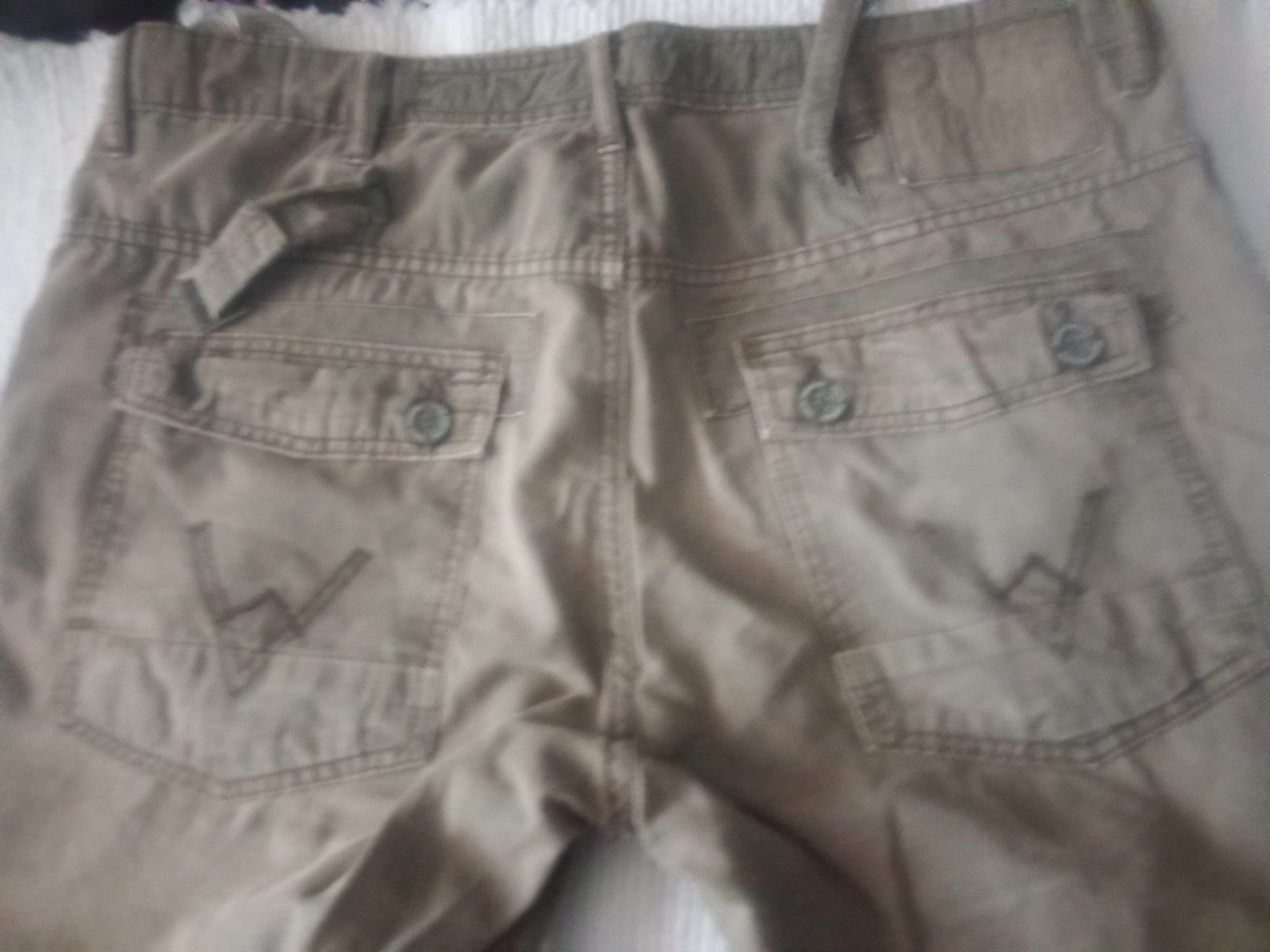 Panske, chlapčenské nohavice z pevnej látky, prešívané na kolenách, pevné vrecká, nosené viac,ale ešte stále nositeľné. Majú vpredu pri vrecku vyblednuté fliaciky, pre menej náročného napr. do práce,na túlanie po lese a pod. Inak veľmi fajn. Boli drahé.