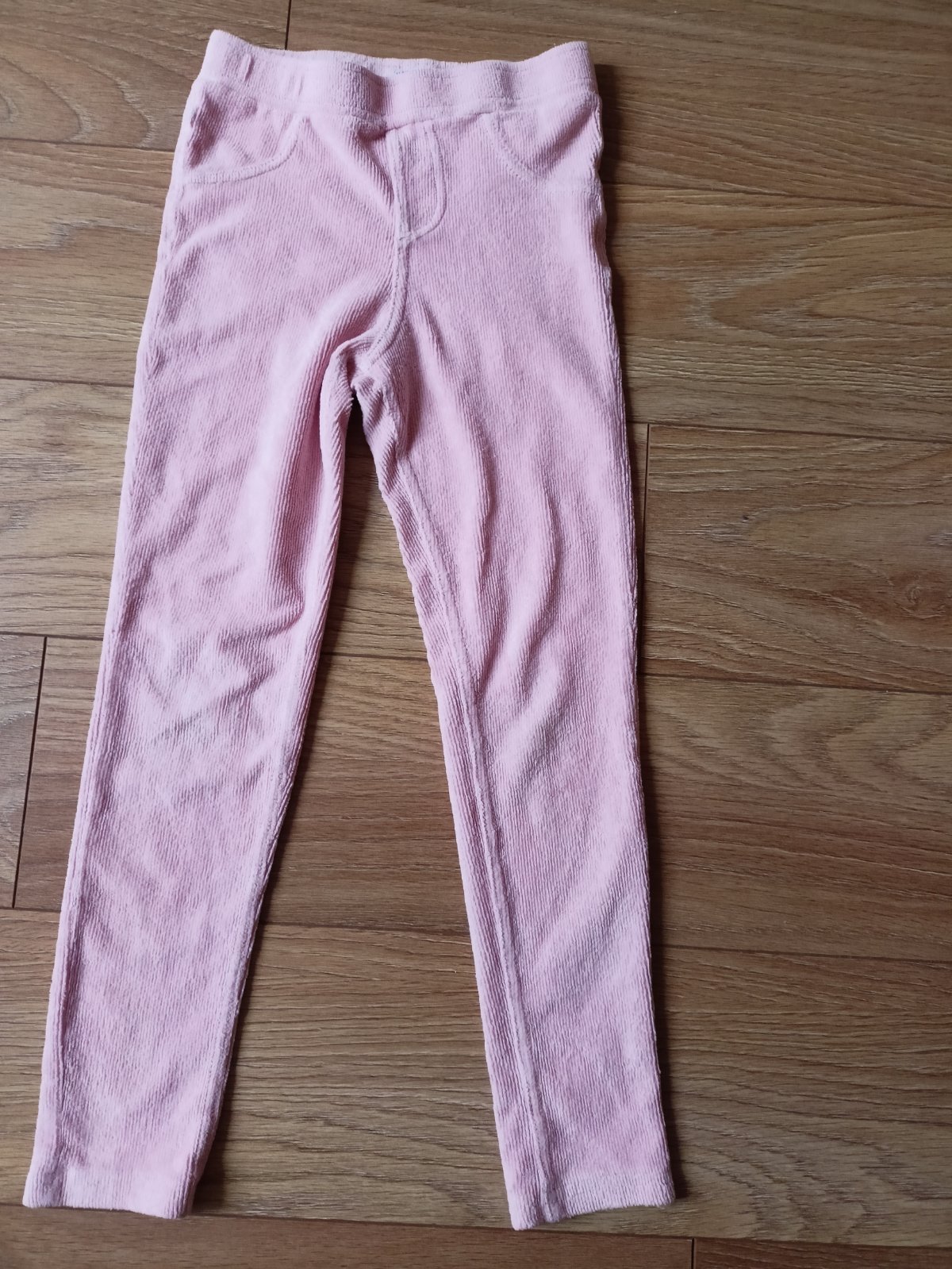 Nosené zachovalé nohavice, v. 128. Materiál 98% bavlna, 2% elastan. Celková dlžka 69cm, vnútorná nohavica 48cm, sed vpredu 20cm, sed vzadu 27cm, boky 2x35cm, pás nastaviteľná gumka v kľude cca 2x28...