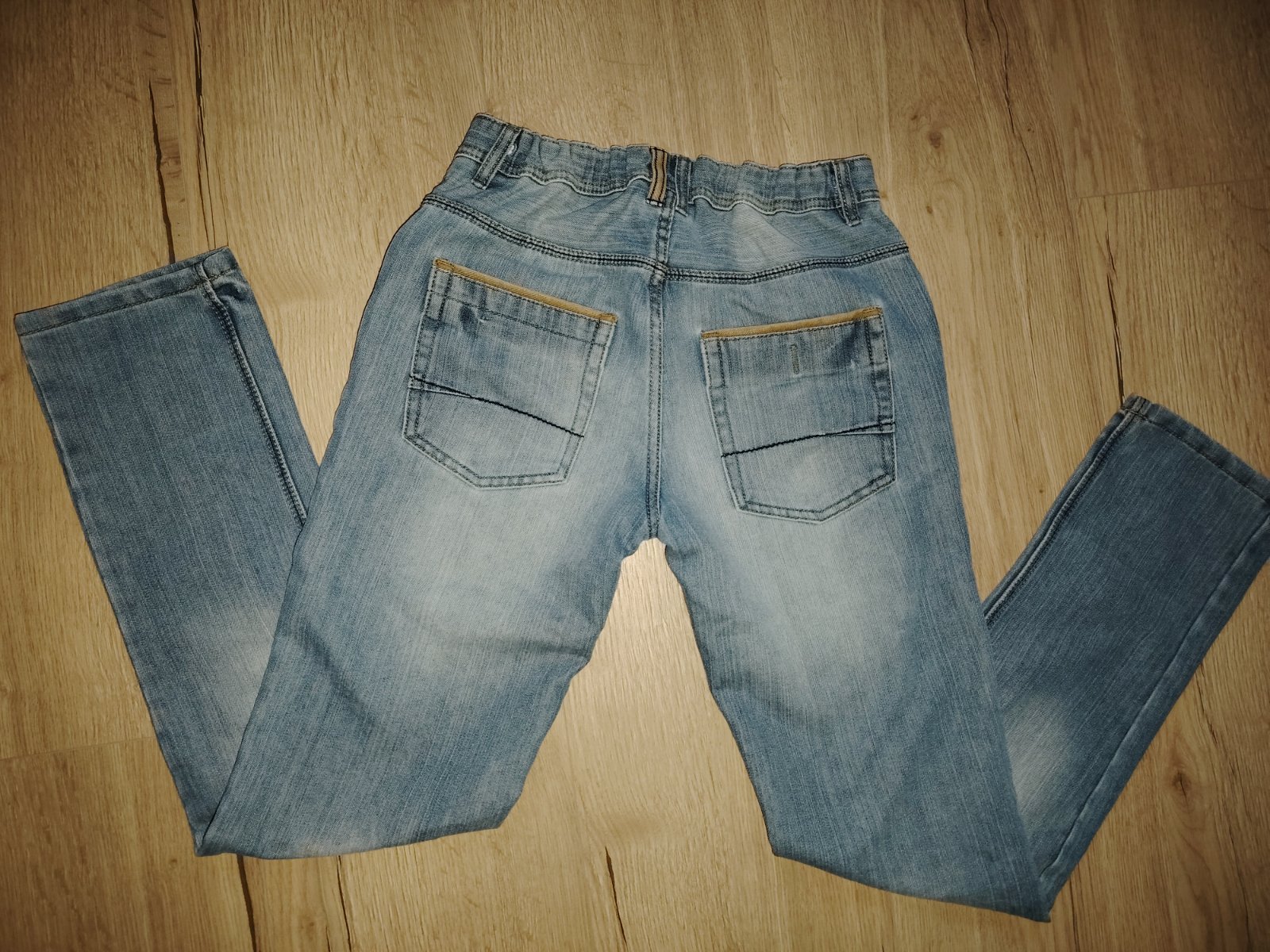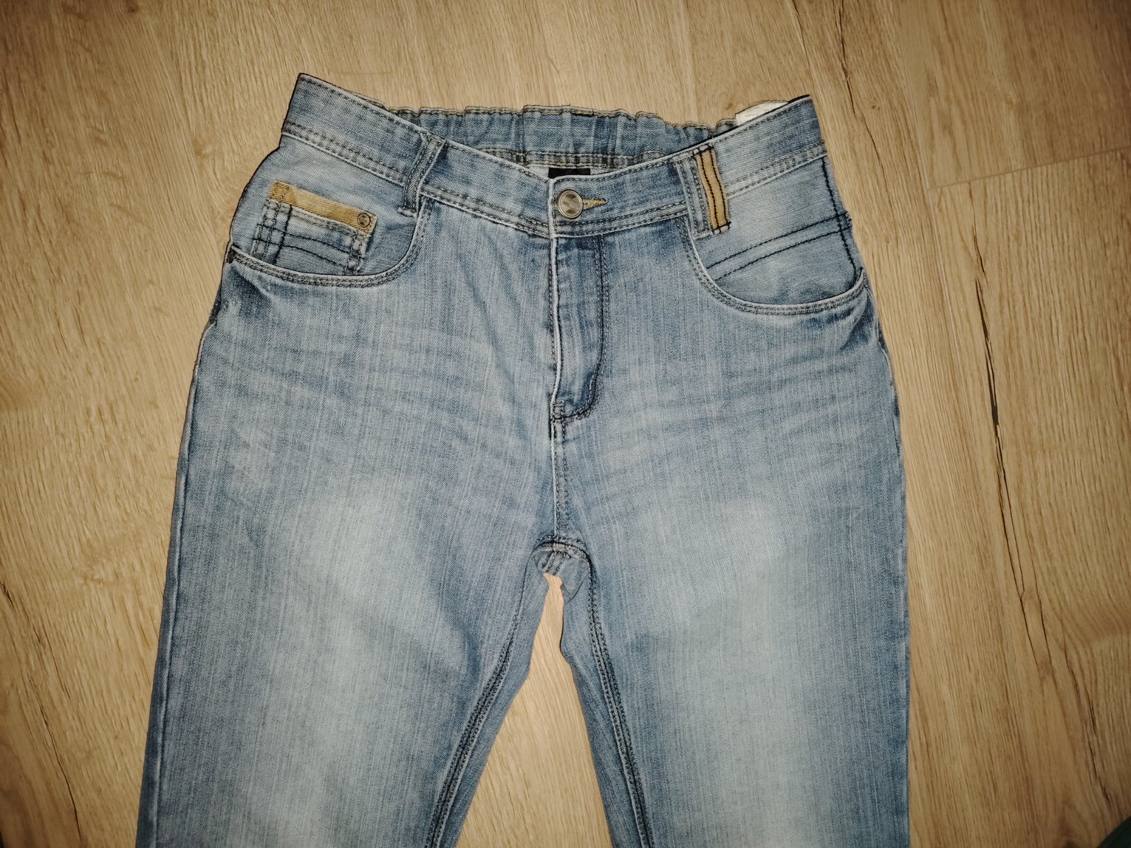Kvalitné detské rifle bledomodrej farby, jemne batikované, na kolenách diery, materiál 71% bavlna, 27% polyester, 2% elastan, super stav. šírka v páse 37-40x2 cm, boky 44-48x2 cm, dl. 107/86 cm, ...