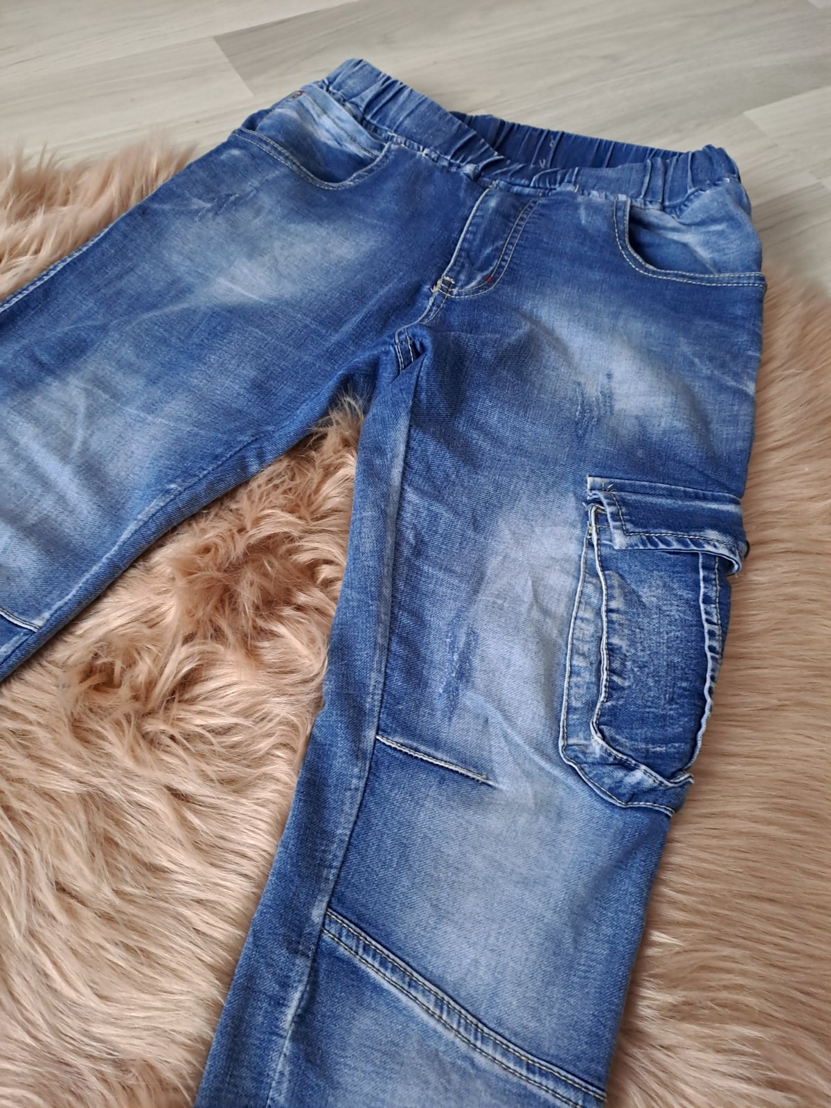 Pekné rifle v páse guma. Pohodlné, príjemné na nosenie. Malilinká chybička na kolene, viď. foto. Inak veľmi pekný, nosený stav bez ďalšieho poškodenia. Veľ. 158.