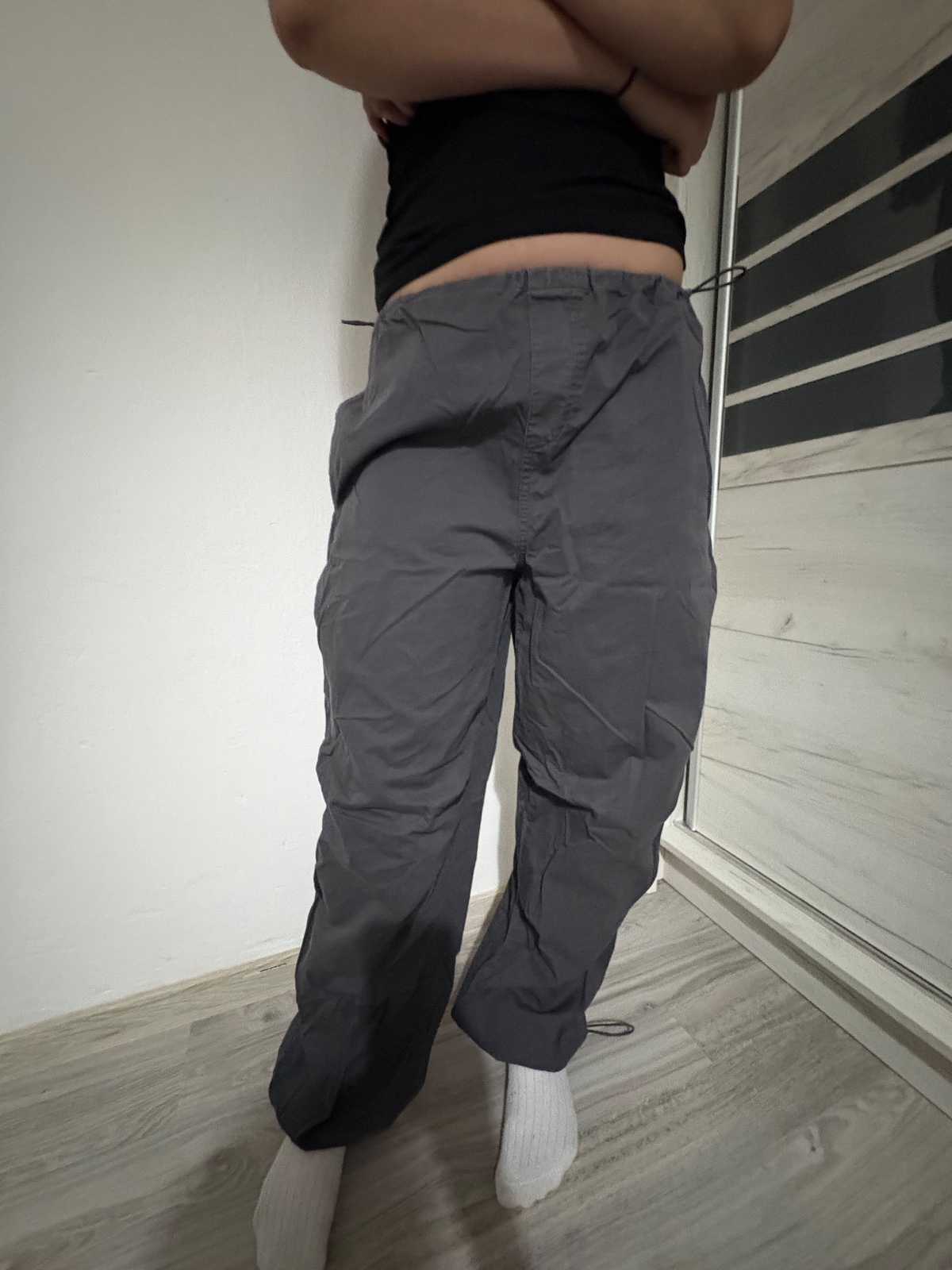 Sú to voľné nohavice, sú vporiadku okrem jednej gumičky na ľavej strane nohavíc ktorá sa roztrhla no je tam uzol okrem toho sú bez poškodenia. Na všetkých vreckách +nohy a pás sú gumičky. Okrem kap...