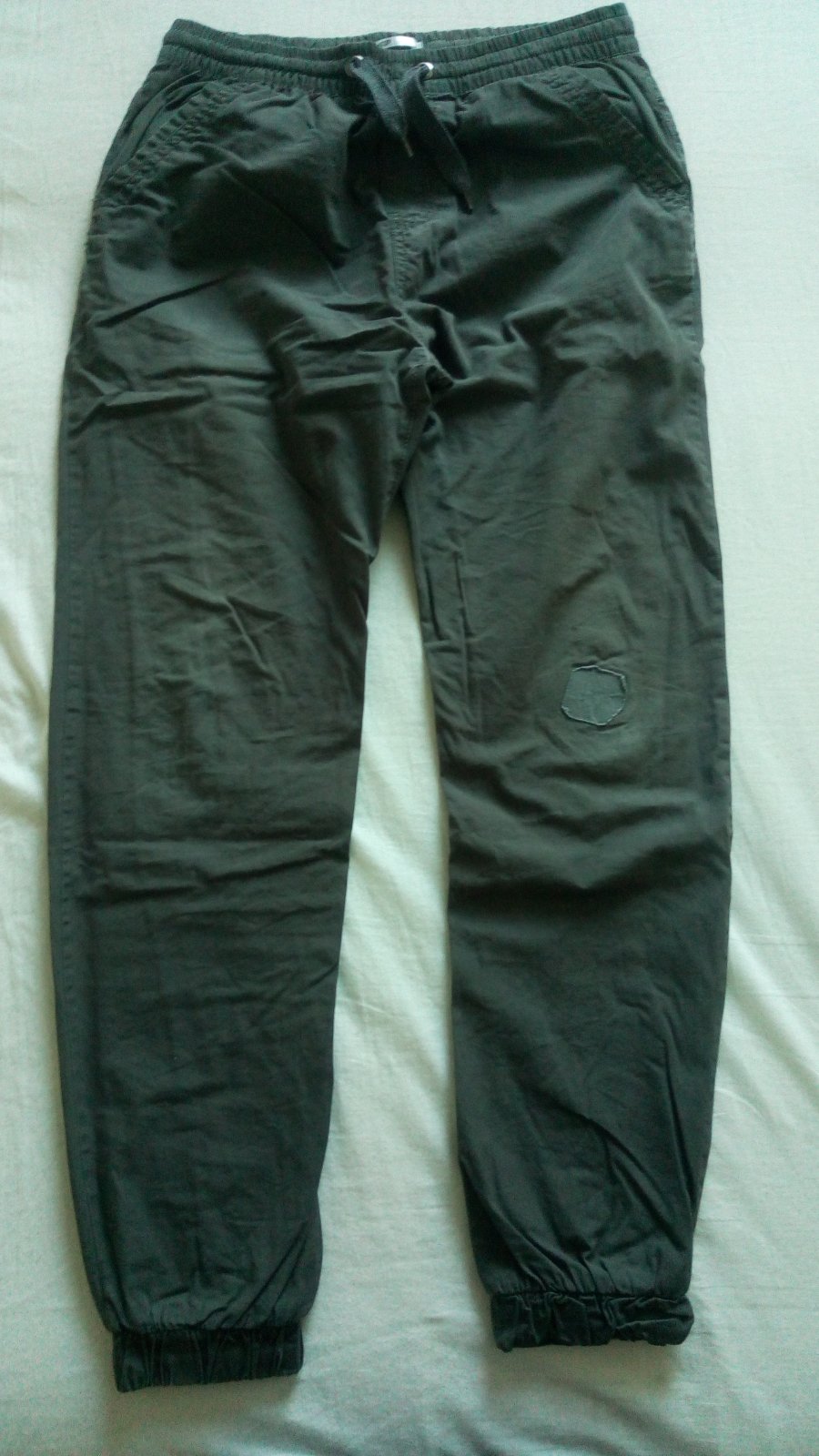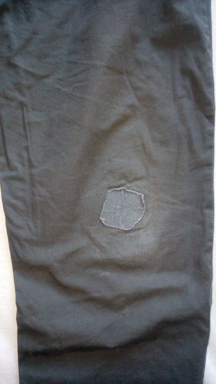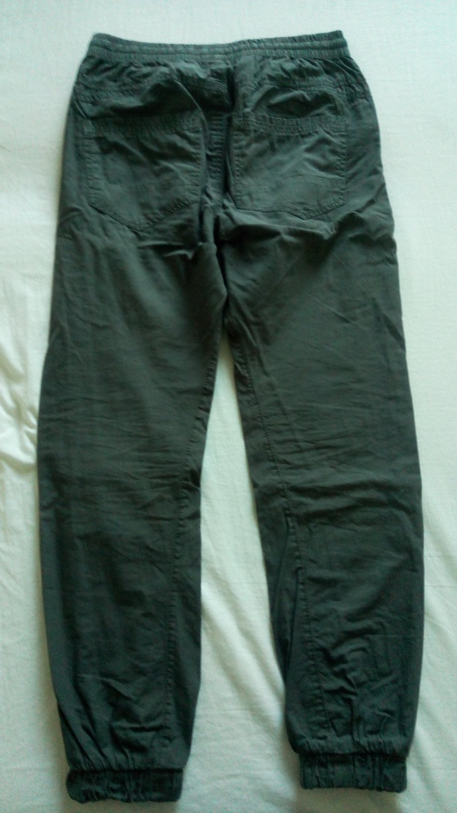 Podšité látkou, vidno pranie na farbe, jediná chybička je záplata na kolene. Veľkosť 164, skôr zodpovedajú veľkosti 158.