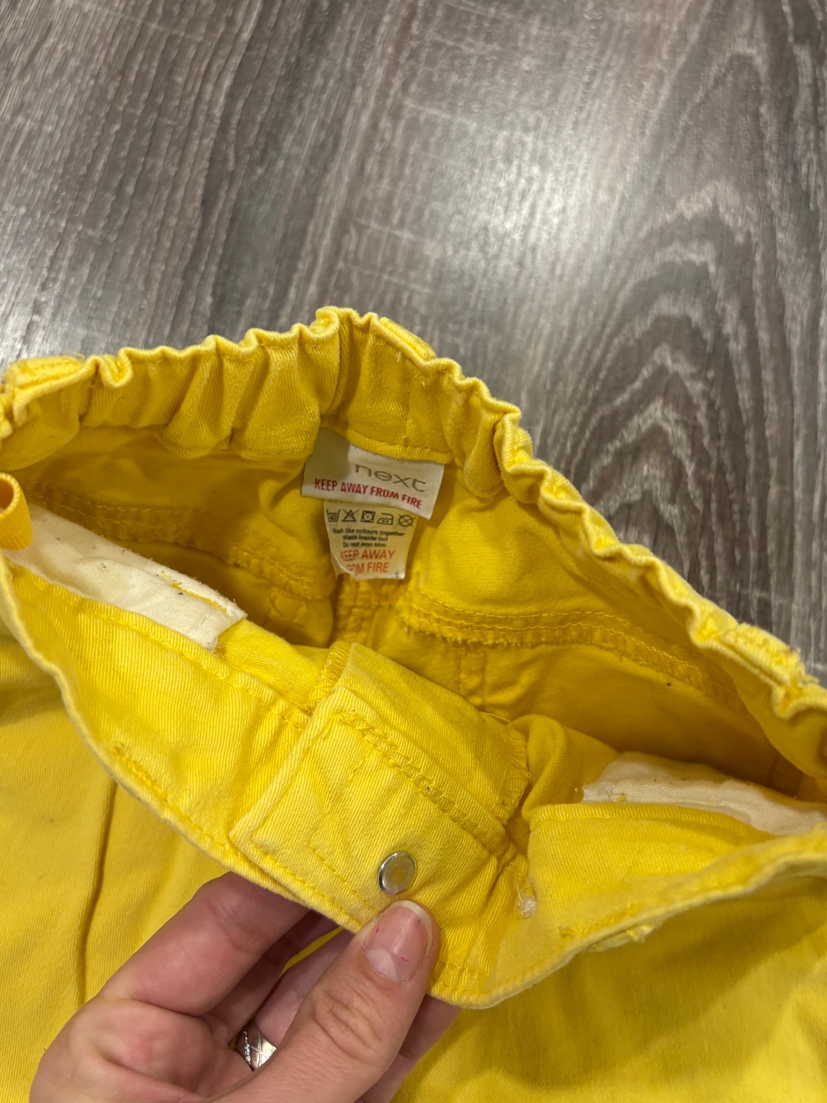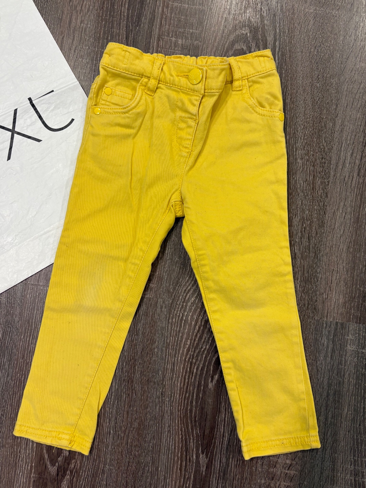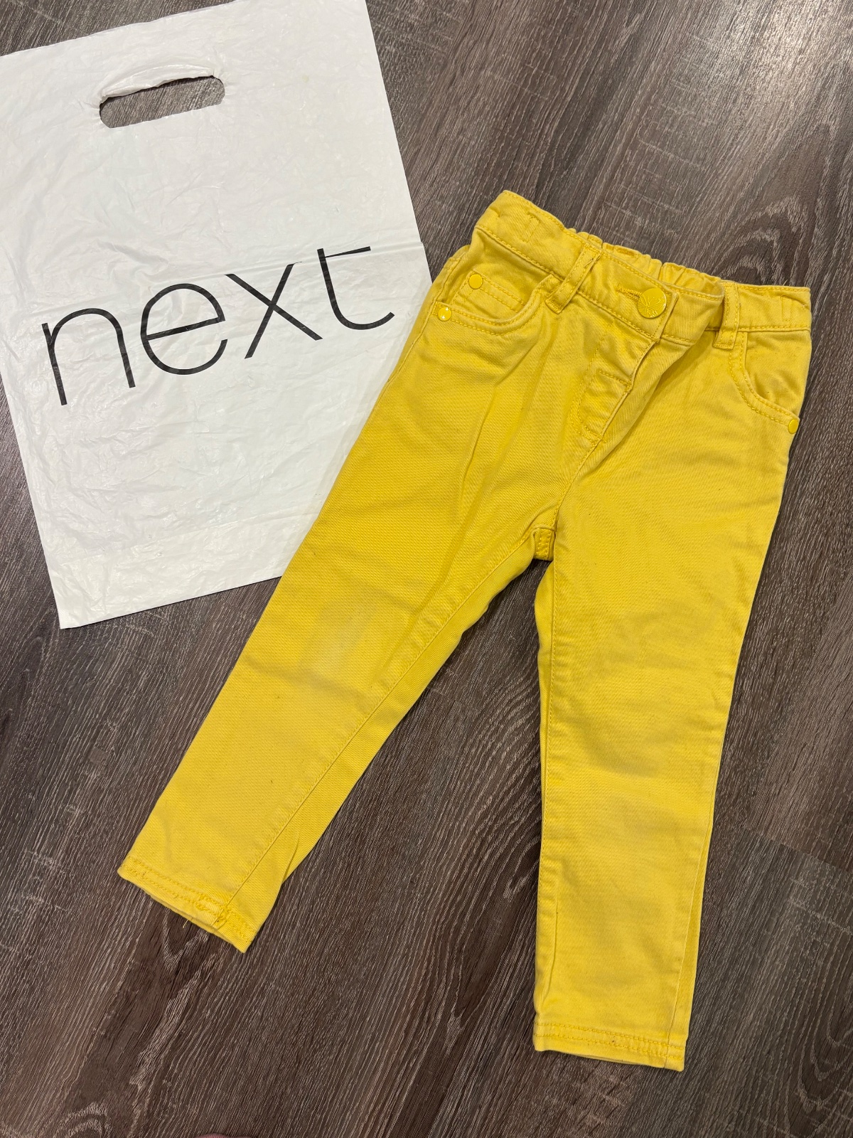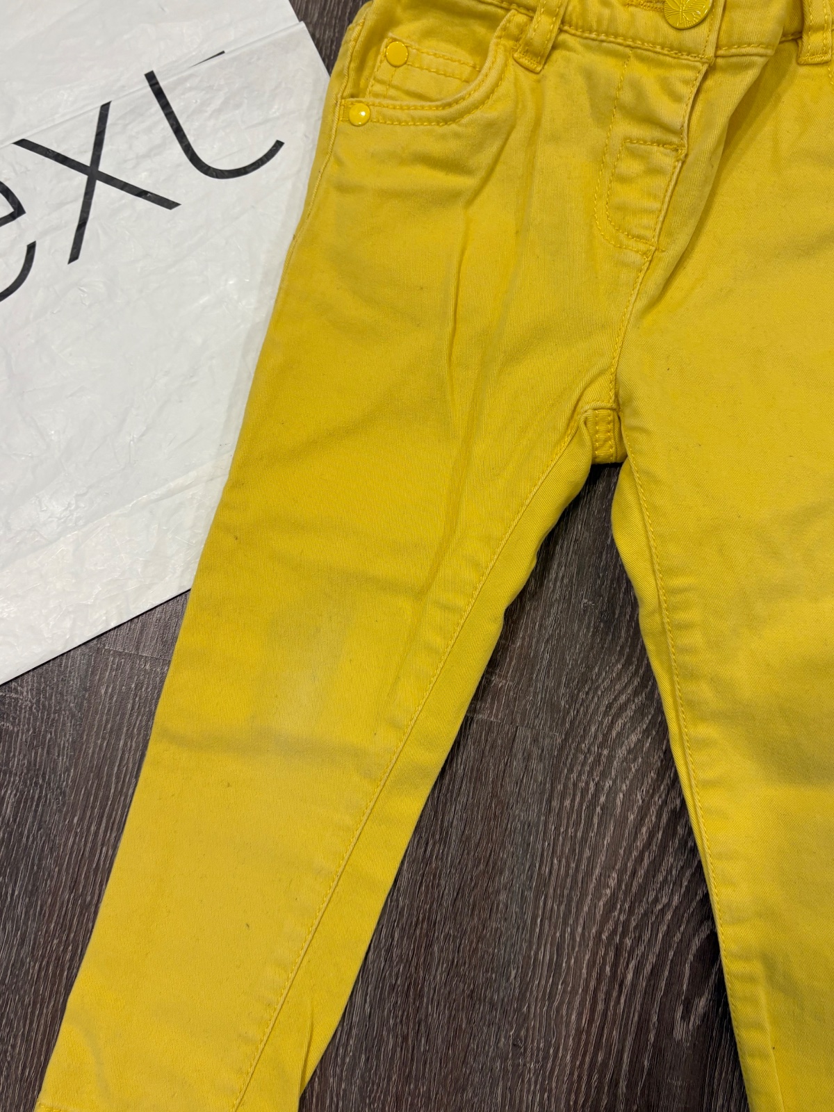 3.NEXT krasne žlte nohavce , so stahovacou gumkou v páse , mini pošpinenie na kolene,velkost je 98, dlžka je 52cm, širka v páse je od 25x2cm do 32x2cm