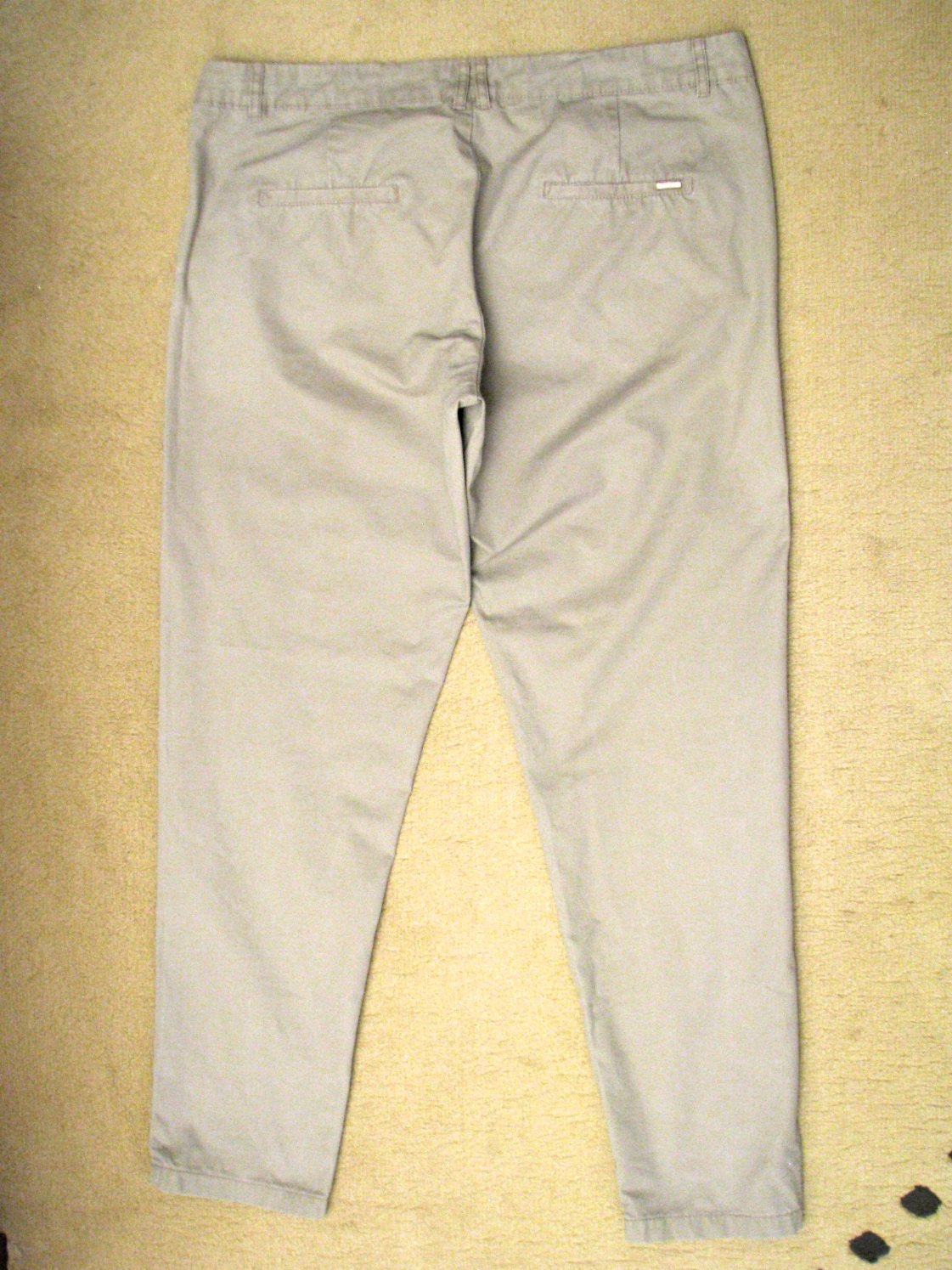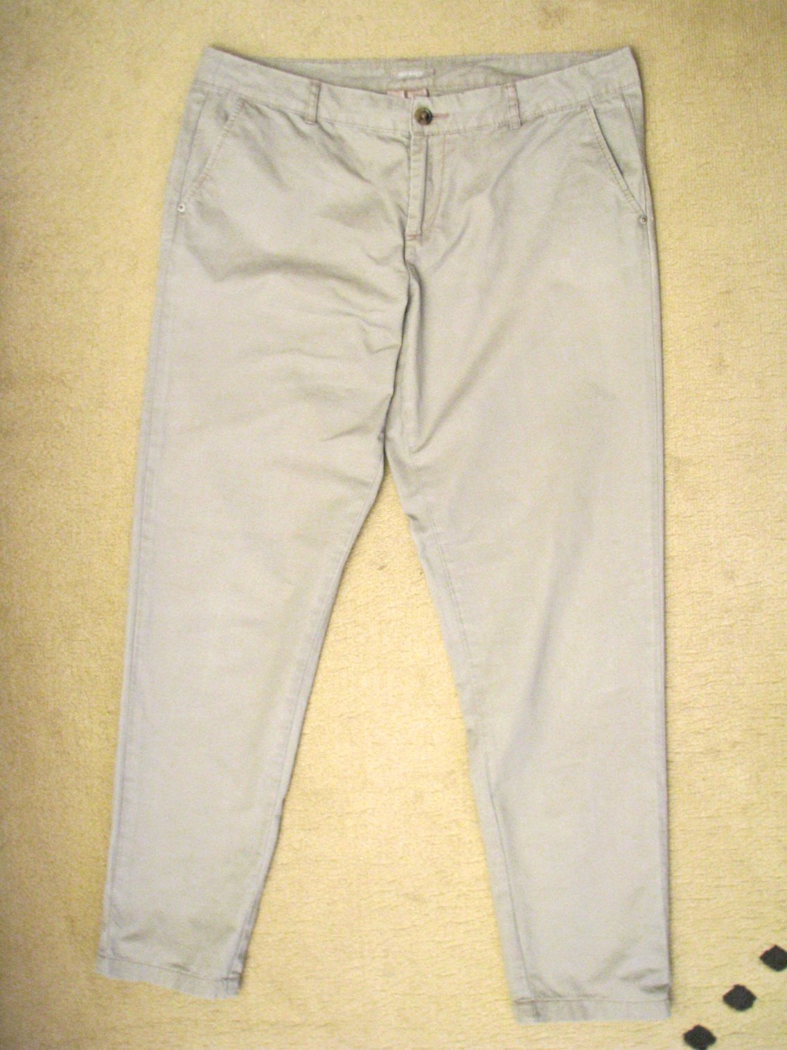 Dlhé bavlnené nohavice svetlej hnedej farby, trochu tmavšie od béžovej, skôr tenké. Pás je skôr nižší. Výborne zachovalé, bez poškodení. Štítky odstrihnuté, veľkosť iba odhadujem na L - 40, v prípade záujmu premeriam.