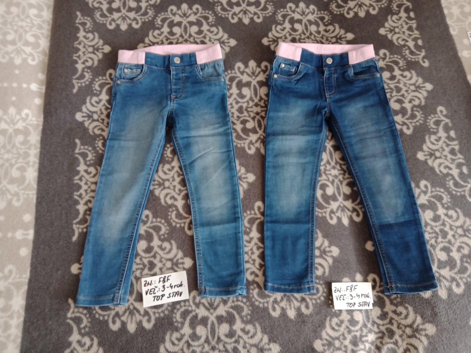 Predám dievčenské rifle zn.F&F veľ.3-4roky,v top stave,farba je ako na fotke.Predam aj jednotlivo.Cena za kus 3,50eur