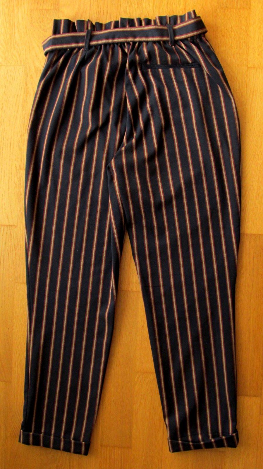 nohavice typu paper bag, malicko nosene (su mi uzke), s dlzkou po clenky a uzkou manzetou na nohaviciach (d sa zrusit). Latkovy opasok z rovnakej, velmi prijemnej latky, daju sa zazehlit aj na puky aby posobili este elegantnejsie. v pase je aj jemna guma, aby lepsie sadli. vpredu 2 funkcne vrecka. Nohavice nemaju ziadne poskodenia, strih lichoti postave. Farba je sice pisana namornicka modra ale mne sa zda cierna.