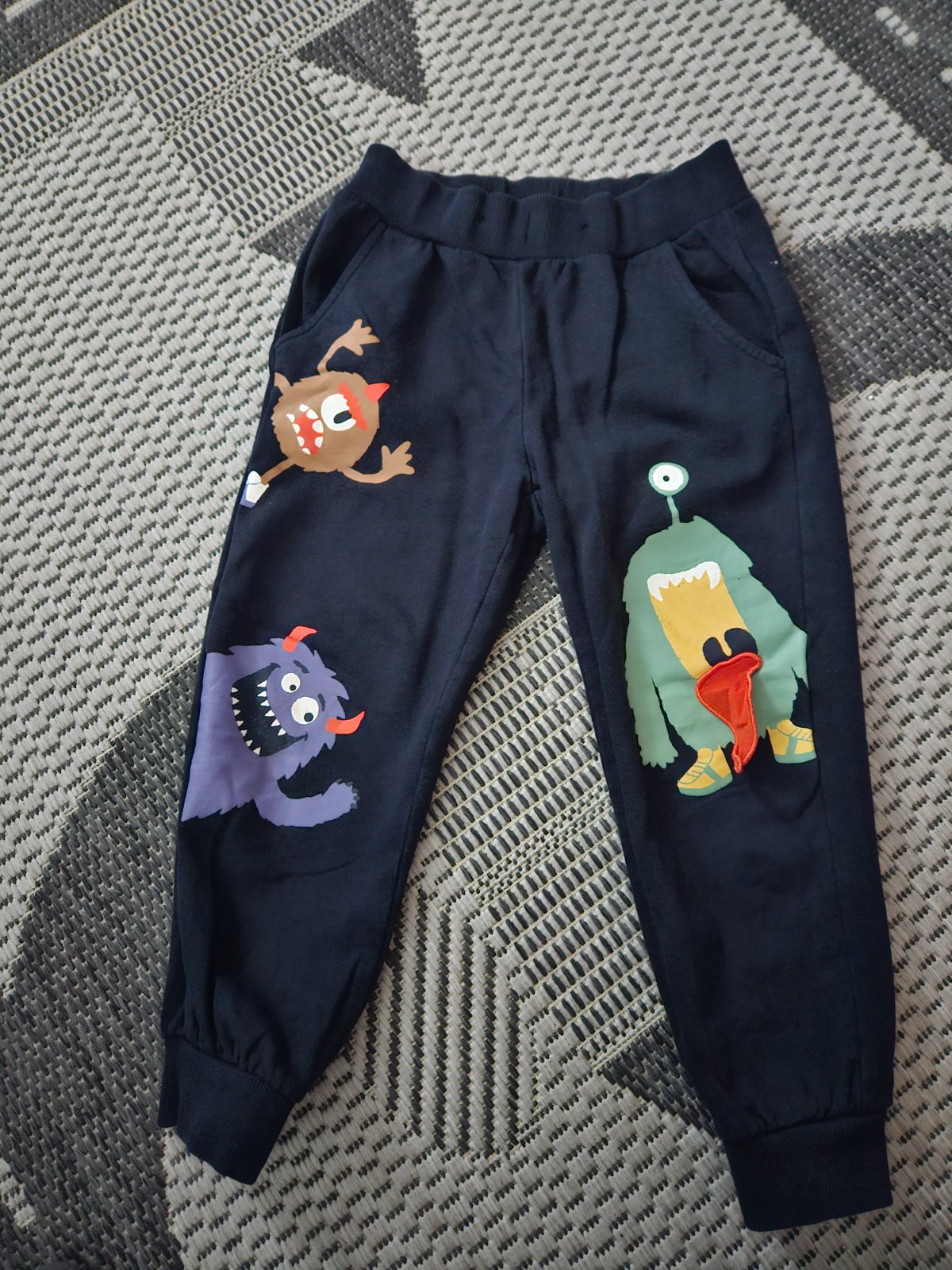Málo nosené tepláky s 3D nášivkami, nastaviteľný pás