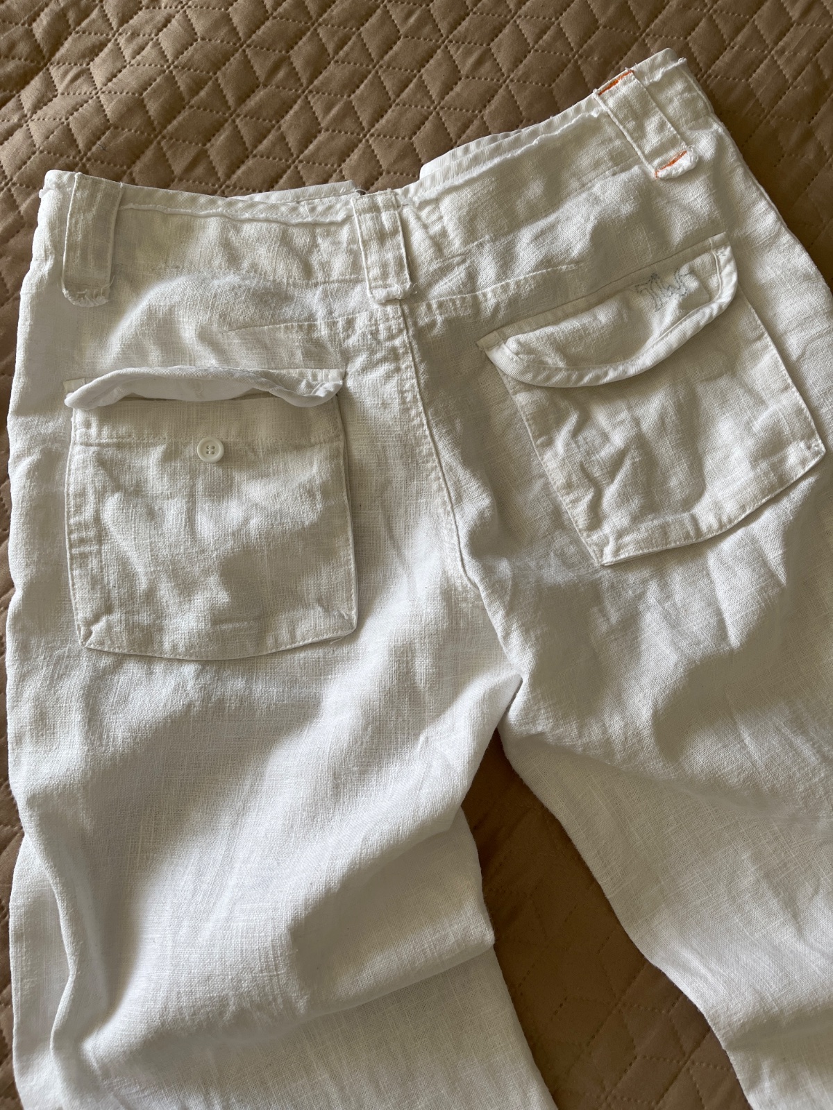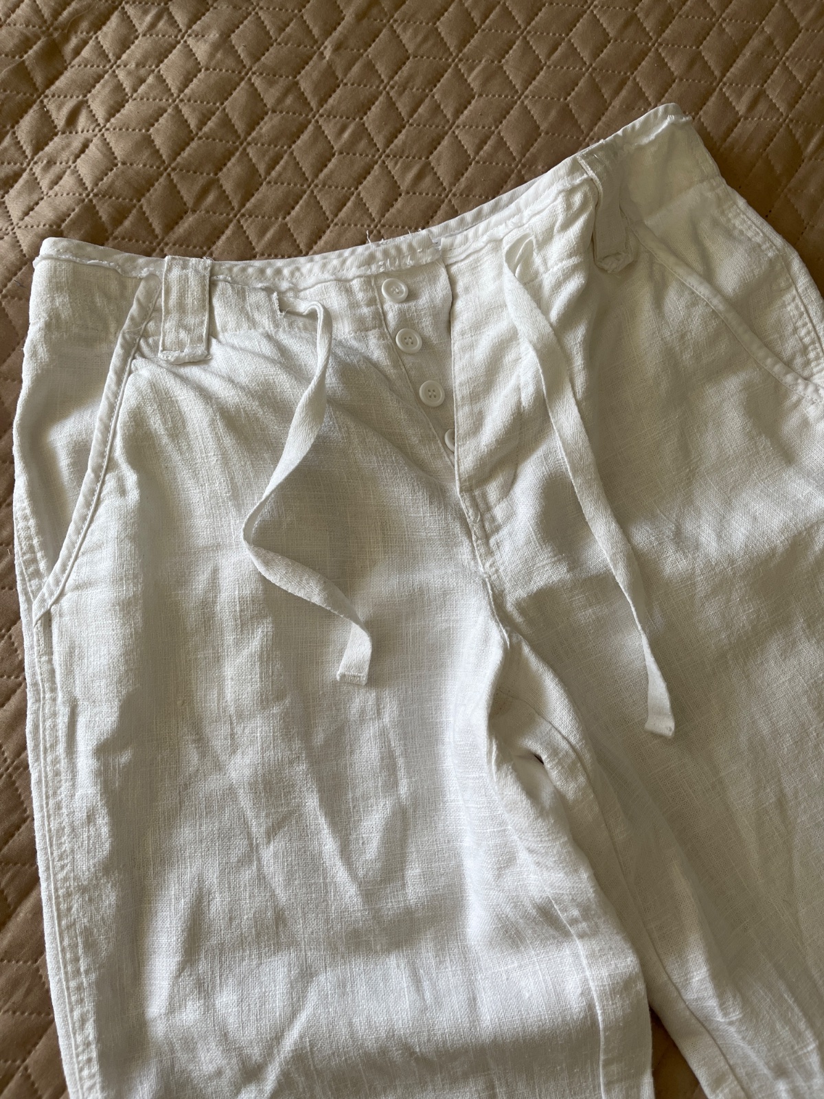 Pas 40, dlzka 80, sed normalny nie nizky, sirka nohavice 29-30, 100 ./. Lan… kupovane v zahranici, velmi kvalitny lan aj vypracovanie, boli drahe no su male preto posuvam dalej, cena 20 plus posta
