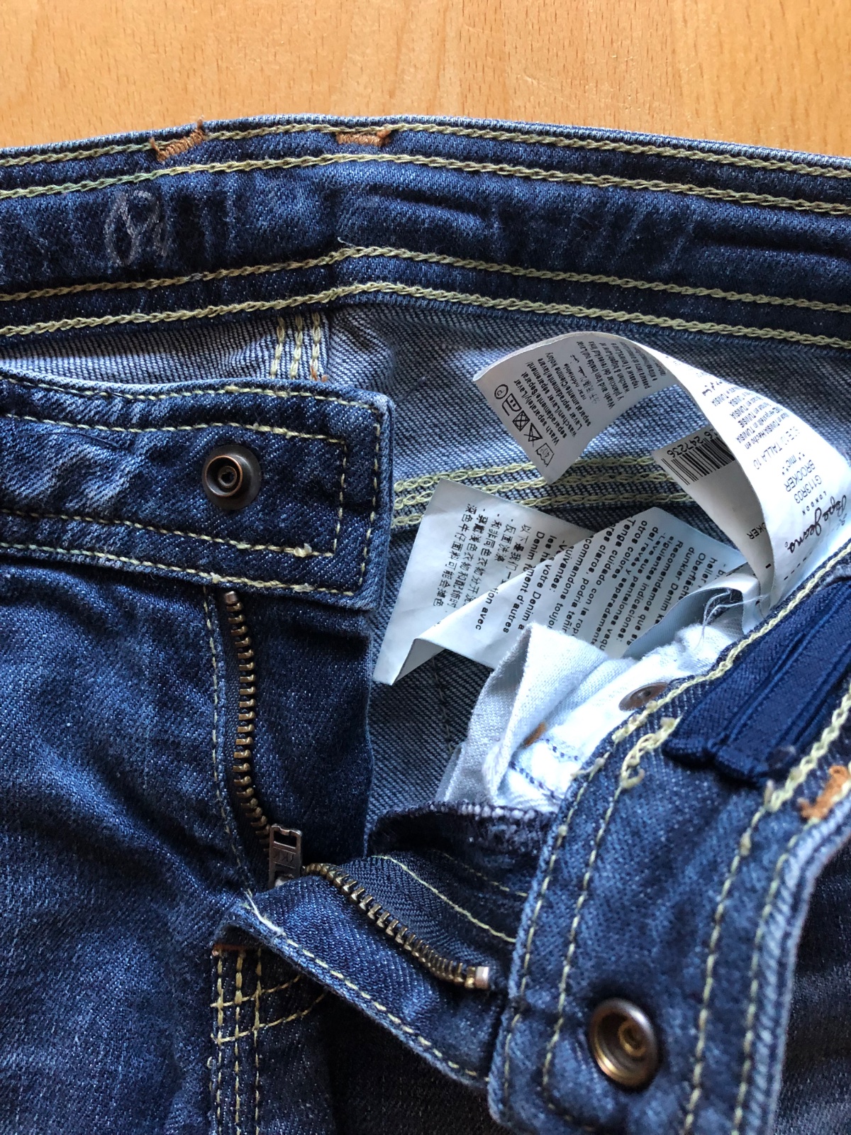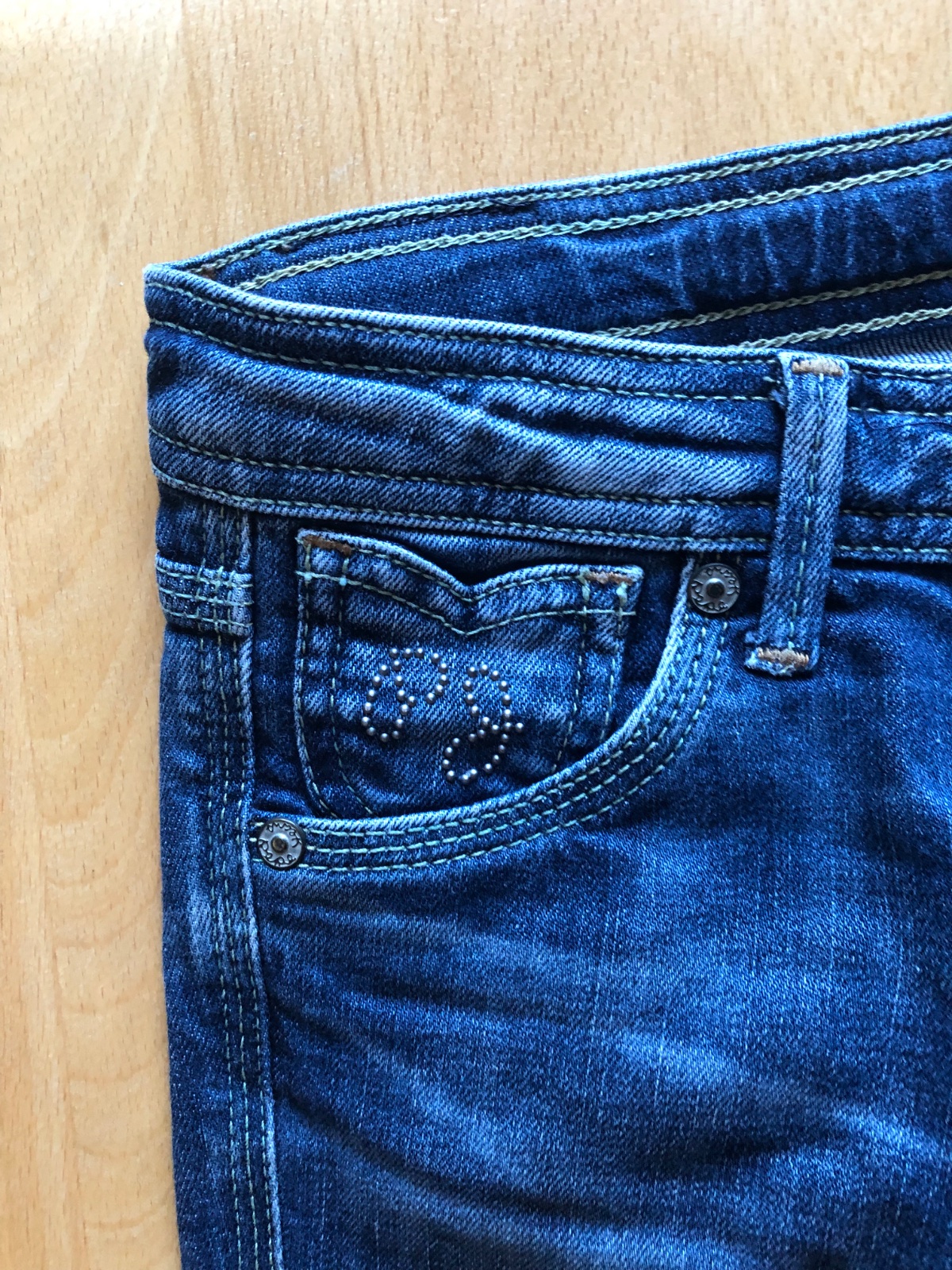Vysuchane tmavomodre rifle. Zaujimave detsily. Sitie podlz nohavic. Trblietky. Bez poskodenia. Velmi dobry stav.
