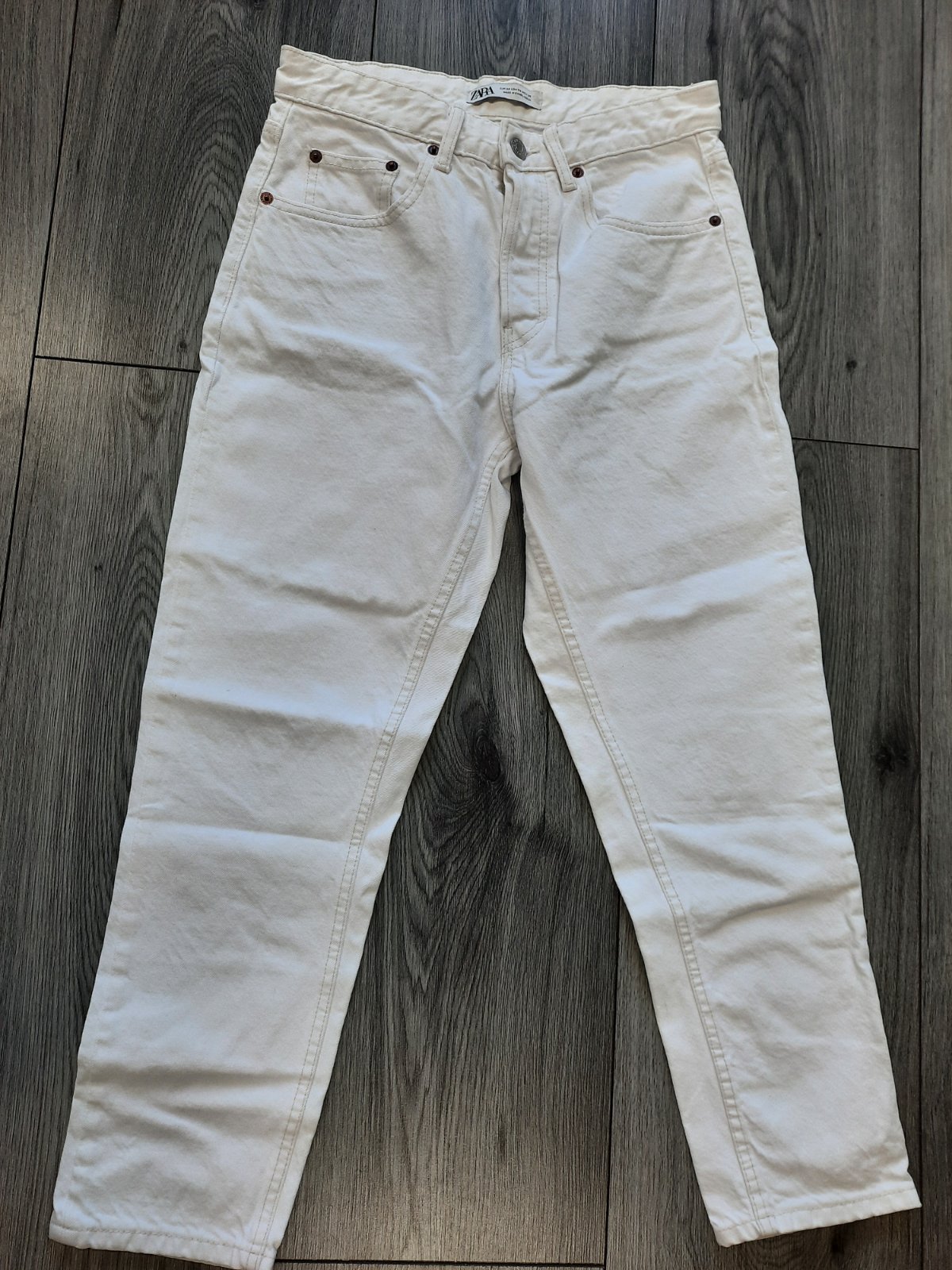 Biele rifle Zara veľ 38….. nosené v peknom stave….miestami vyšúchané do dier. Pás 2x38 cm bočná dĺžka 93 cm, pružné povolia. Poštovné 2,80€