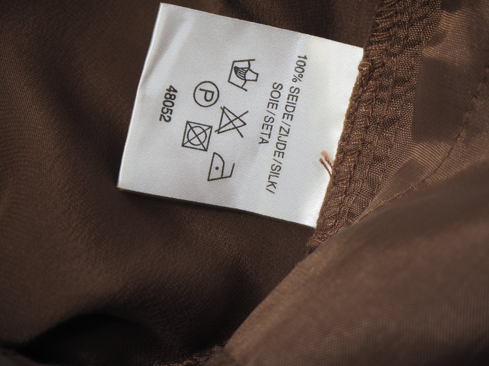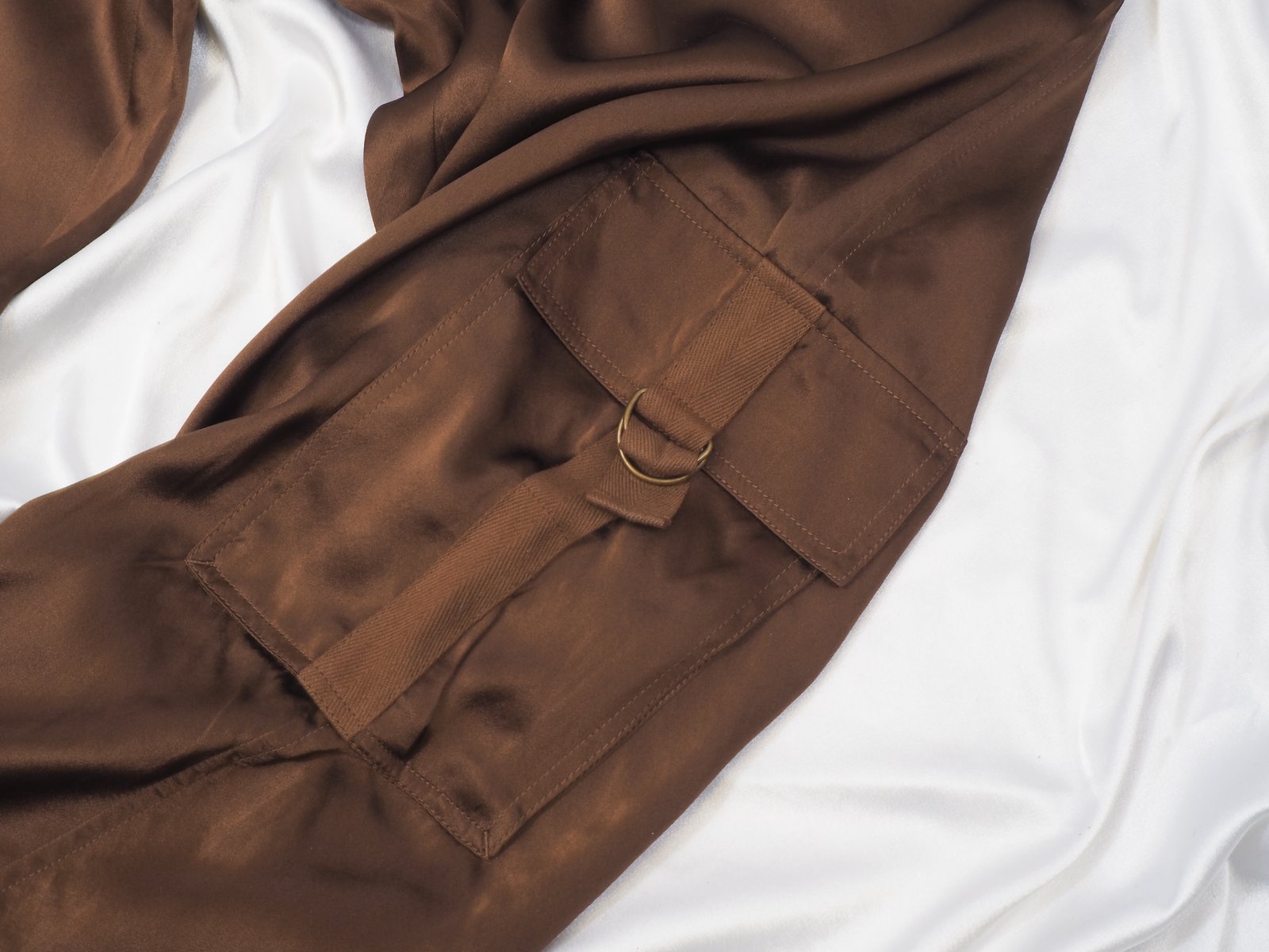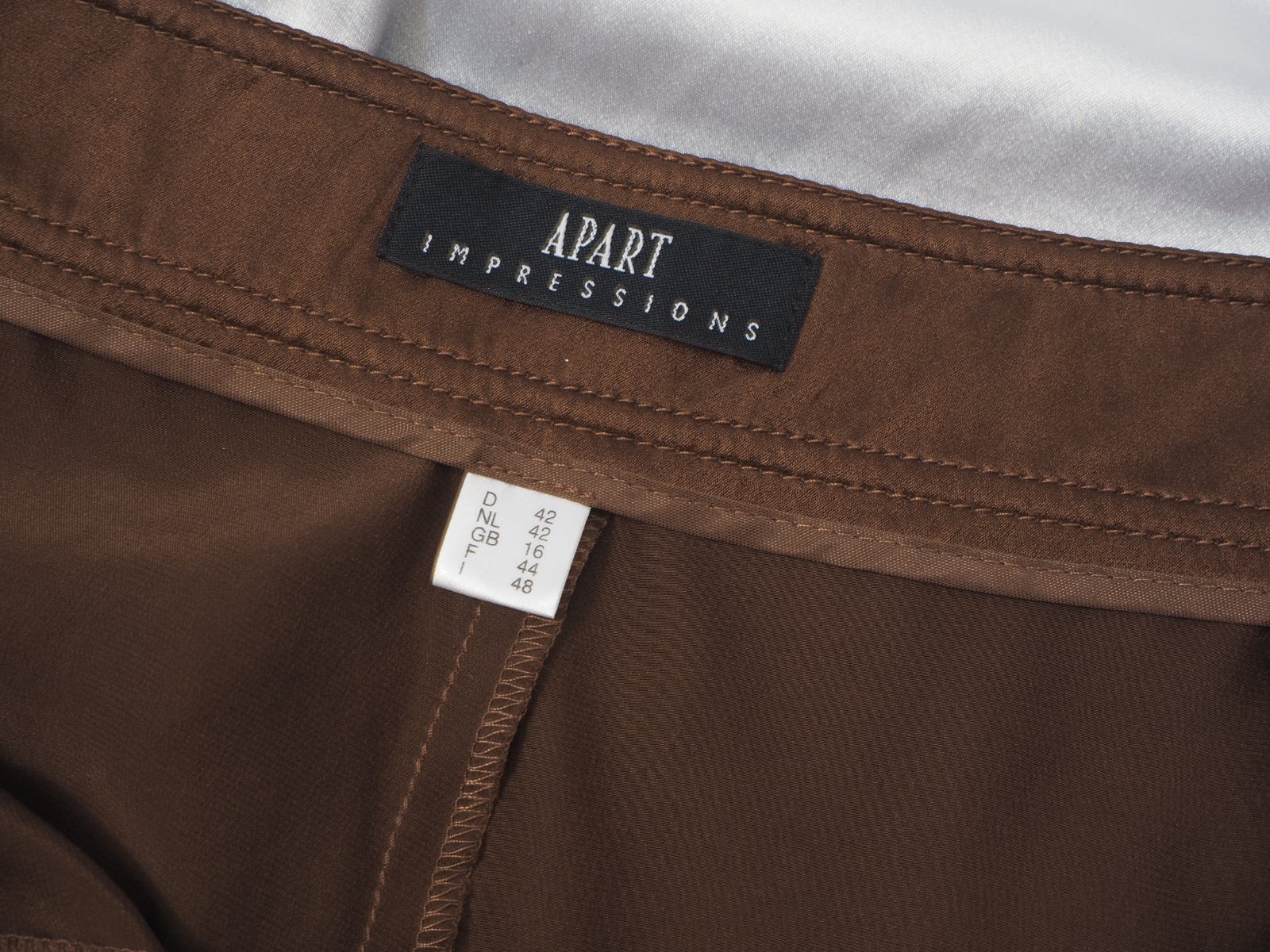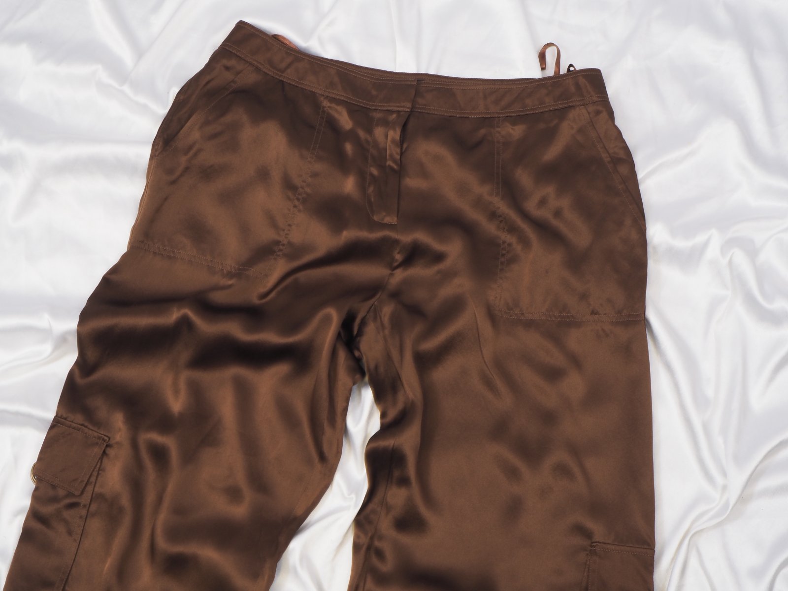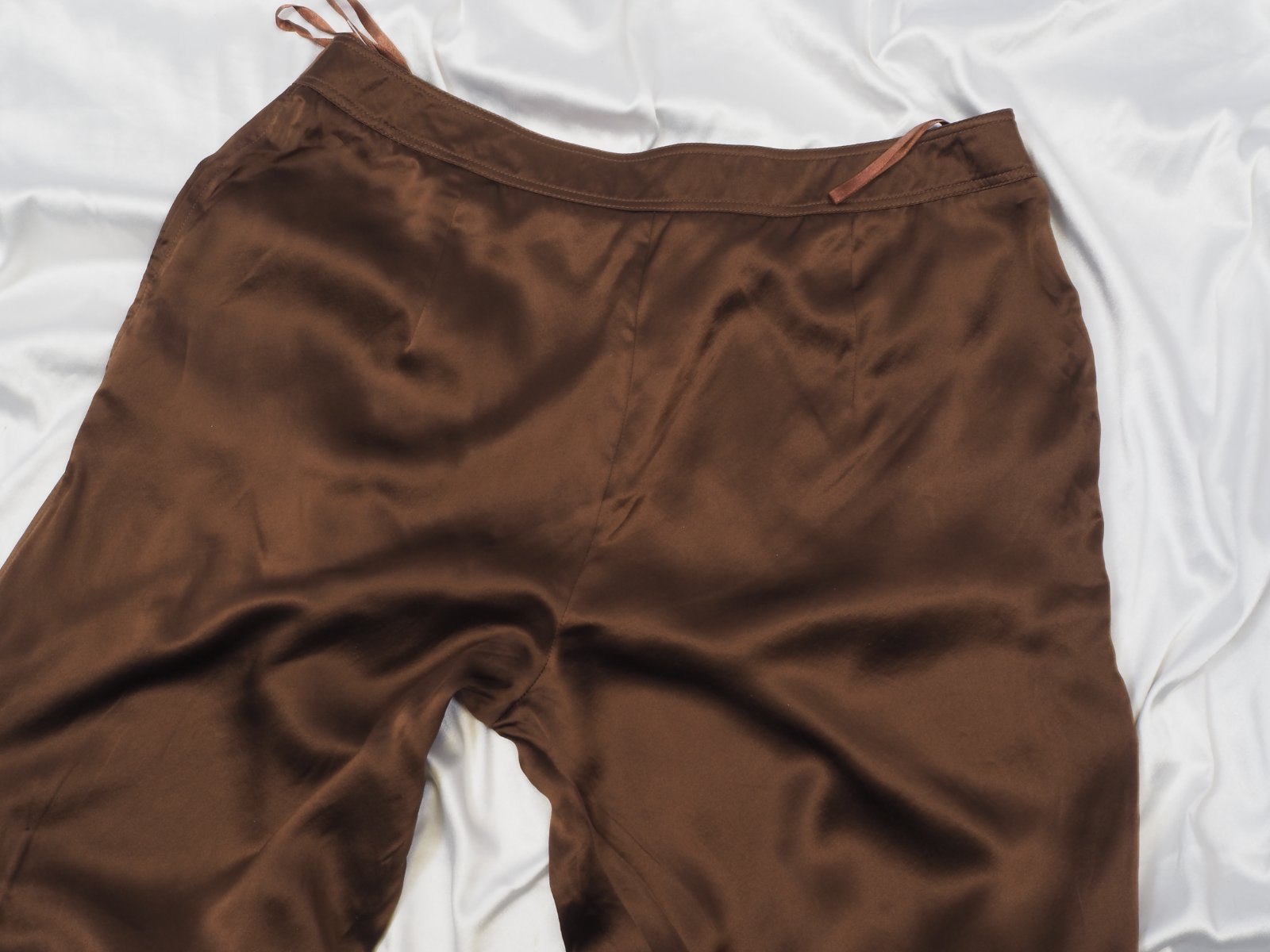 Luxusné hodvábne nohavice, tmavohnedej farby, zapínanie na zips a gombík, materiál 100% hodváb, super stav.