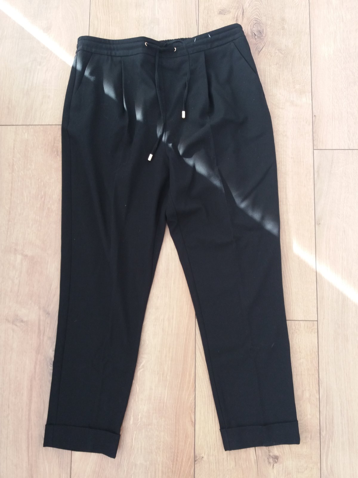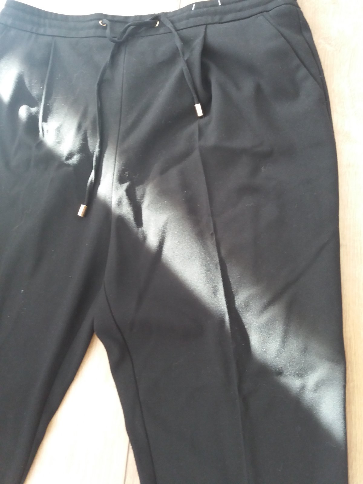 Predám dámske čierne nohavice značky F&F . Nohavice majú vpredu pevný pás, a v zadnej časti majú gumu, takže sa vedia prispôsobiť postave. V páse sa uväzujú na šnúrku so striebornými detailami.