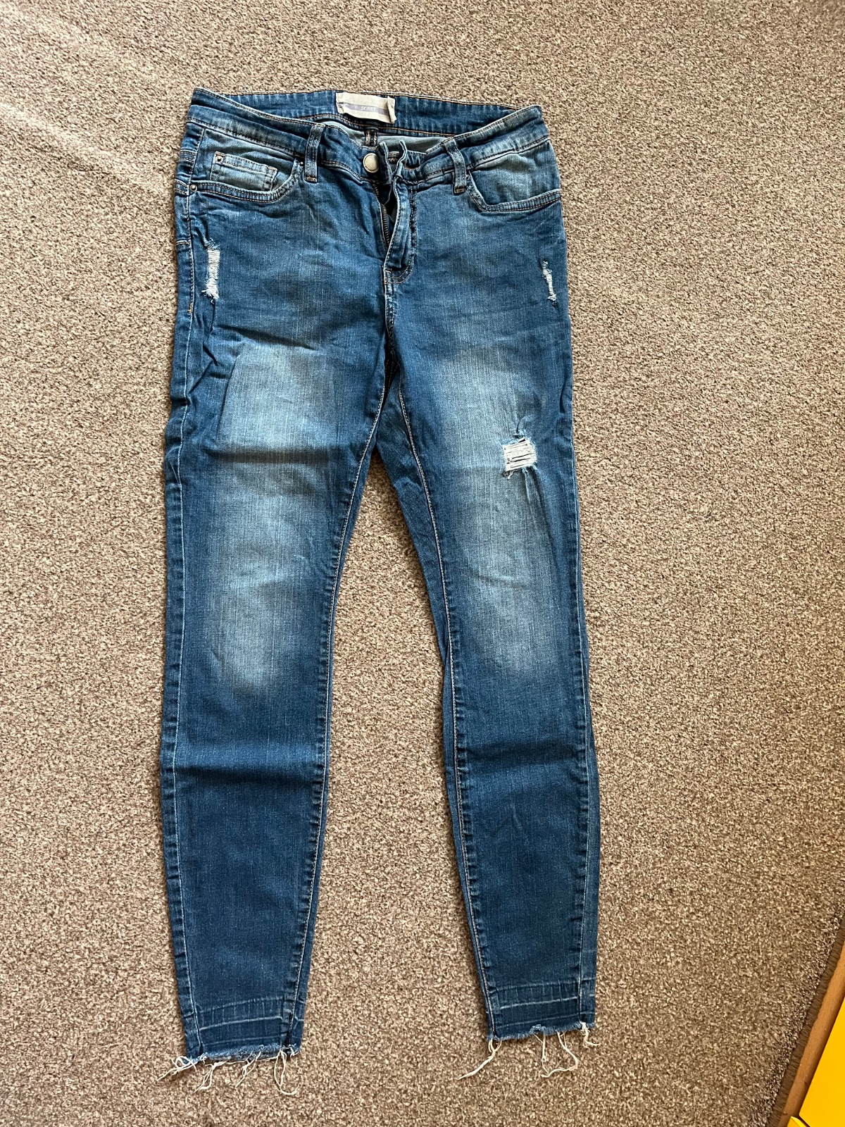 Krásne nové rifle s visačkou a vysokým pásom. Sú vysoko elastické, krásne obopnú a stiahnu postavu. Veĺkosť uvedená XL, ale skôr S-M, možno menšie L. pás v klude =:34cm ( veĺa sa natiahne) šírka h...