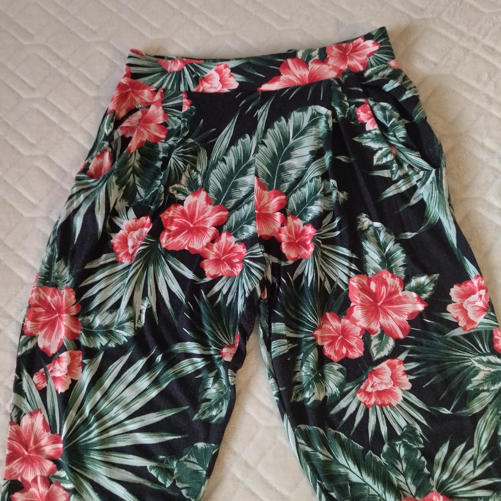 1-krát oblečené, kvety sú červenej farby. Písaná vełkosť 34, ale prispôsobia sa. Sú na gumu, vhodné na leto