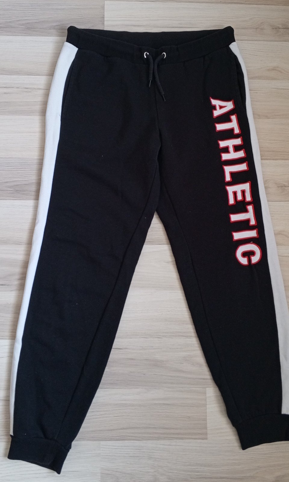 málo nosené tepláky, bočný pás zvláštny material podobný koženke, iba mierne žmolčeky S-M, bočná dlžka 105 cm, predný sed 24 cm, zadný sed 30 cm , pás 33 cm , natiahne sa na 44 cm, naozaj pekné