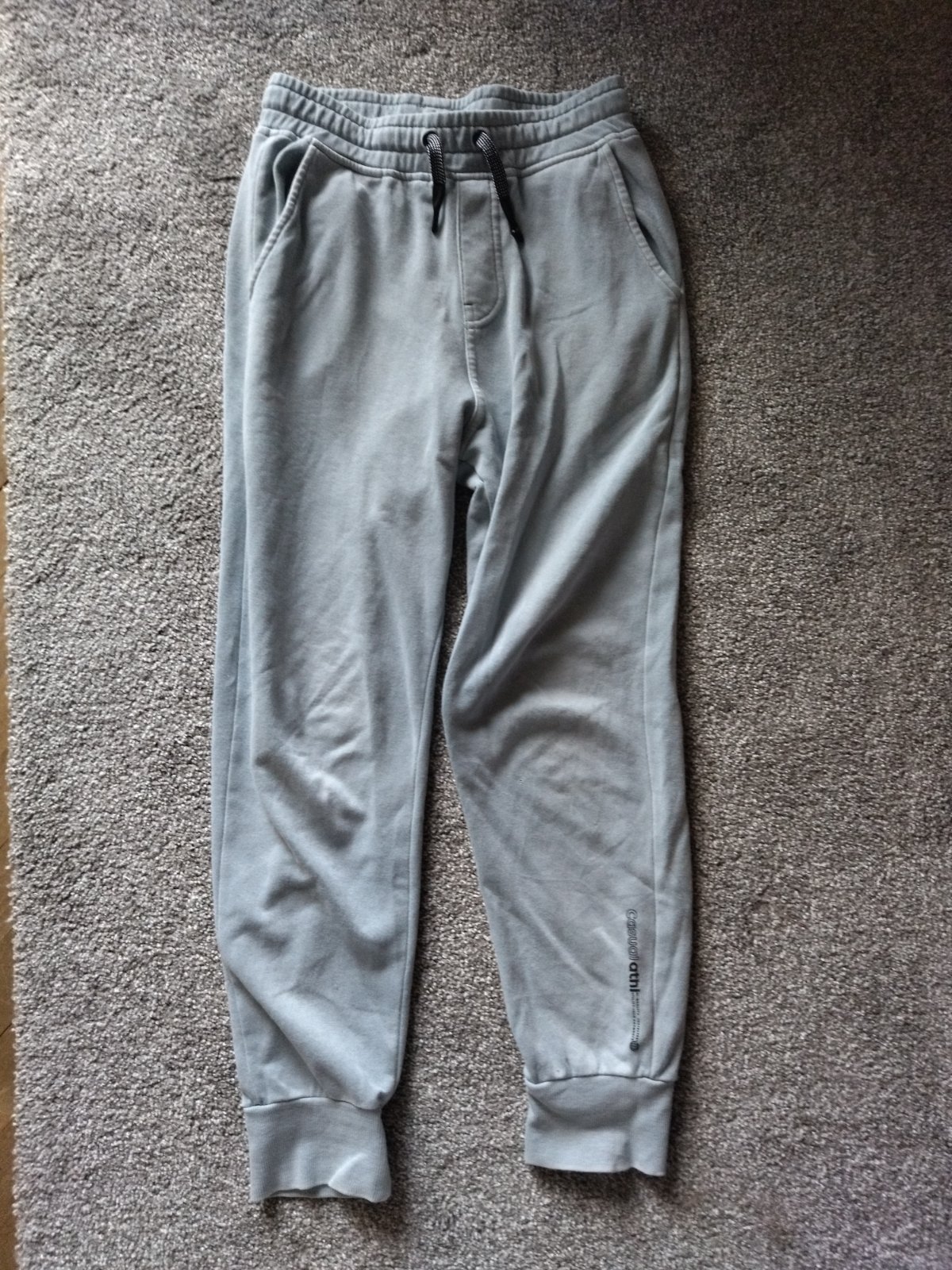 Hrubšie tepláky, super nosený stav, v páse hrubšia guma a funkčná šnúrka, majú trochu ušpinené kolienka, možno zíde po viacerých praniach, cena prispôsobená Veľkosť 146-dĺžka 82/61cm, pás 33*cm B1