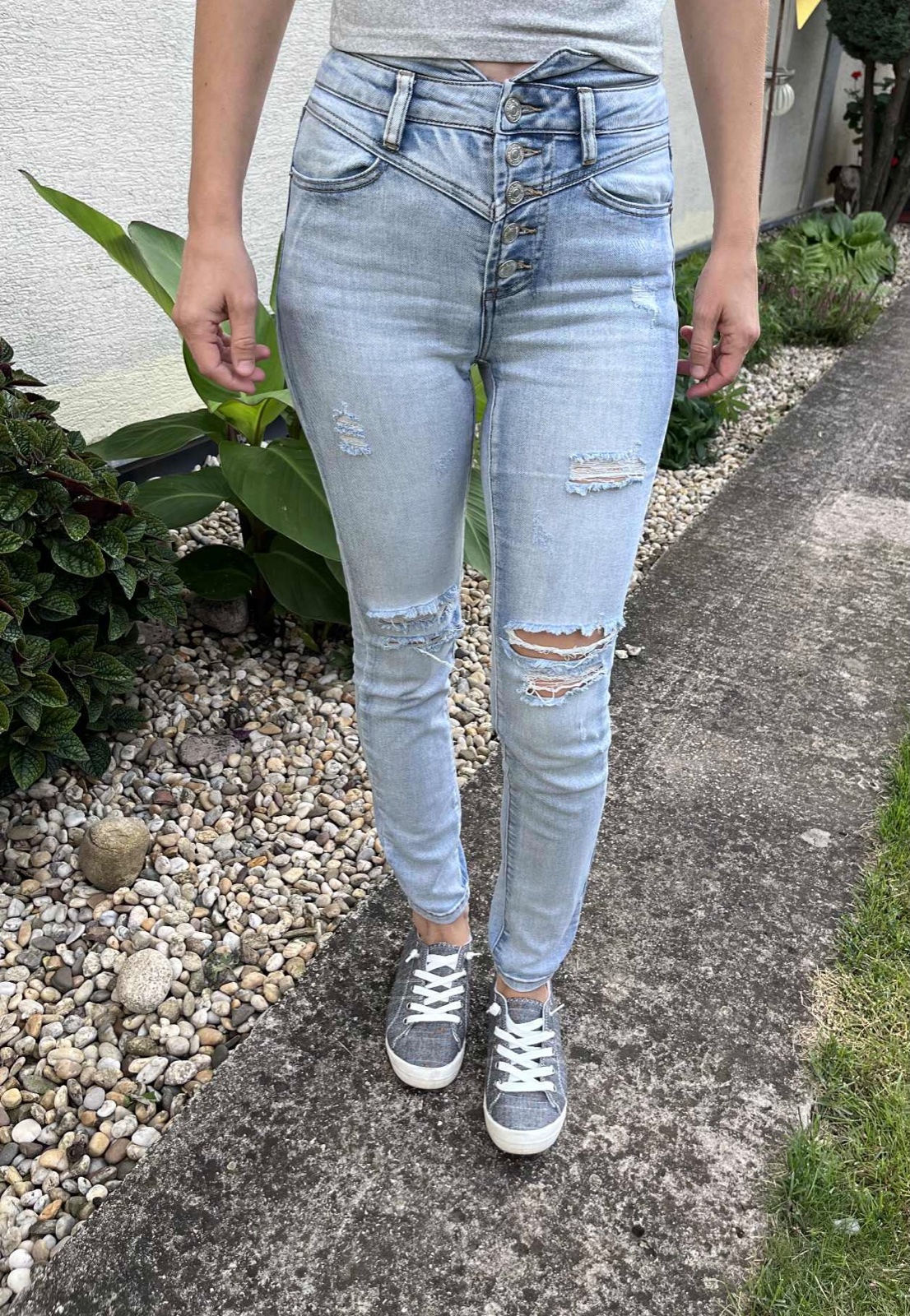 Roztrhané džínsy s vysokým pasom