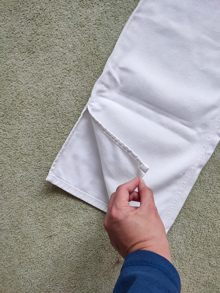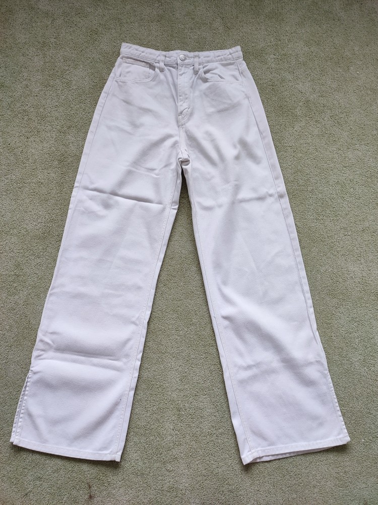 široké tenšie rifle s vysokým pásom, nastaviteľný pás gumičkou. v super stave bez akýchkoľvek poškodení, takmer nenosené. ideálne na jar / leto.