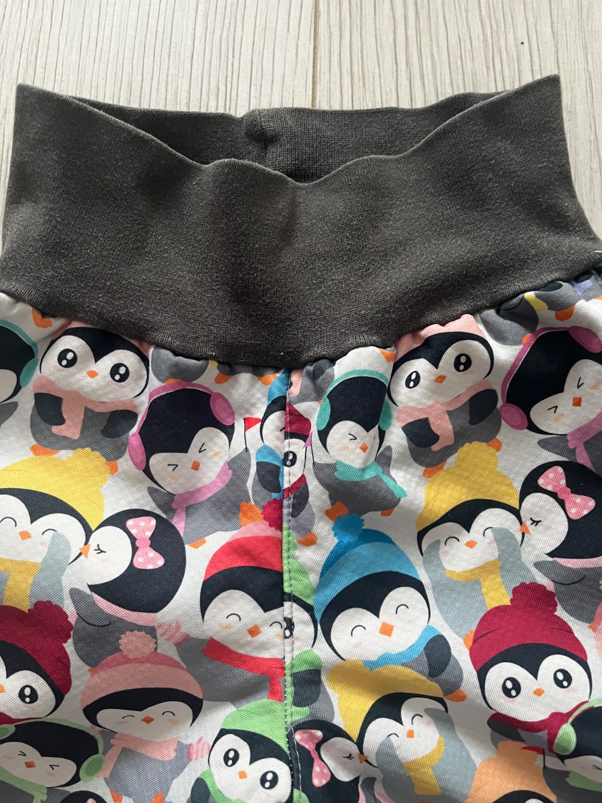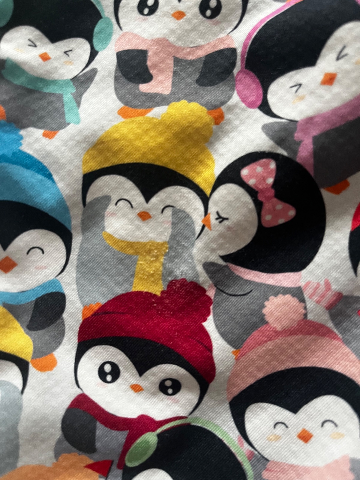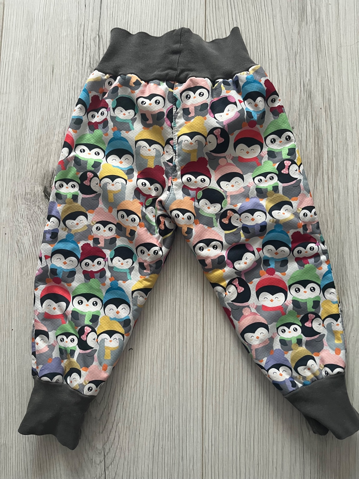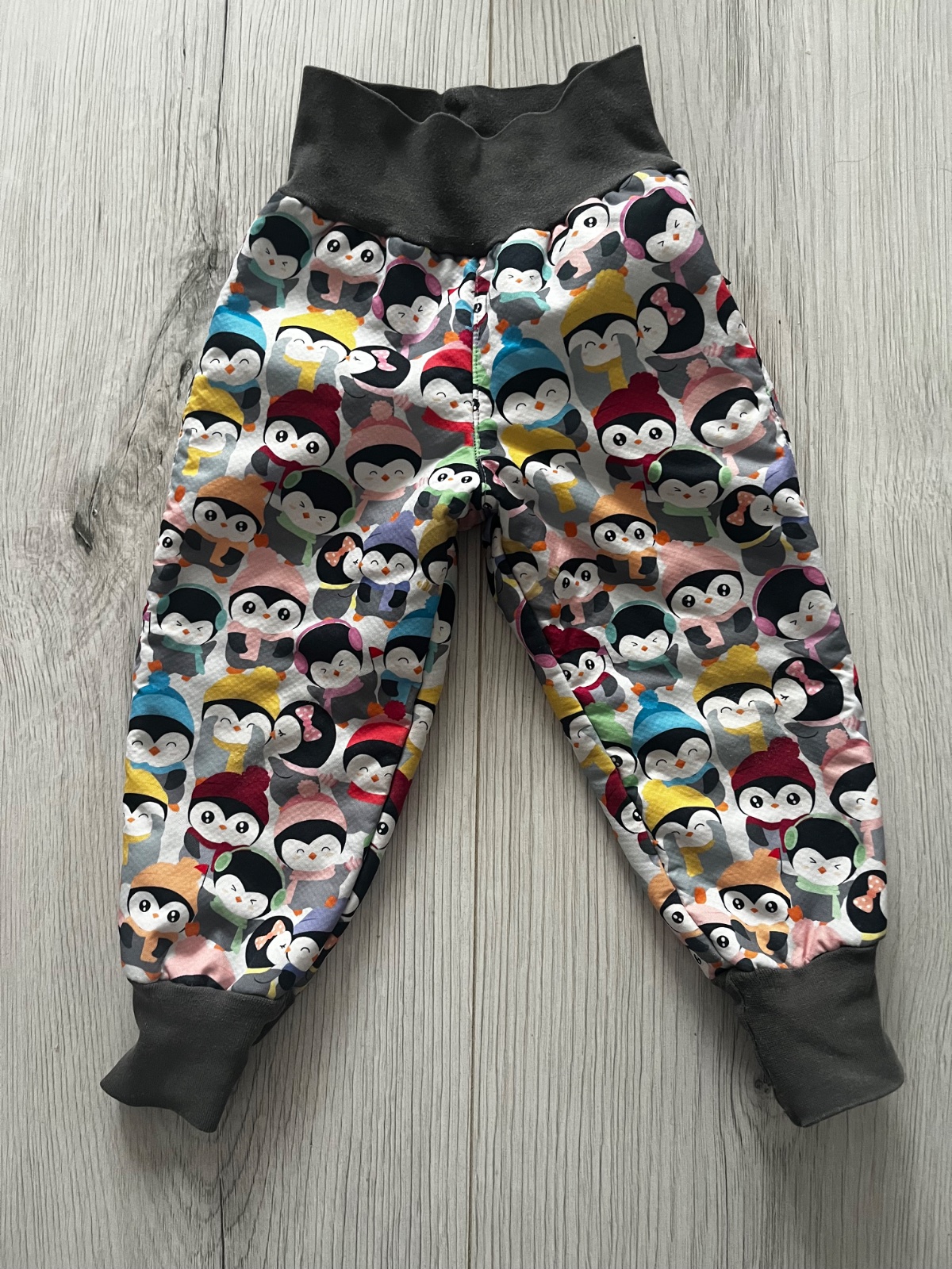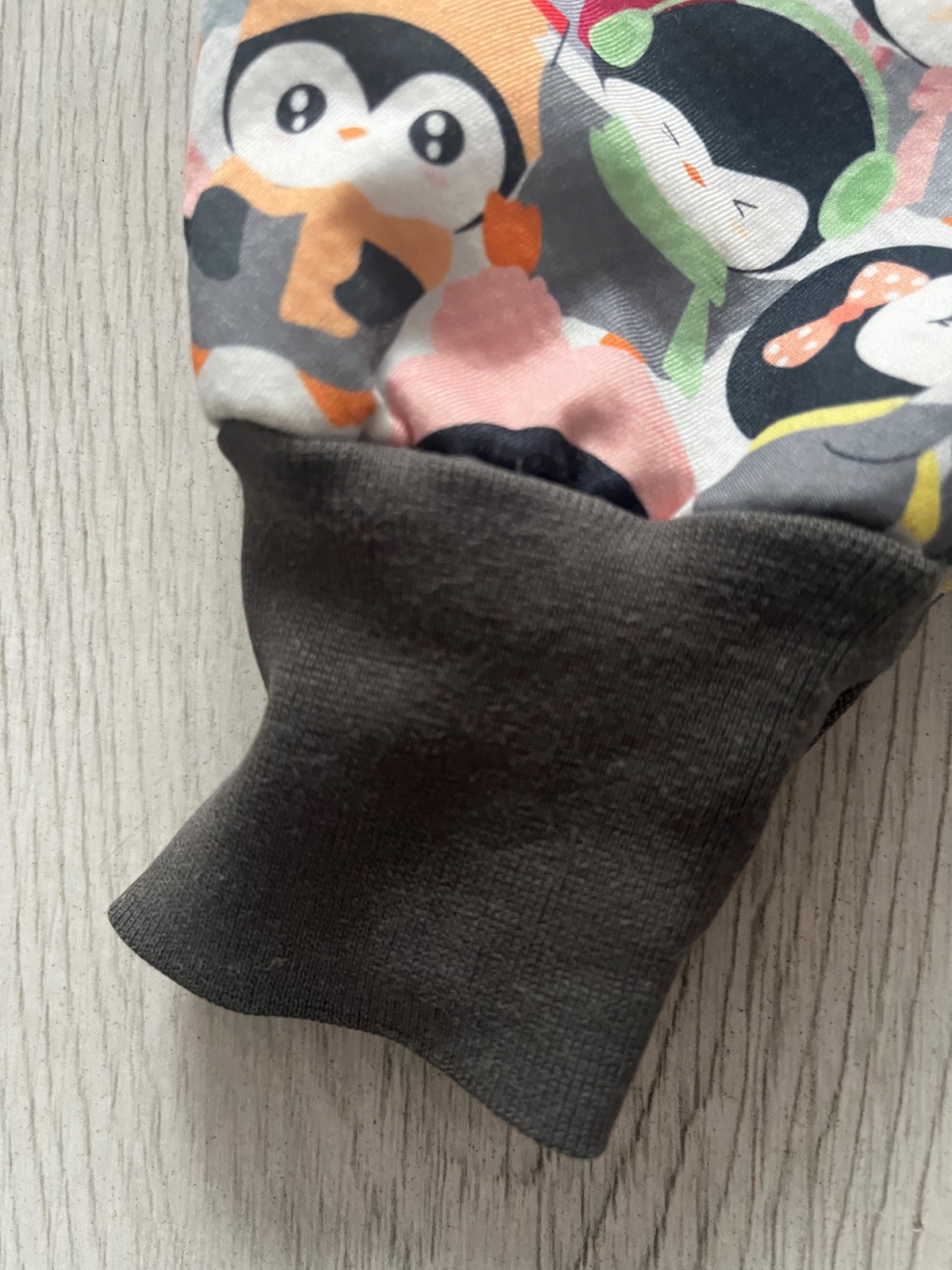 Predám rastúce softshellové nohavice zateplené barančekom so vzorom tučniakov s farebnými šálmi a ciapkami. Farba patentu: šedá. Mierne známky nosenia na kolenách a patentoch. Značka: kiwi, veľkosť: 80-86