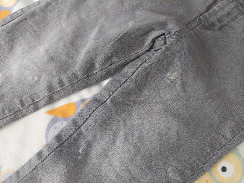 V super stave, akurát vzadu na stehne v látke malá čierna nitka (vid.foto), inak bez poškodení. Vpredu jemný vzor lístkov v látke.