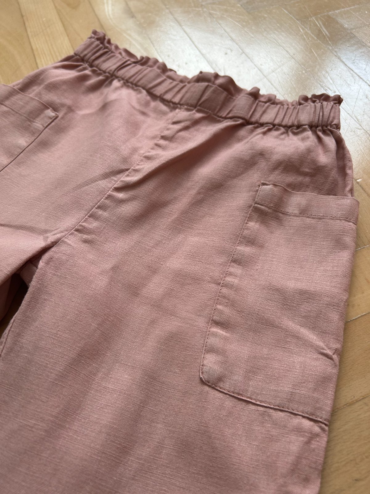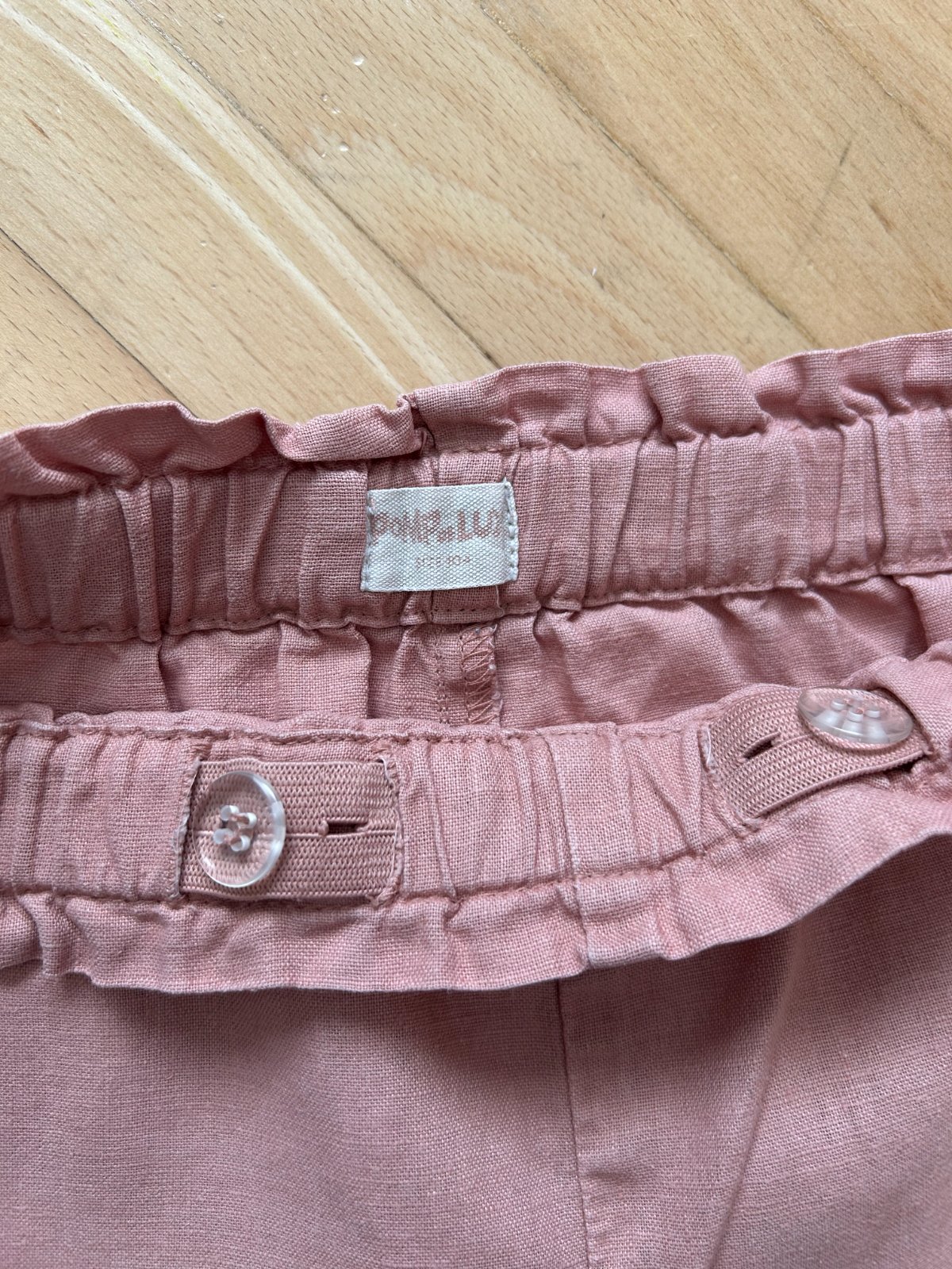 Ružové ľanové nohavice značky Pompdelux na leto, regulácia v páse