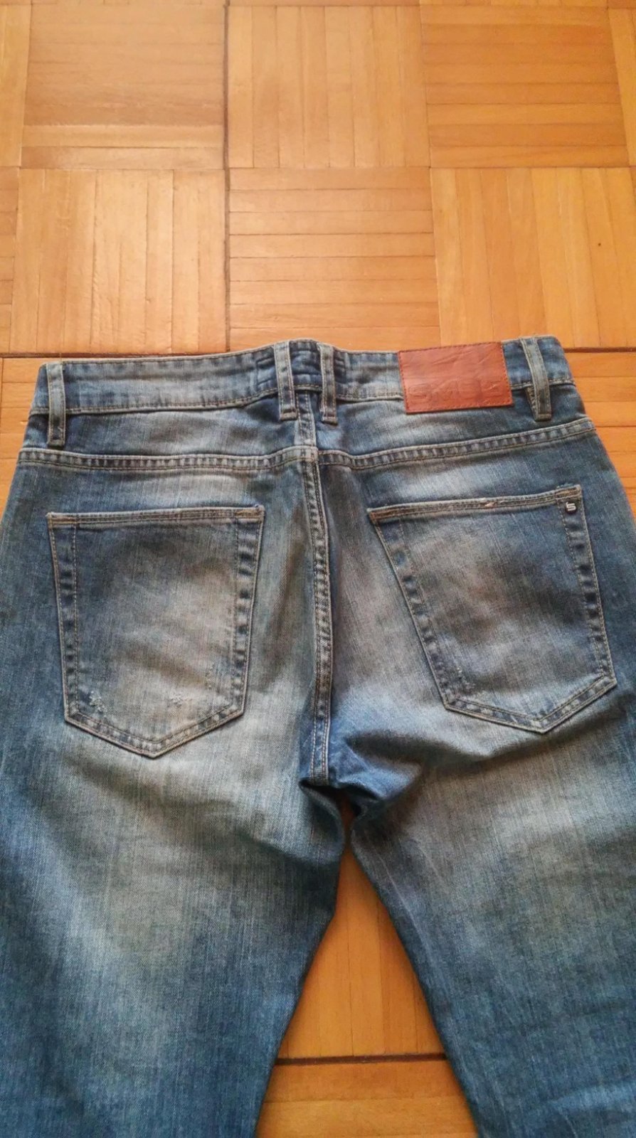 Veľmi pekné nové rifle, nosené asi raz. Kúpili sme, žiaľ, malú veľkosť. Pevnejšia džínsovina, strih Baggy, svetlo modrá farba