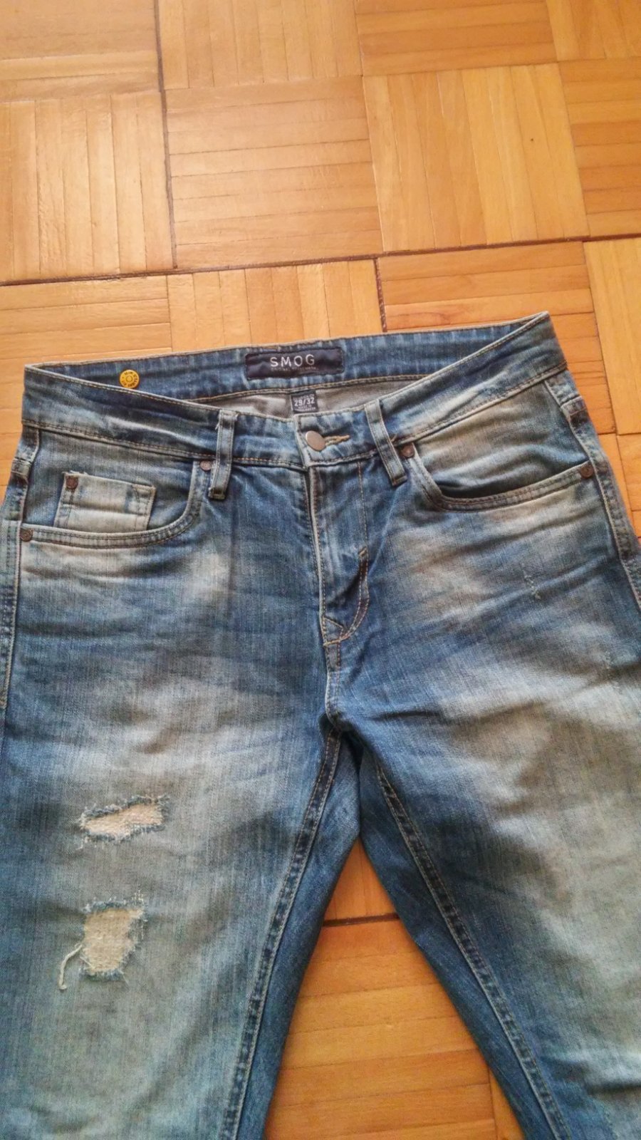 Pánske rifle, nosené, bez dier a flakov, akurát sú na jednej na spodku roztrhané. Písaná veľkosť 29/32. Rozmery : celková dĺžka 110 cm, pás 37 cm stehno 28 cm. Nie sú elastické.