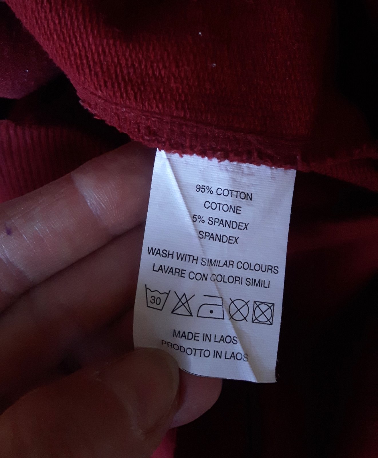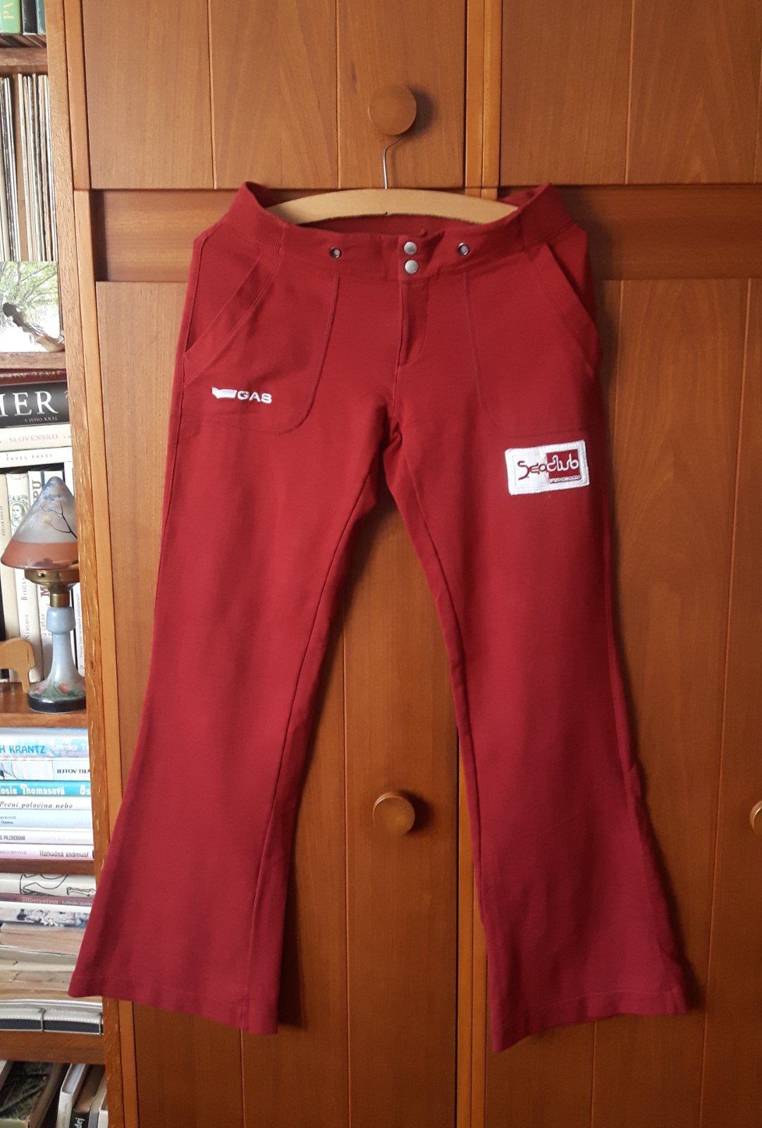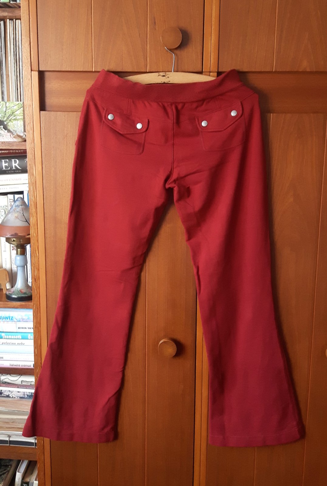 Bavlnené červené (vínové) teplákové nohavice dĺžky 97 cm a šírky v páse 38 cm (v kľude), ale inak je pás na gumu, takže sa dobre prispôsobia veľkosti;). Veľkosť S, ale myslím, že budú fajn aj M. Bez poškodení!