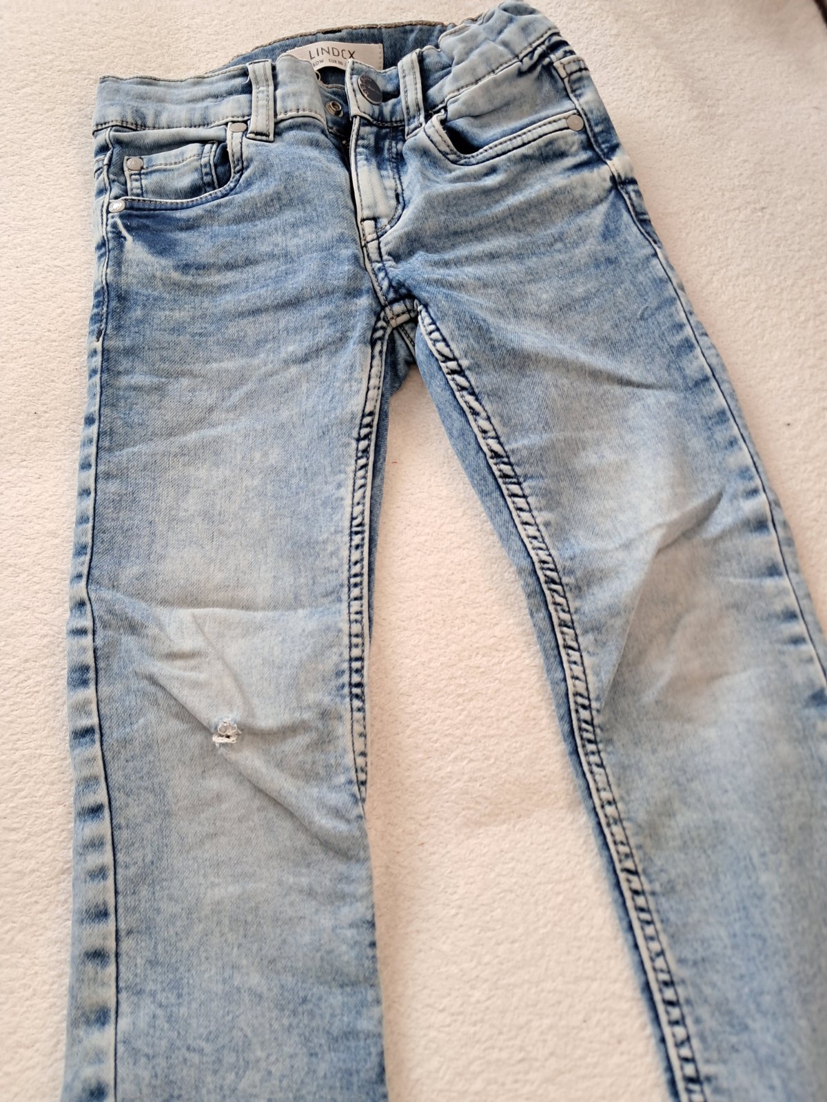 Rifle znacky Lindex. Velmi prijemny material, poddajna, makka riflovina. Nastavitelne v pase. Na chudu postavu krasne sadnú. Velkost 110. Dierka na kolene vyzera este viac frajersky.