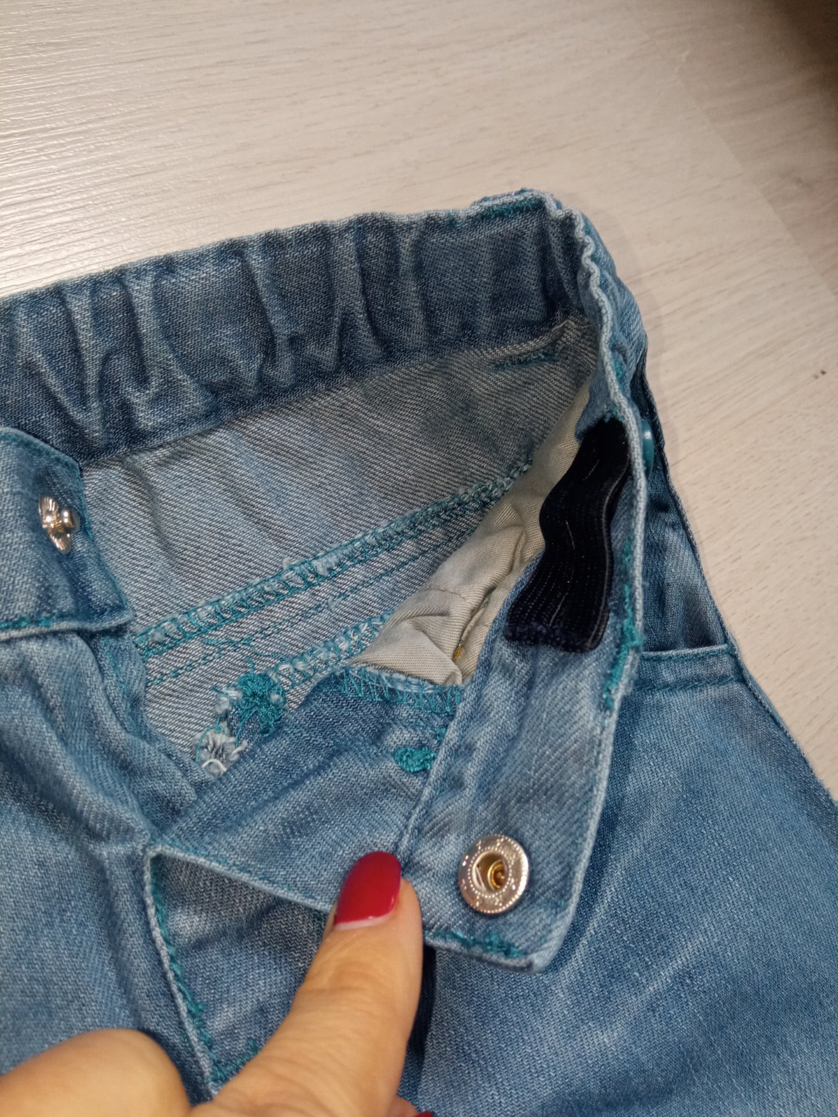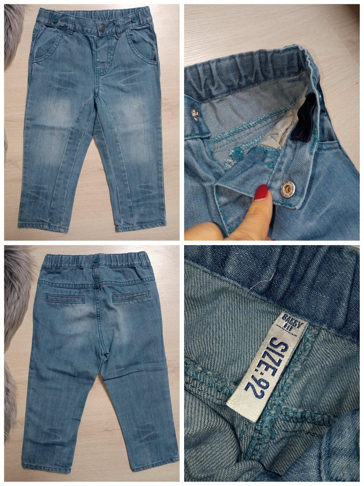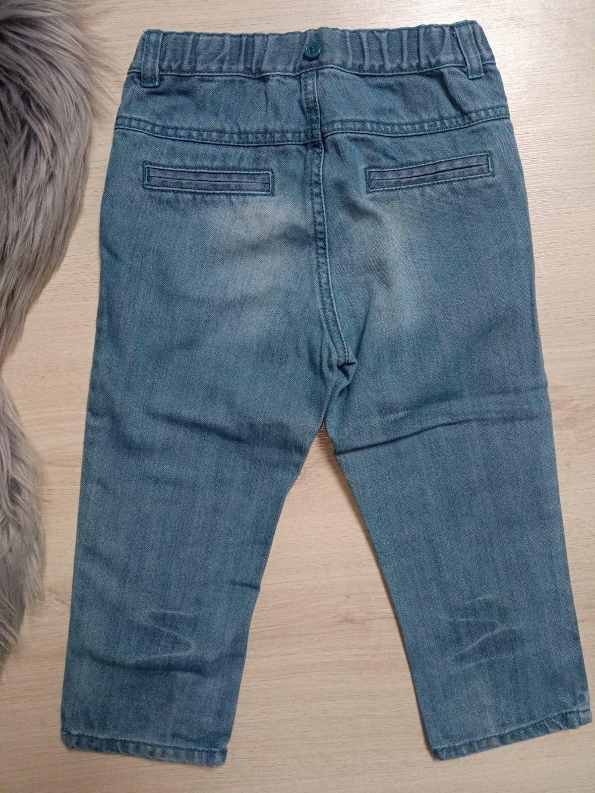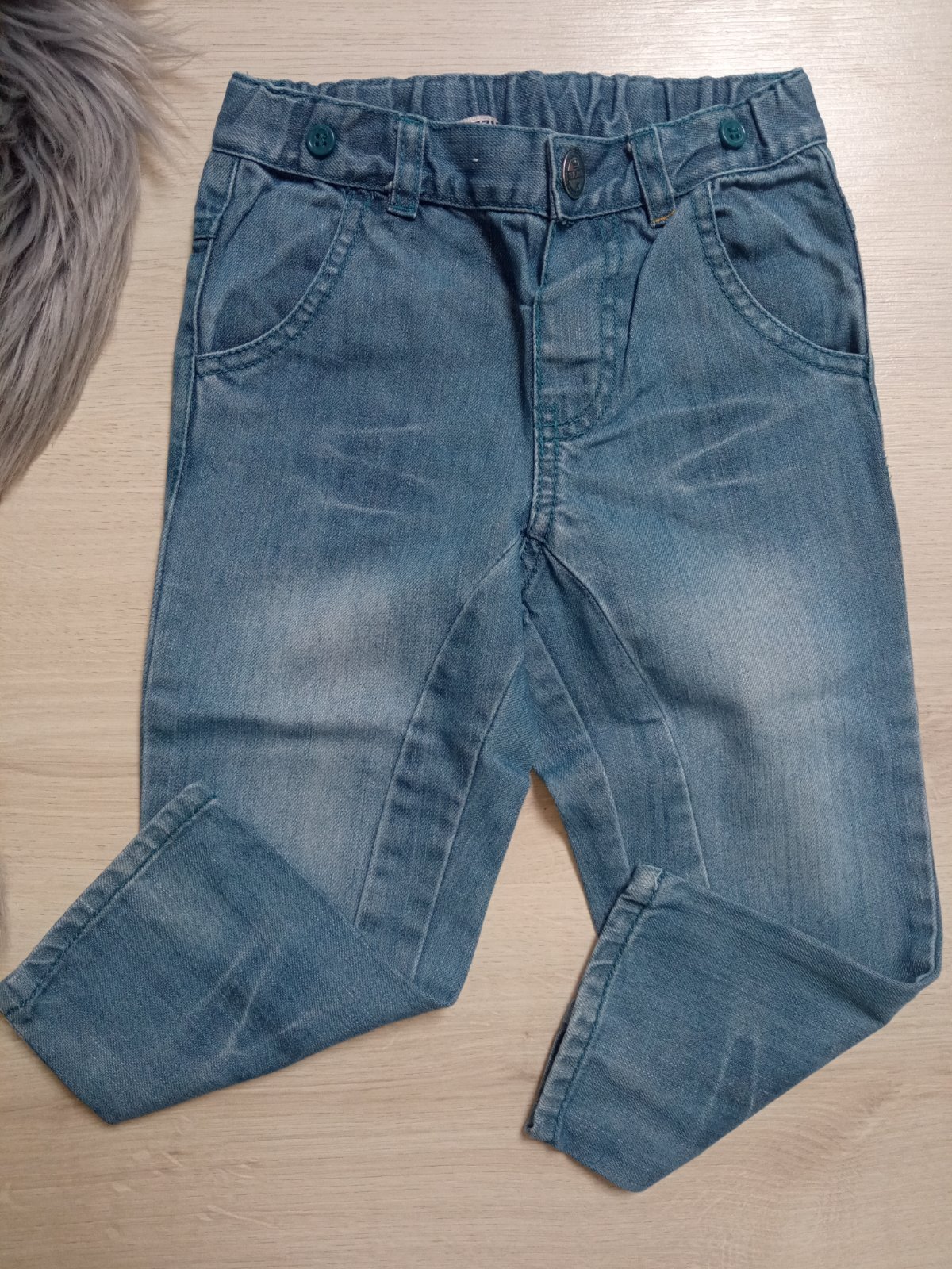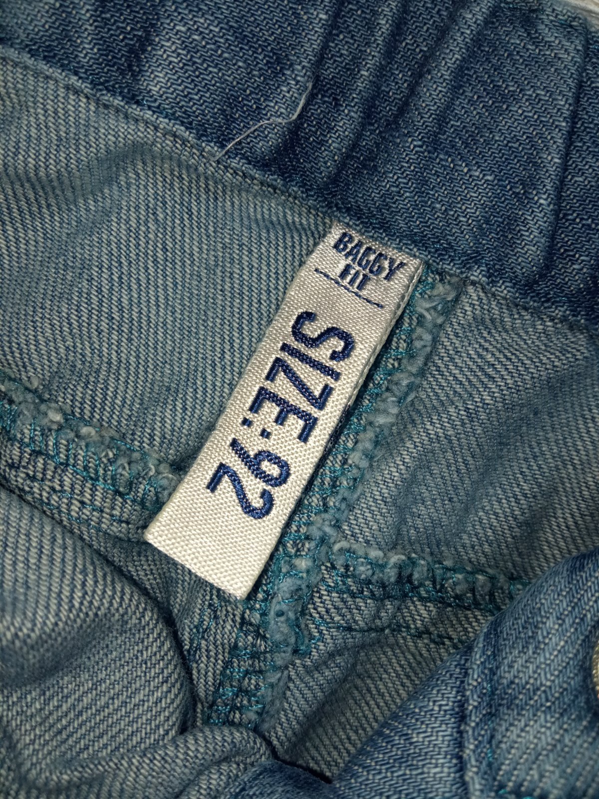Chlapčenské rifľové nohavice s nastaviteľnou gumou v páse. Tenké. Nie sú elastické. Veľkosť:92. Materiál: 100%bavlna.