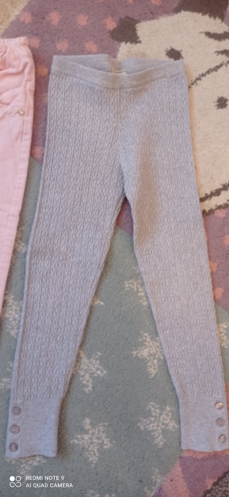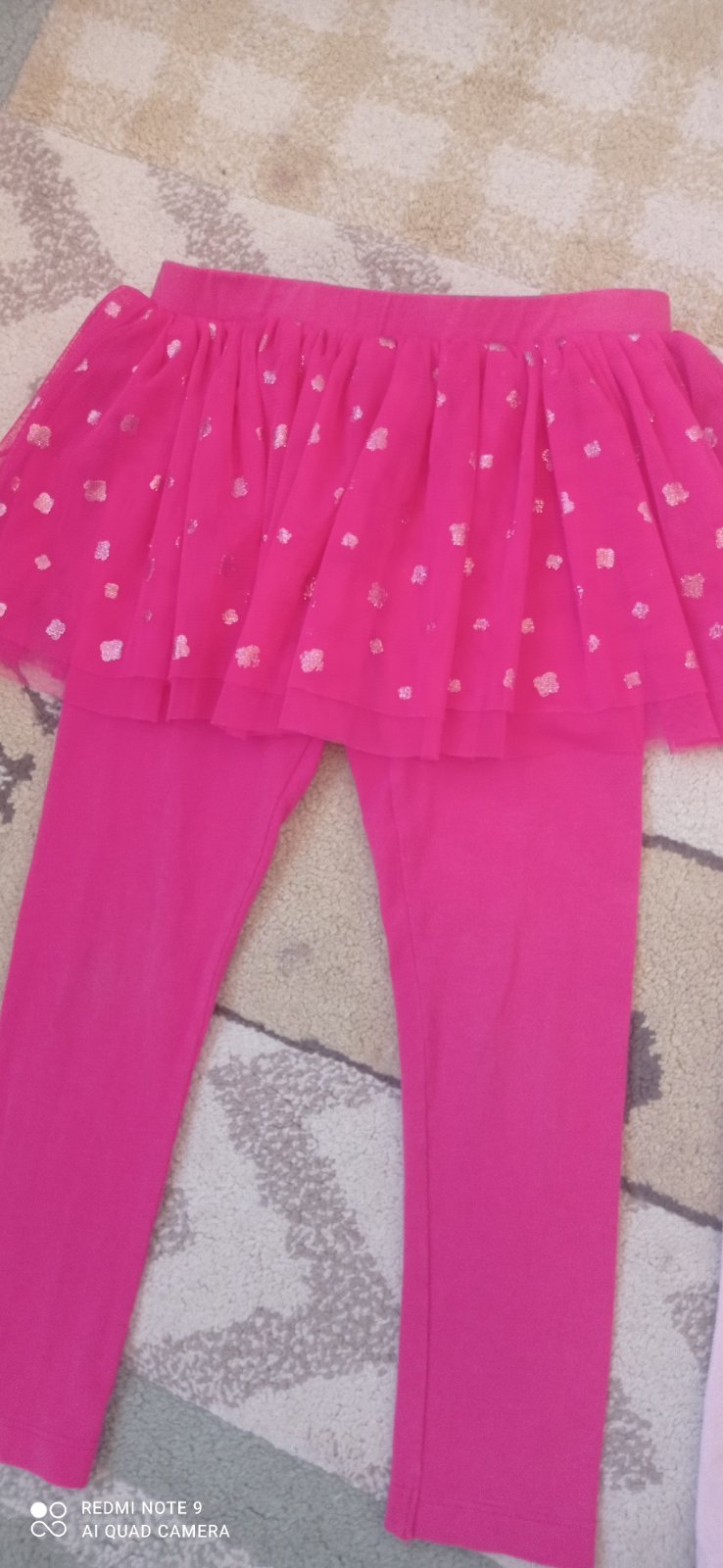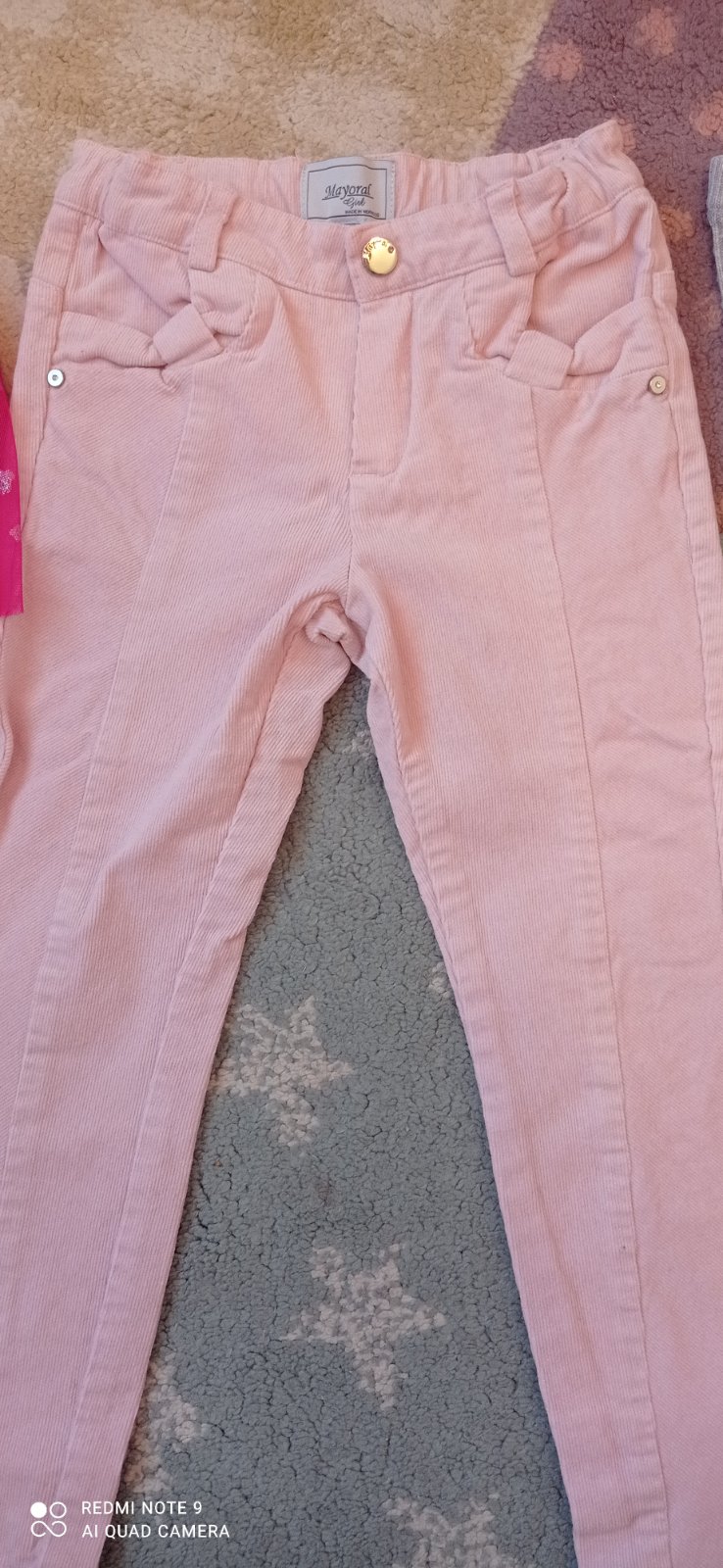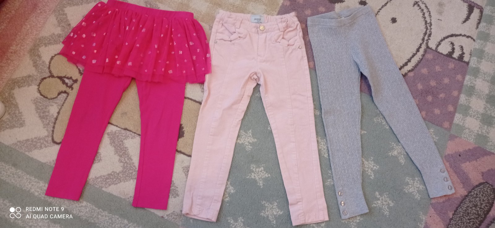 Nohavice 100 %stave. Pudrové ružové nikdy nenosené, je to elasticky mančester. Tutu ružove sú značky lupilu,2-3x nosené. Sivé elastické pletené,tiež mayoral. Spolu 6€